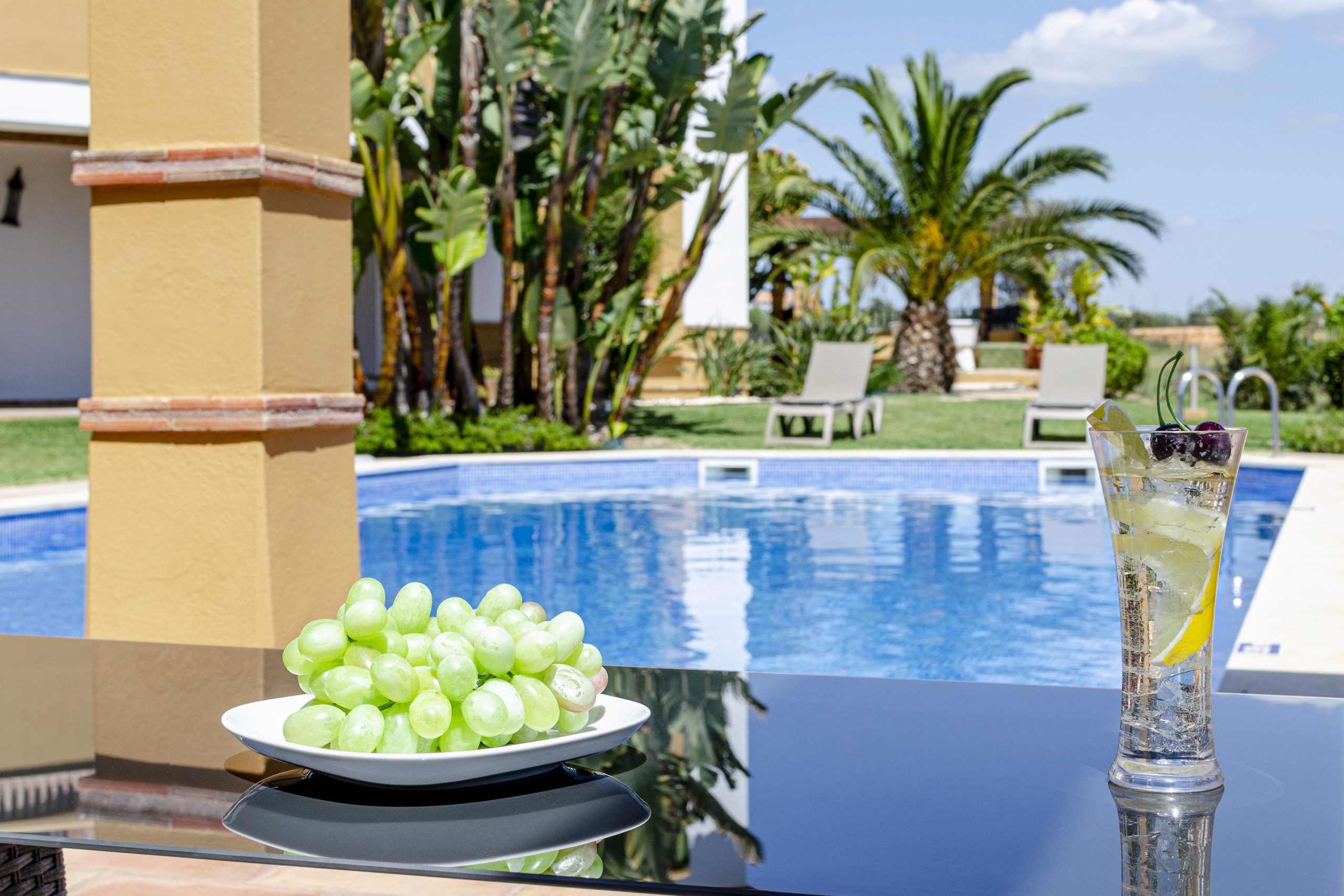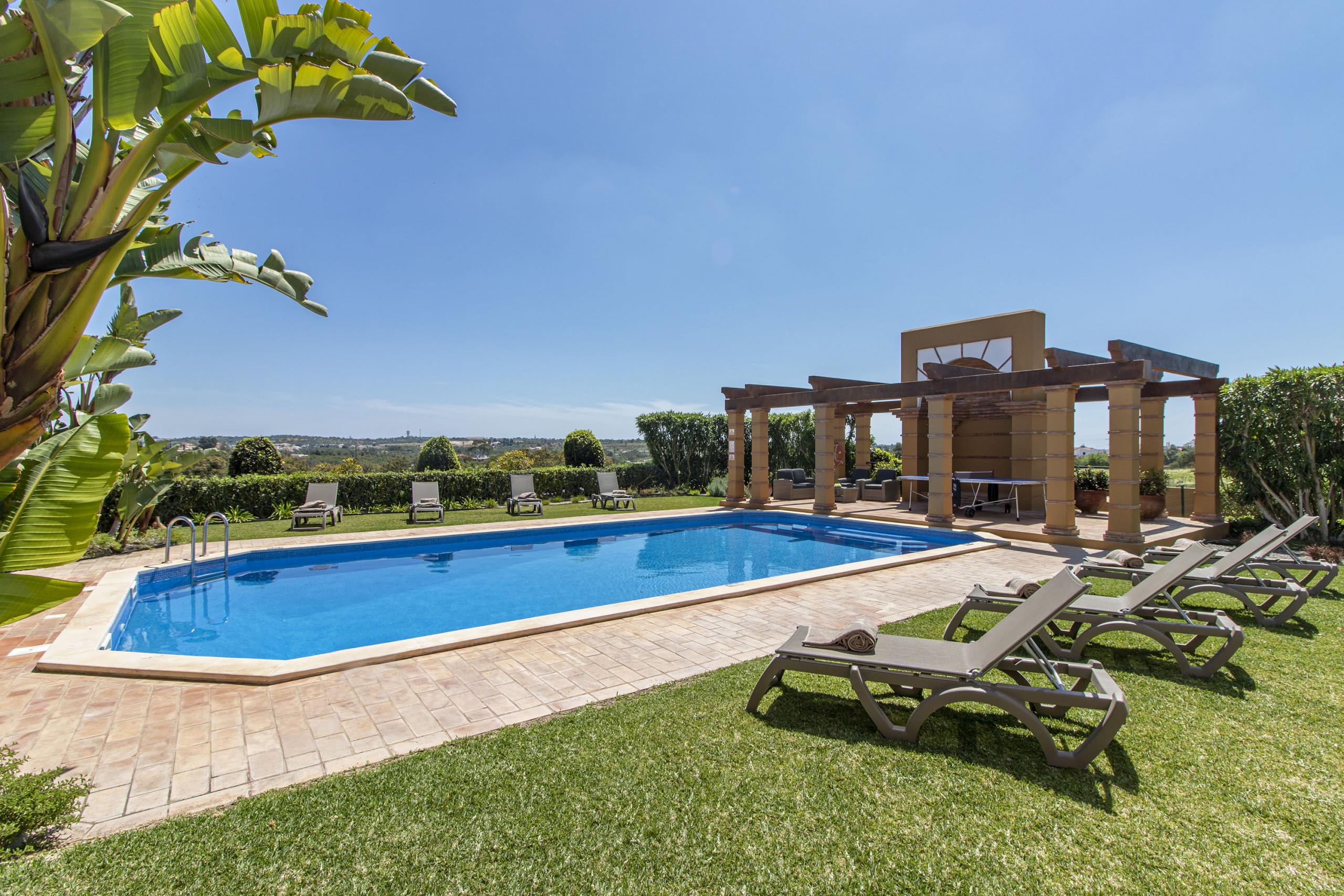 L'extérieur de la villa est magnifique, avec un immense vignoble, les nombreuses estrelícias et palmiers et l'herbe autour de la piscine lui donnent un air tropical, elle dispose d'une piscine d'excellentes dimensions, 12 mètres de long sur 6 mètres de large et de profondeur. entre 1 mètre et 2,2 mètres. La piscine a la possibilité d'être chauffée uniquement entre avril et octobre (moyennant un supplément).