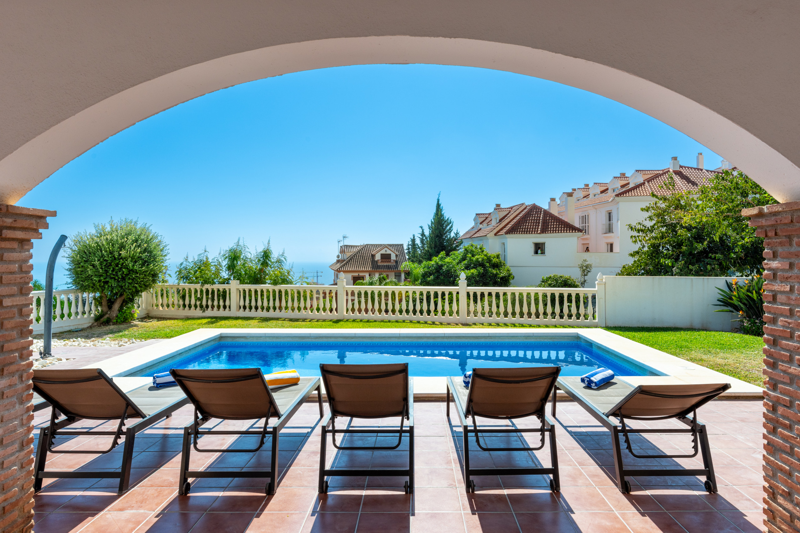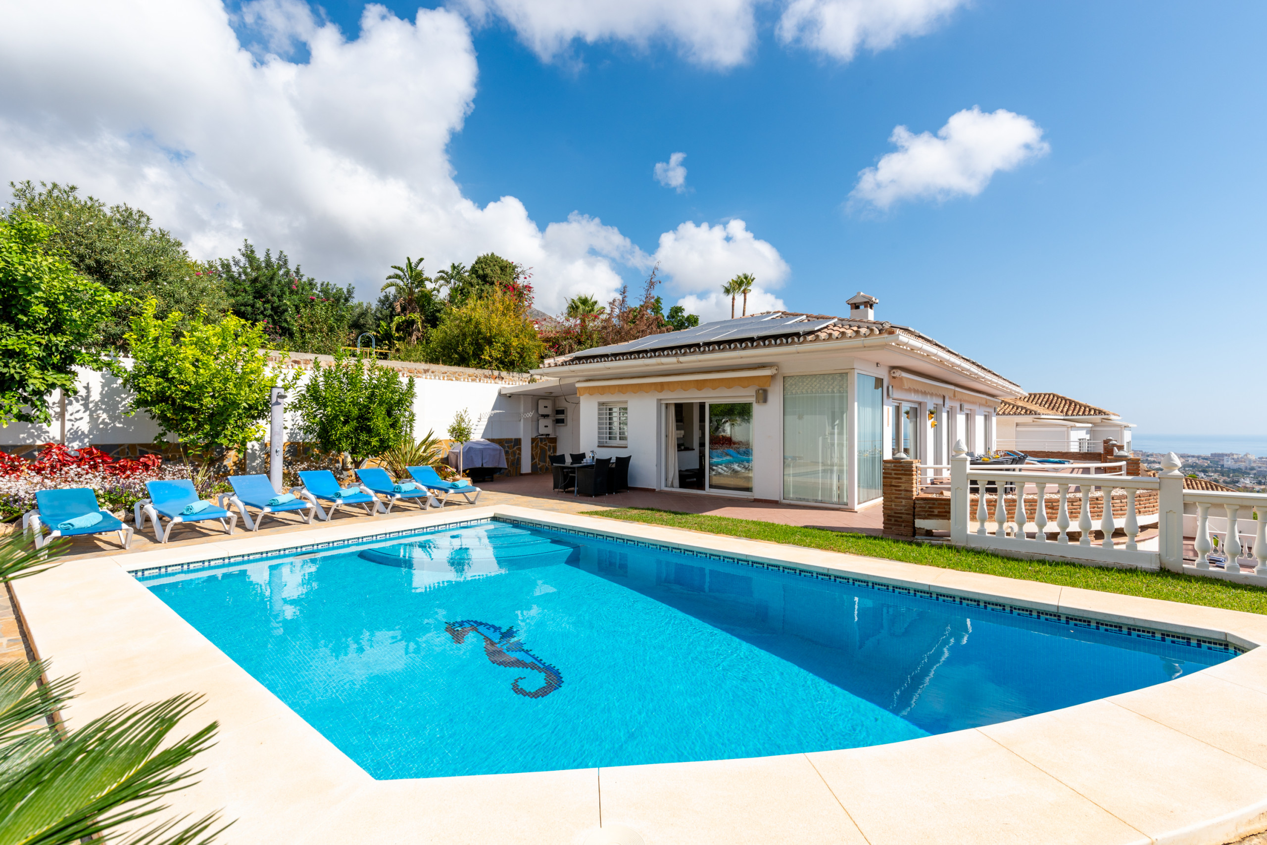 Private swimming pool, garden and covered terrace. There are plenty of loungers and patio furniture so you can all eat together. Beautiful views of Benalmadena and the Mediterranean.