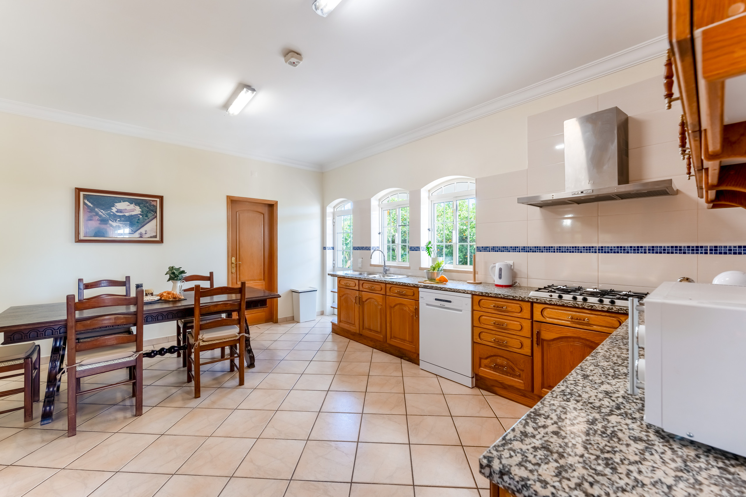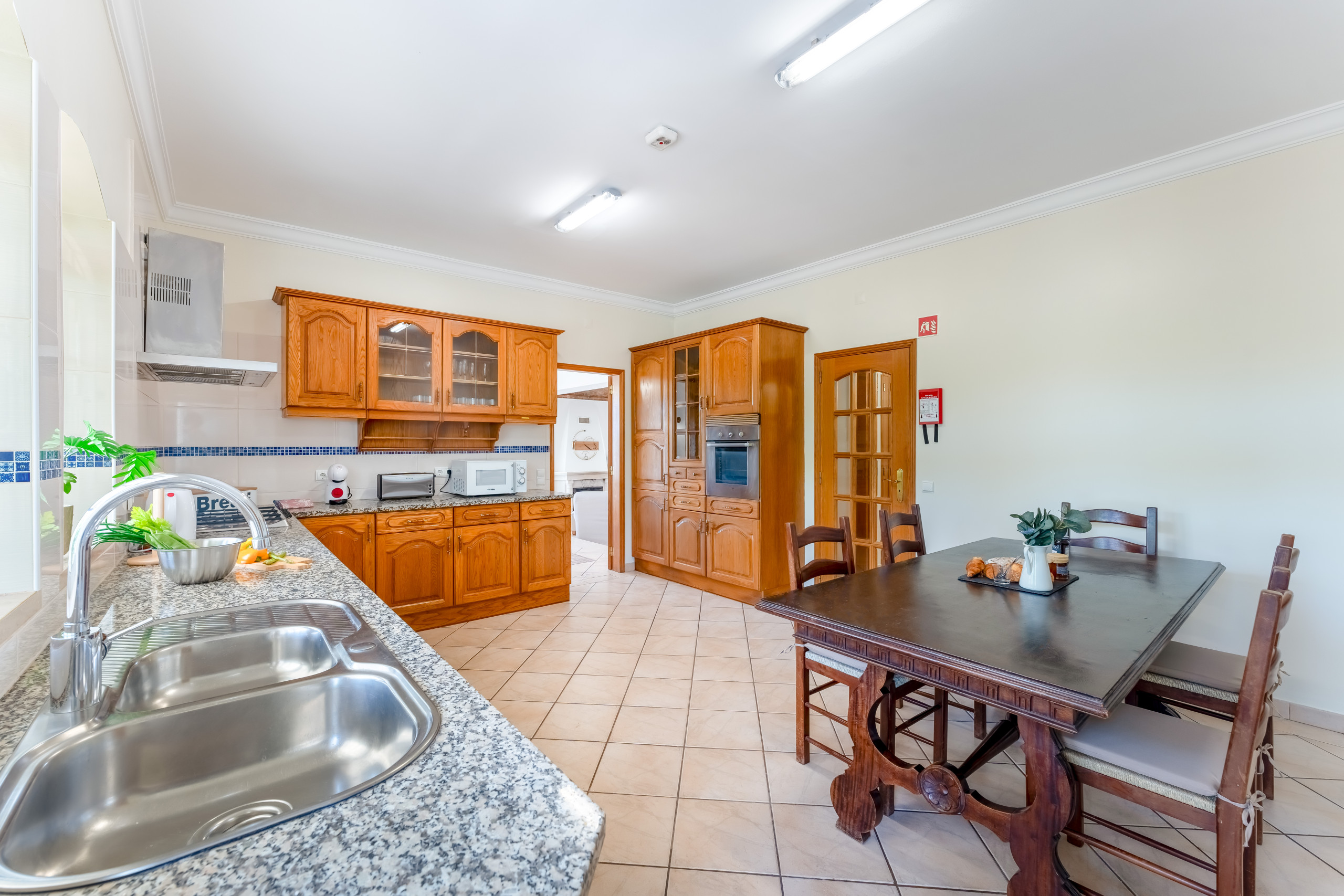 La cuisine est très spacieuse et complète avec tous les appareils et accessoires nécessaires à la vie quotidienne. Il y a une zone de garde-manger avec un réfrigérateur supplémentaire. De la cuisine, il y a également une porte menant à la zone de barbecue ombragée avec la table à manger extérieure.