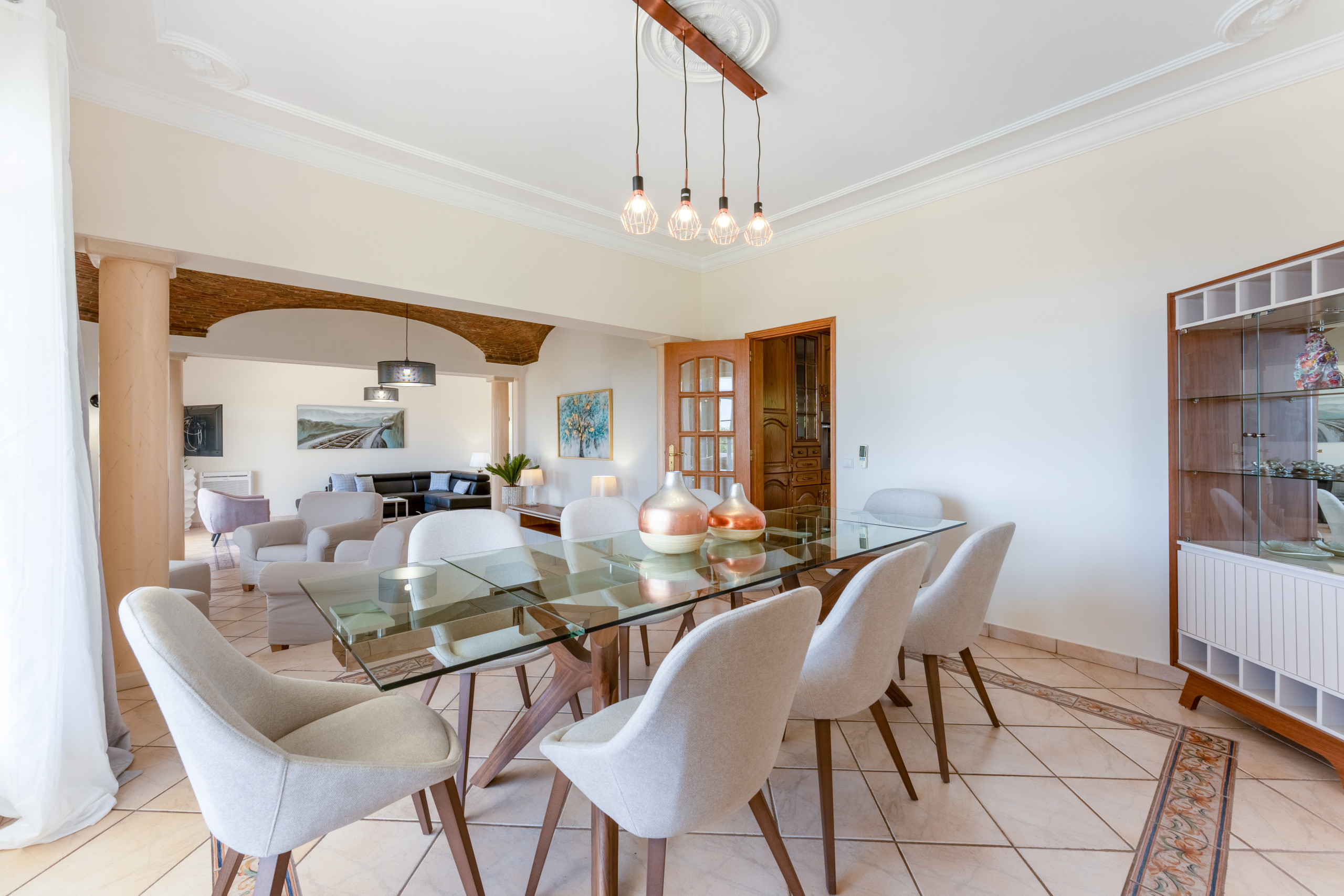 Le salon est spacieux et comporte 3 zones distinctes, le bar, la zone de séjour et de repas. L'espace salon dispose d'une cheminée, d'une télévision avec chaînes anglaises (BBC, ITV, etc.) et d'une couverture Wi-Fi dans toute la villa.