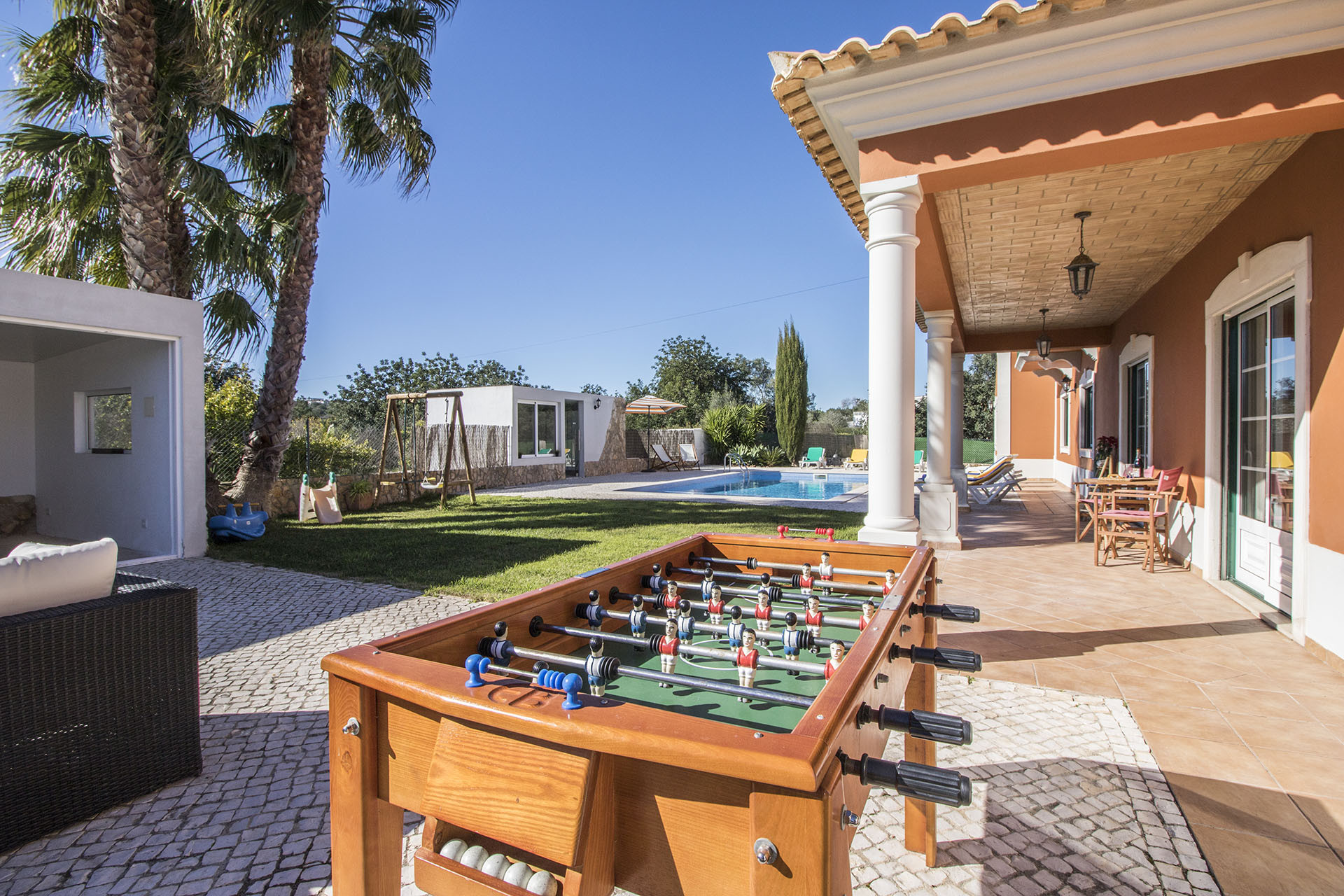 L'herbe dispose d'une balançoire et d'autres jouets qui bénéficient de l'ombre naturelle des palmiers, un endroit idéal pour que les enfants s'amusent. Le mobilier d'extérieur fait du jardin un espace relaxant et agréable pour toute la famille. Le baby-foot et le tennis de table feront le bonheur de nos invités et une toute nouvelle annexe extérieure couverte adossée à une cuisine moderne et pratique permet d'excellents barbecues et repas d'été.