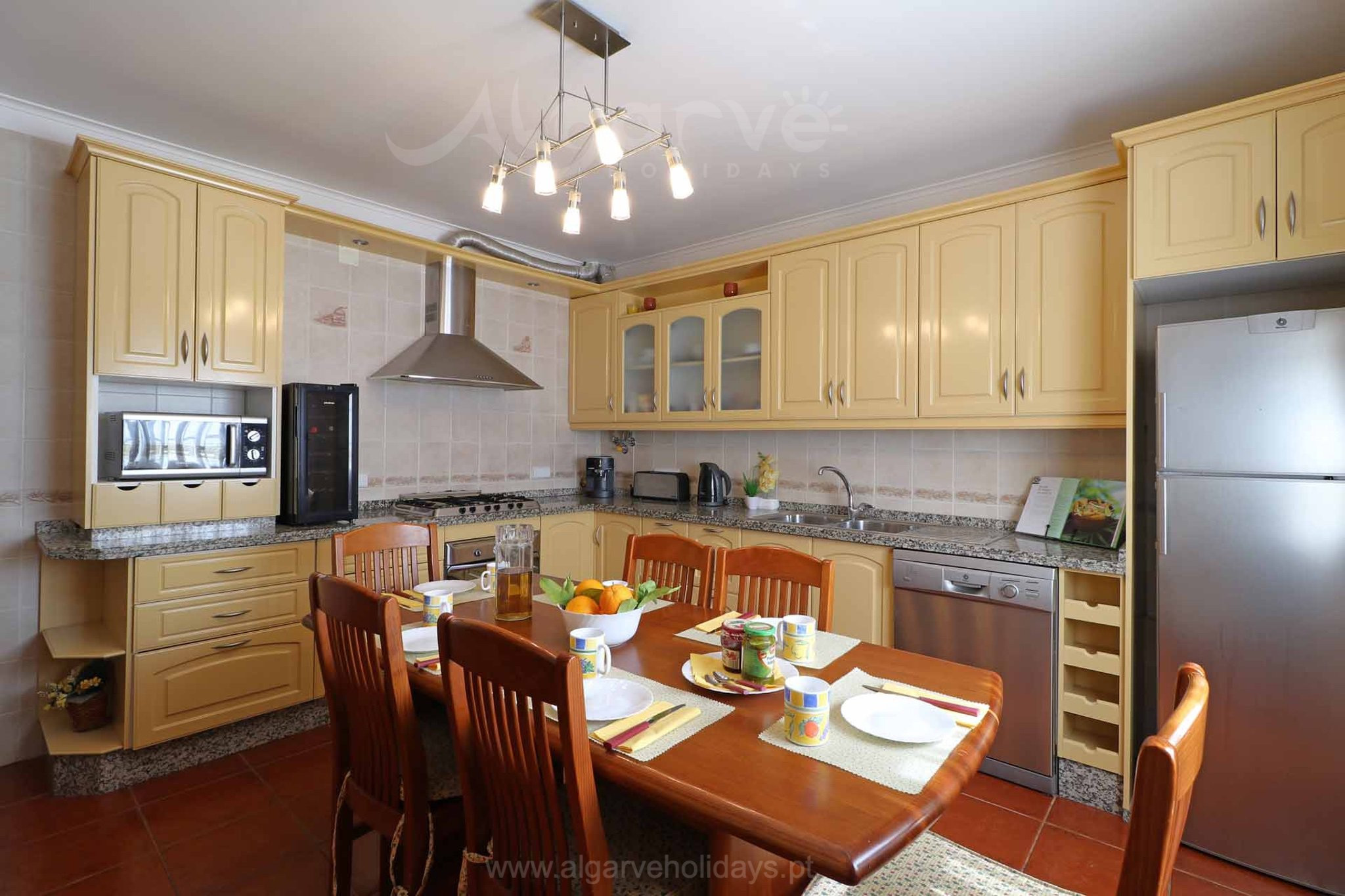 La cuisine entièrement équipée dispose d'un petit garde-manger séparé et d'une grande table pouvant accueillir toute la famille. Il y a une porte dans la cuisine qui donne accès à l'arrière de la maison, y compris le garde-manger couvert, le jardin et la piscine.