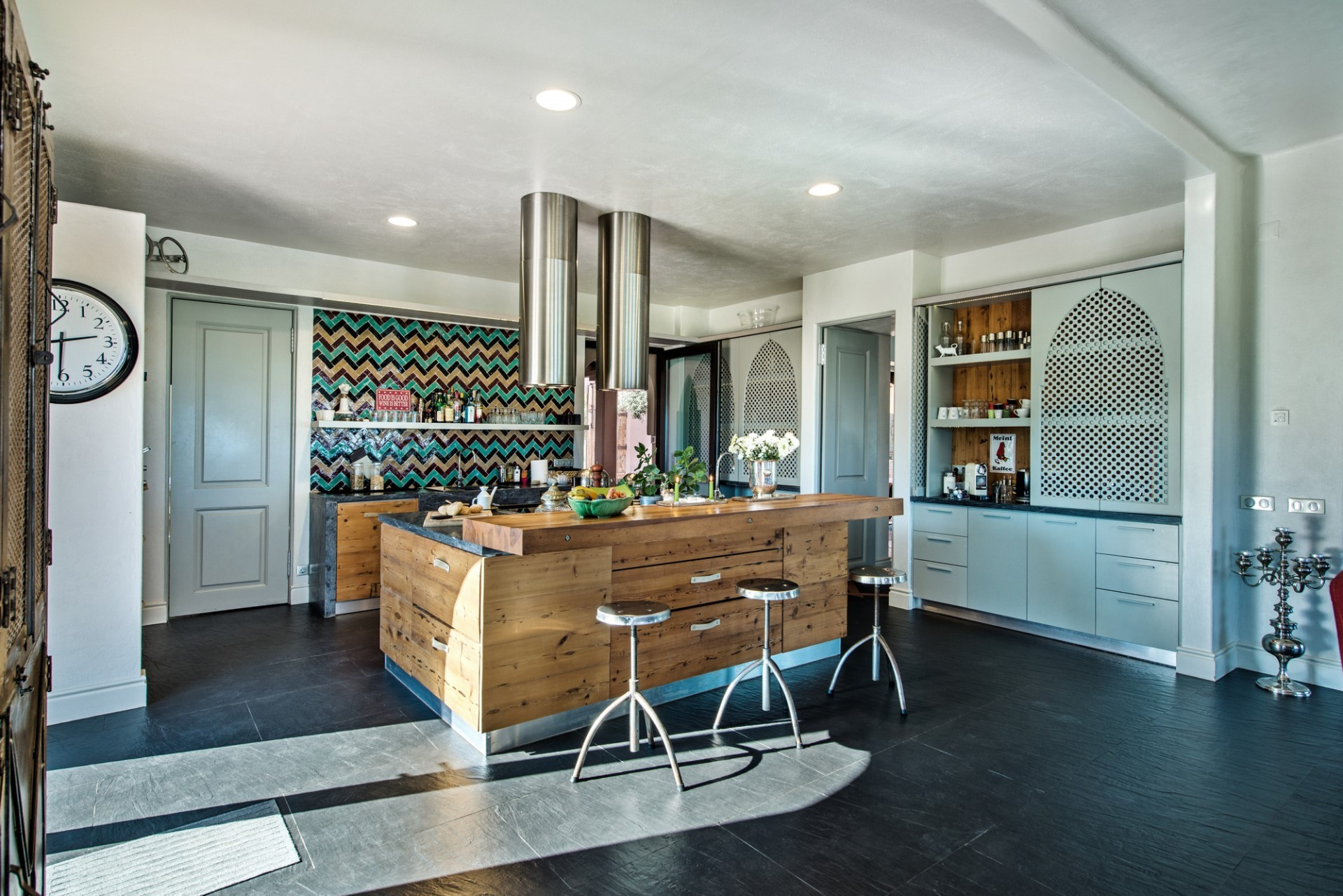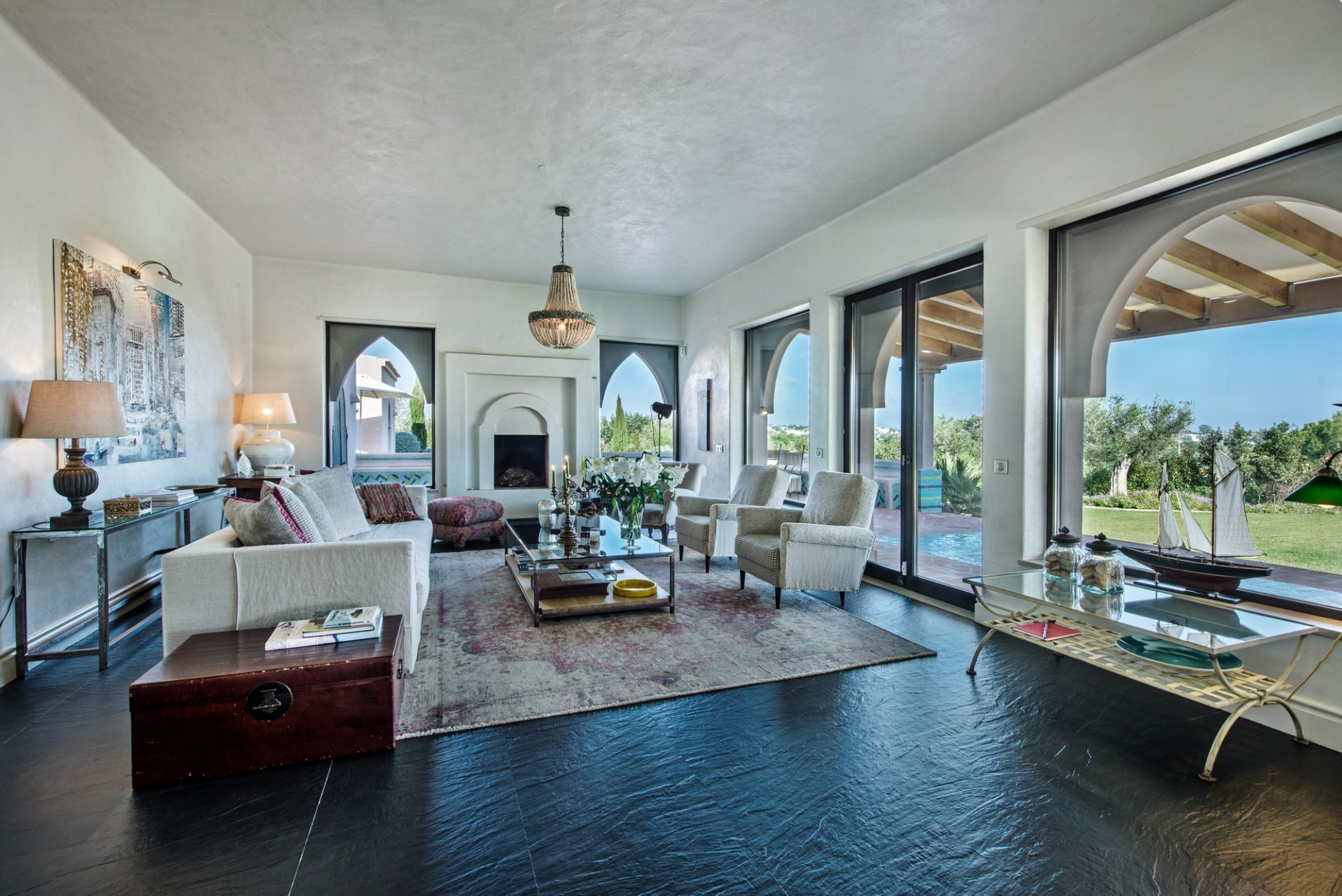 Le salon dispose d'un feu de bois artisanal de style mauresque ouvert et donne accès à la terrasse du jardin avant.