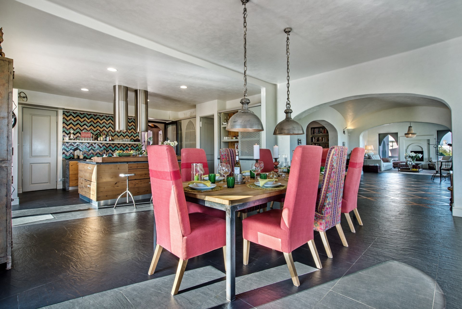 La salle à manger ouverte peut accueillir douze personnes et mène aux terrasses du jardin à l'avant et à l'ouest.