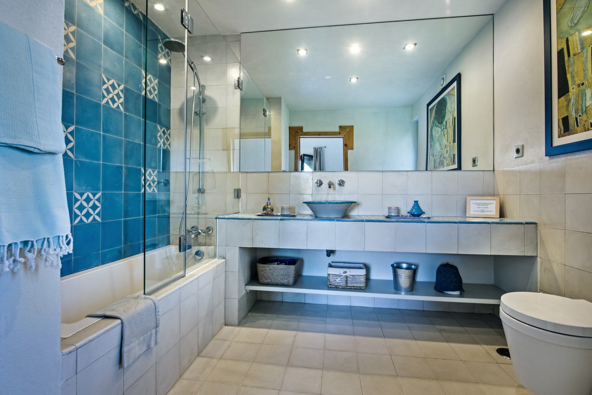 Le dressing mène à travers une arche à la zone de couchage avec un lit king-size. De là, une grande terrasse privée avec un escalier extérieur menant au jardin et à la piscine.