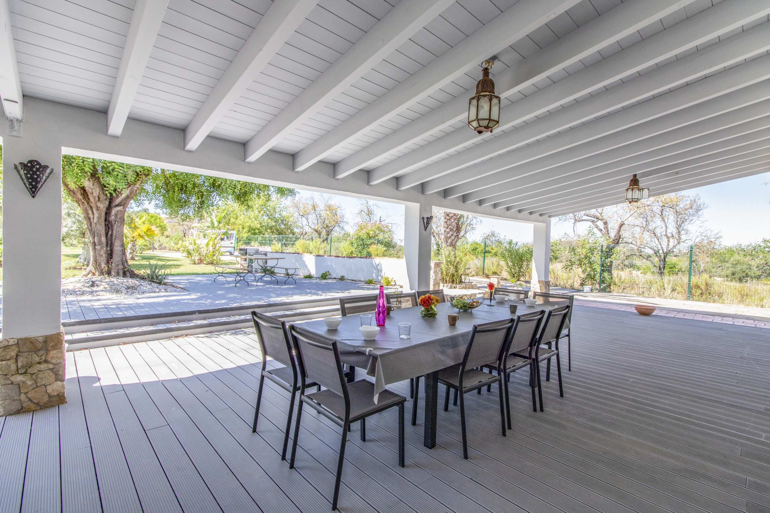 Il y a un espace couvert avec une table à manger et des meubles de jardin.