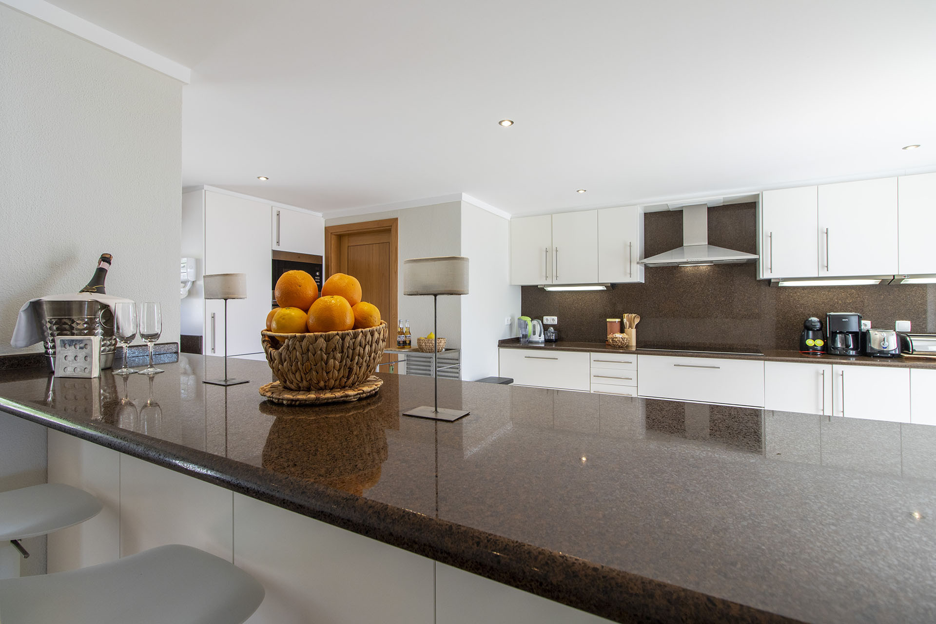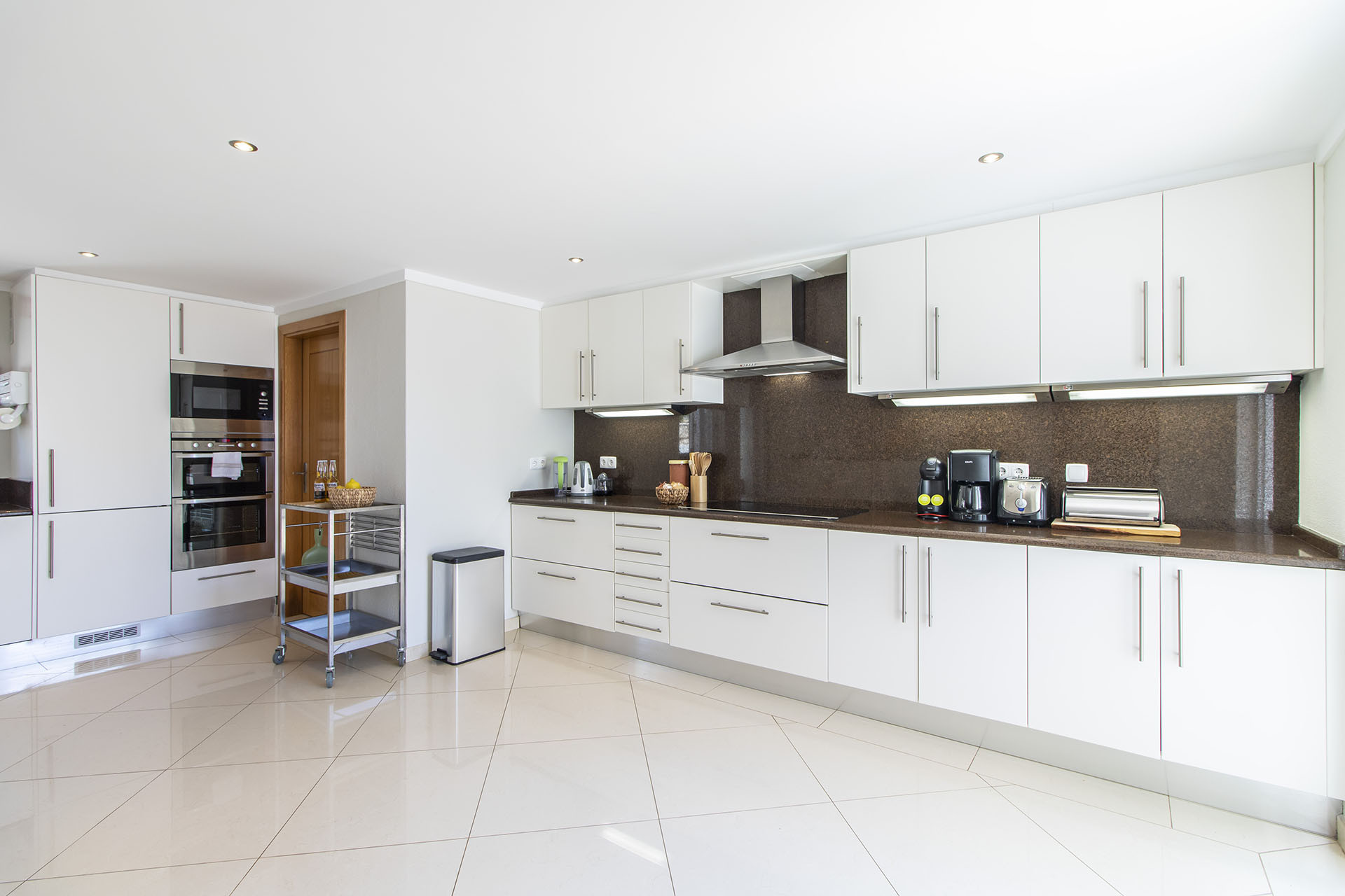 La cuisine et la salle à manger dans les tons marron et ivoire, sont réunies en un seul espace avec un bel îlot, avec de grands rangements et un espace petit-déjeuner avec 4 tabourets hauts, faisant la séparation entre eux ; la cuisine est grande et moderne et est entièrement équipée avec tous les appareils nécessaires à votre séjour, la buanderie est équipée de machines à laver et sèche-linge.
