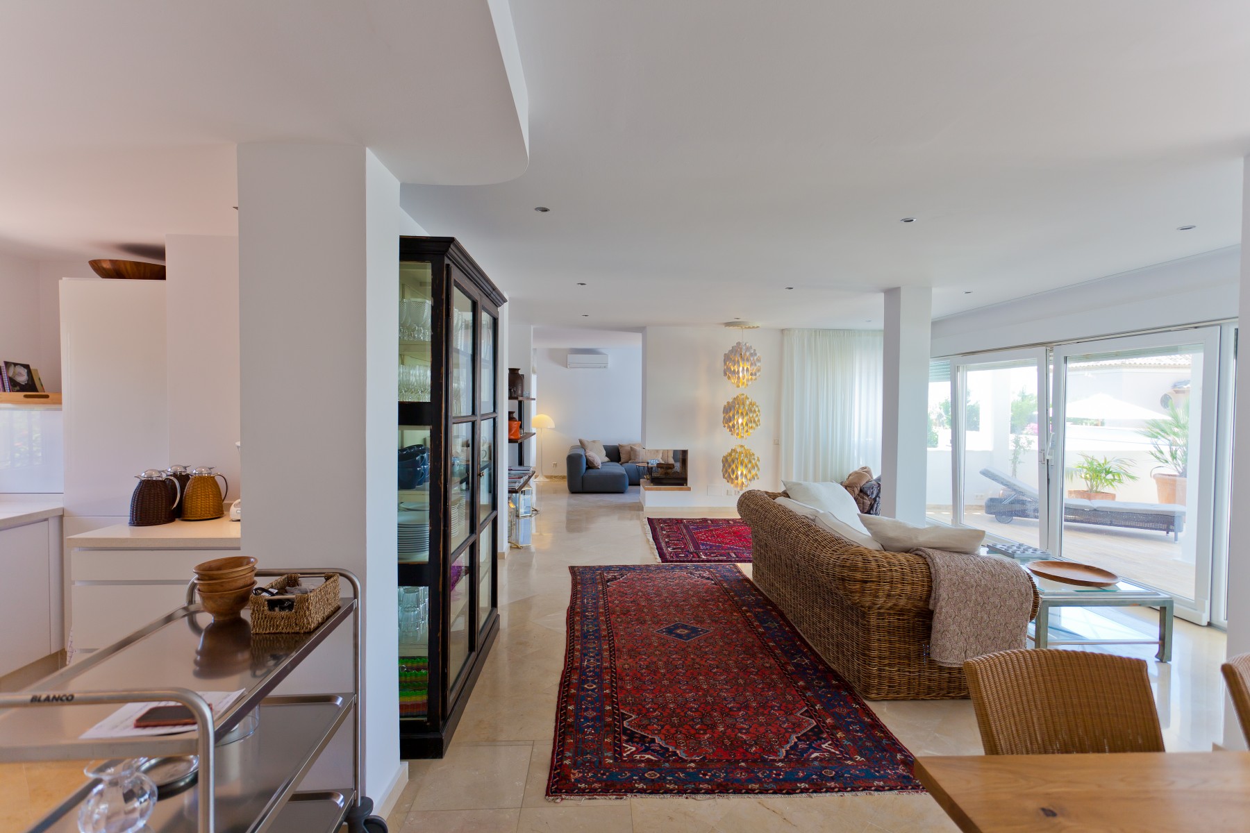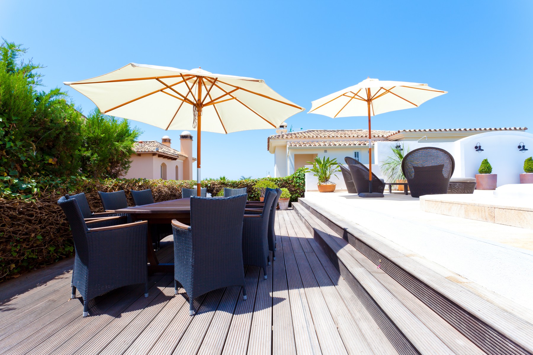There is a lovely terrace surrounding the pool with beautiful natural stones and plenty of quality terrace furniture, sunbeds, umbrellas and cosy corners. There is obviously a large Weber grill and outdoor kitchen if you choose to have a nice evening with a few good steaks on the grill, if you don’t want to visit one of the many popular beach restaurants, located within walking distance from the villa.