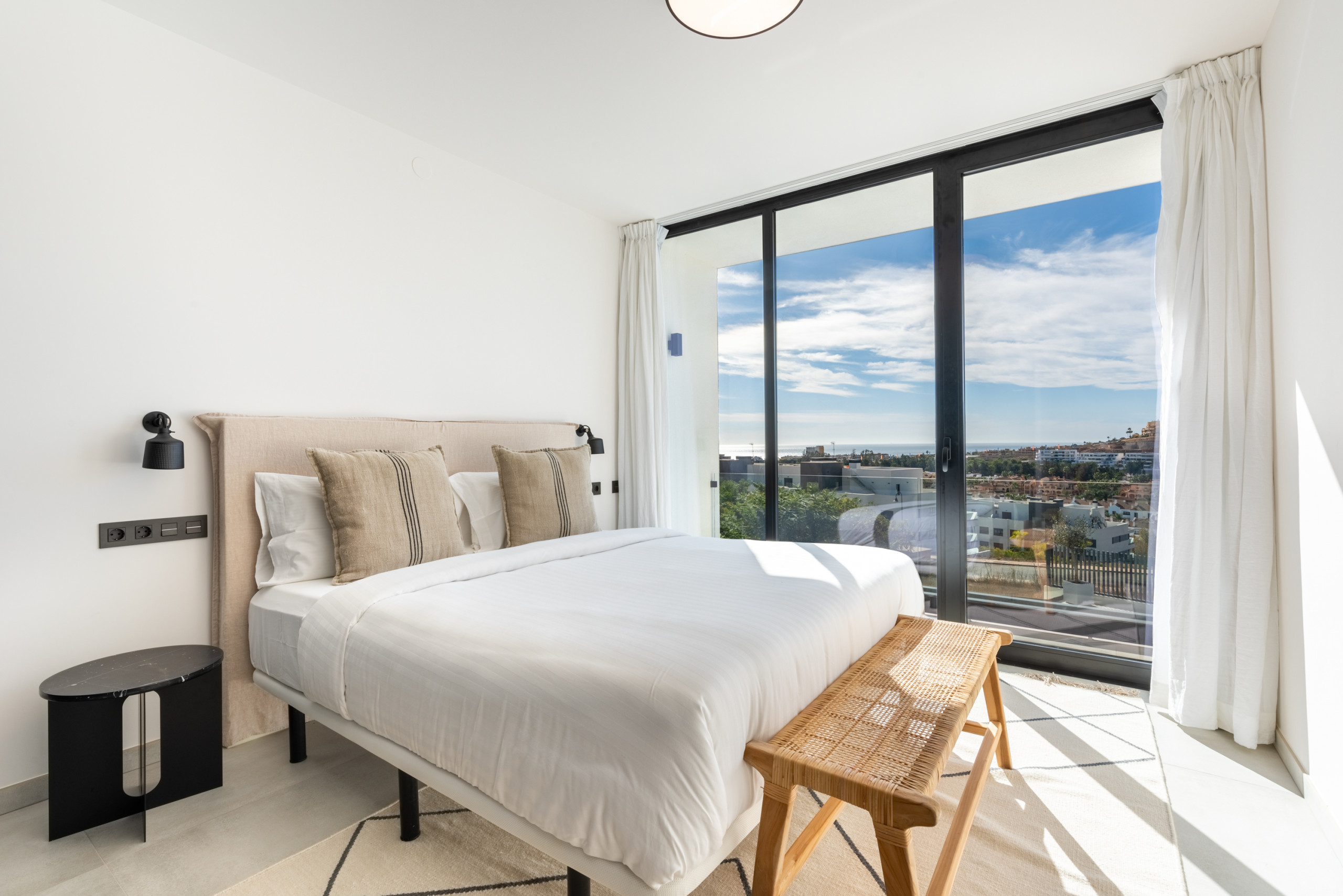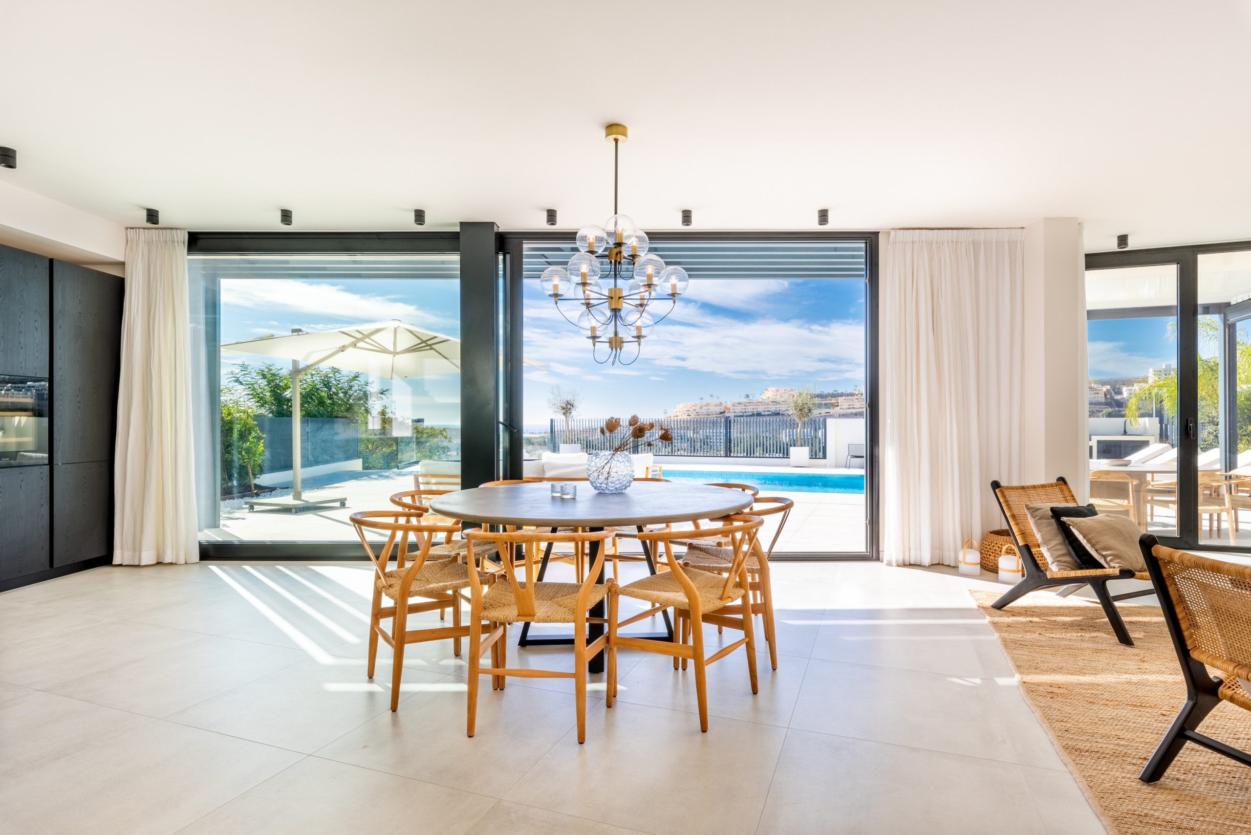 Through the living room, gives access to the main terrace, which is beautifully furnished with dining table, lounging area, sun beds and a fabulous private pool. All this with beautiful views of the Mijas costa coastline.