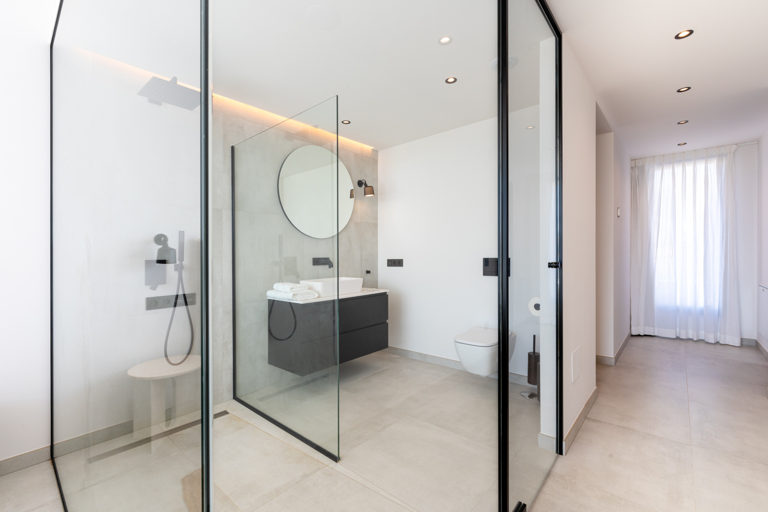 Shared bathroom: Spacious bathroom with double vanity and a large walk-in shower.