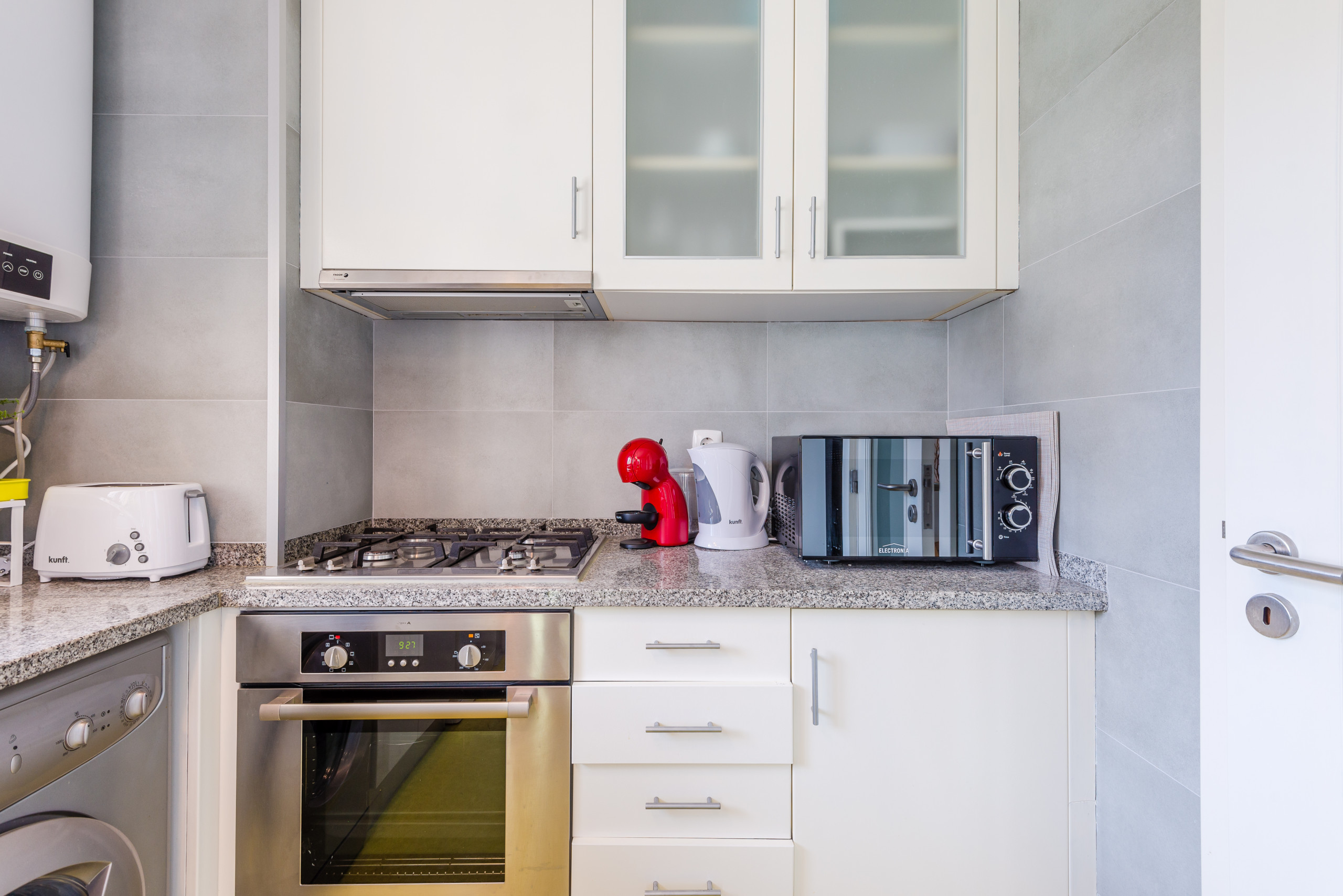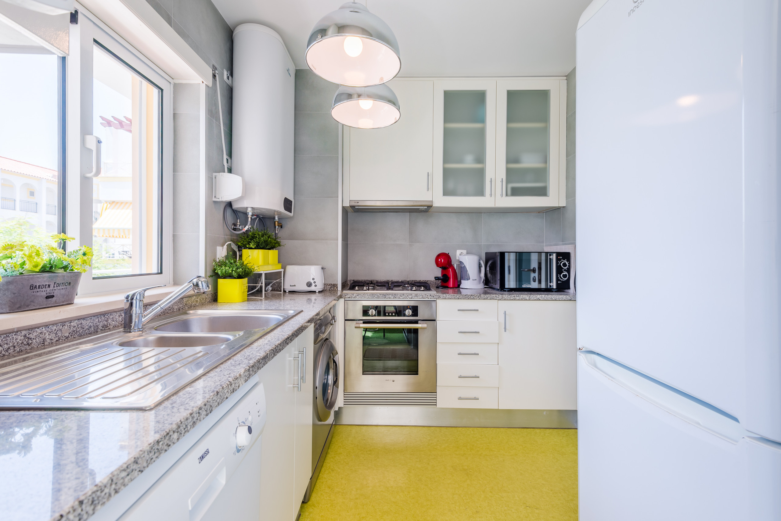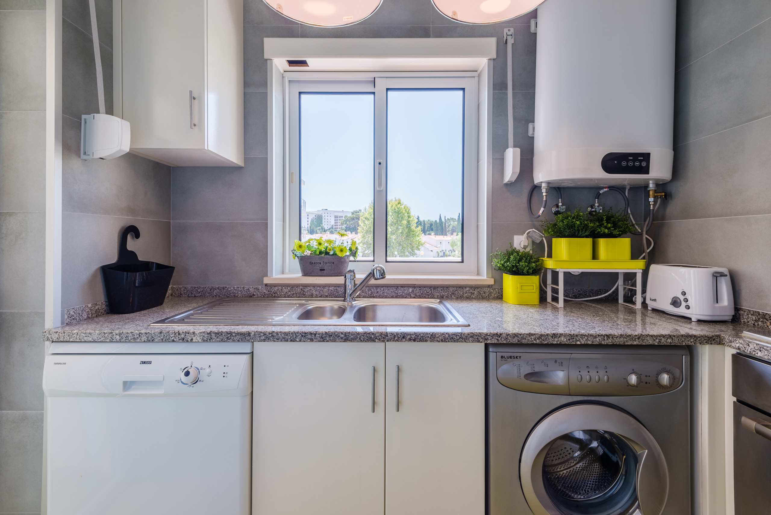 A cozinha está equipada com frigorífico, micro-ondas, forno, congelador, máquina de lavar roupa, máquina de lavar louça, louça/talheres, utensílios de cozinha, máquina de café, torradeira e jarro eléctrico.