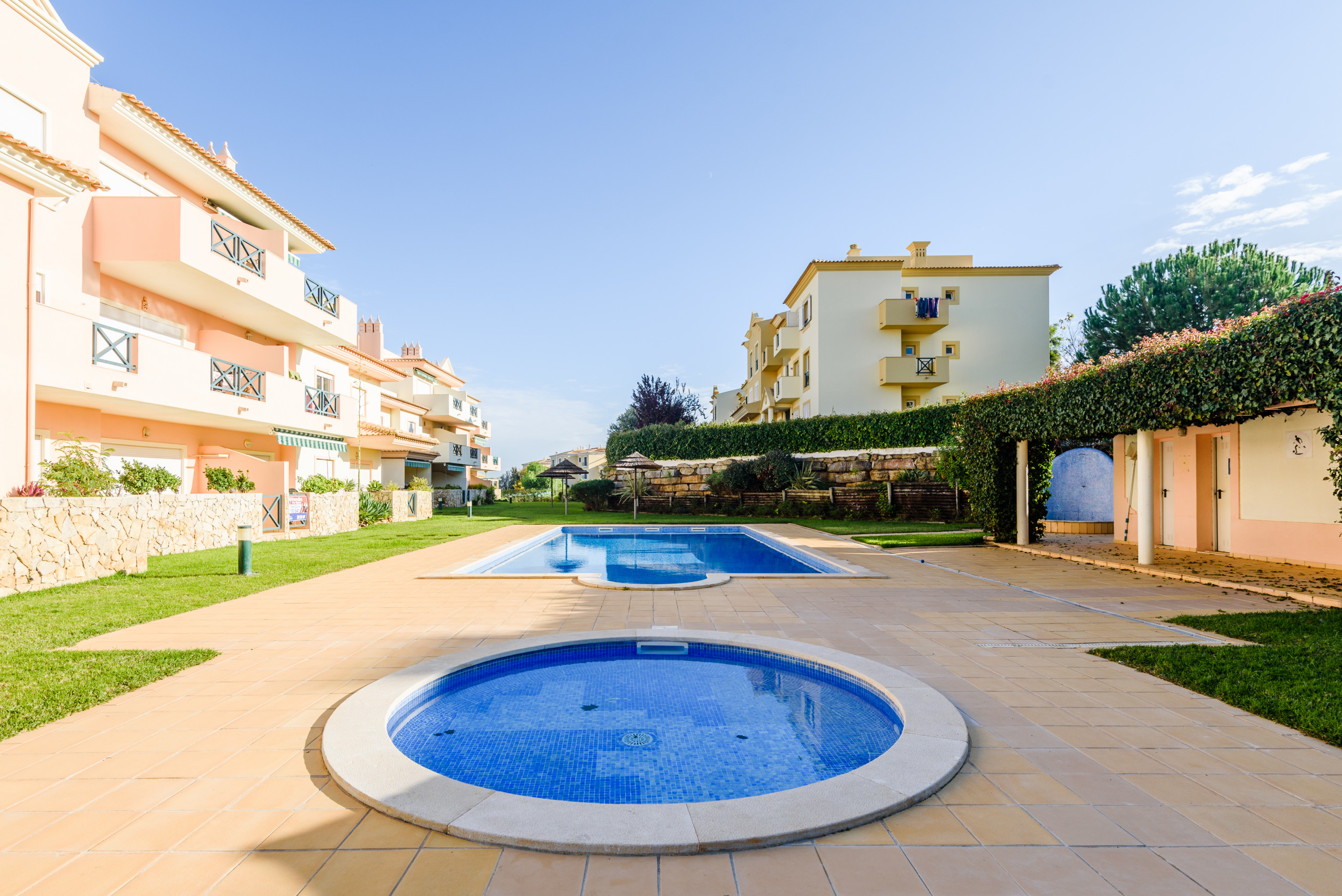 Dispõe de jardim, mobiliário de jardim, terraço, máquina de lavar roupa, ferro de engomar, acesso internet (wifi), secador de cabelo, ar-condicionado em todo o alojamento, piscina comunitária+infantil, estacionamento ao ar livre no mesmo edifício, tv satélite, Dvd.