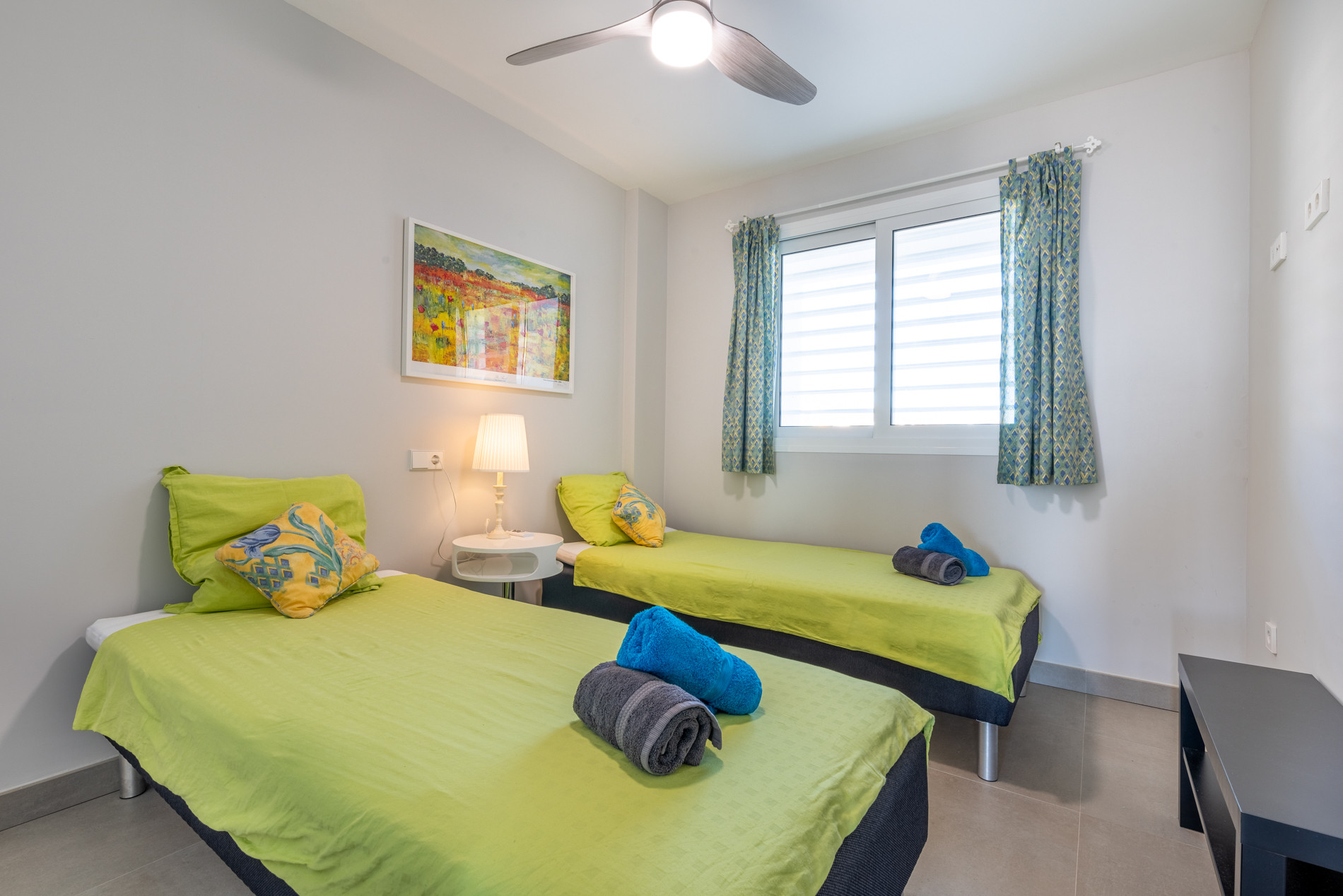 The 2nd bedroom contains 2 single beds, wardrobe, and an air-condition.