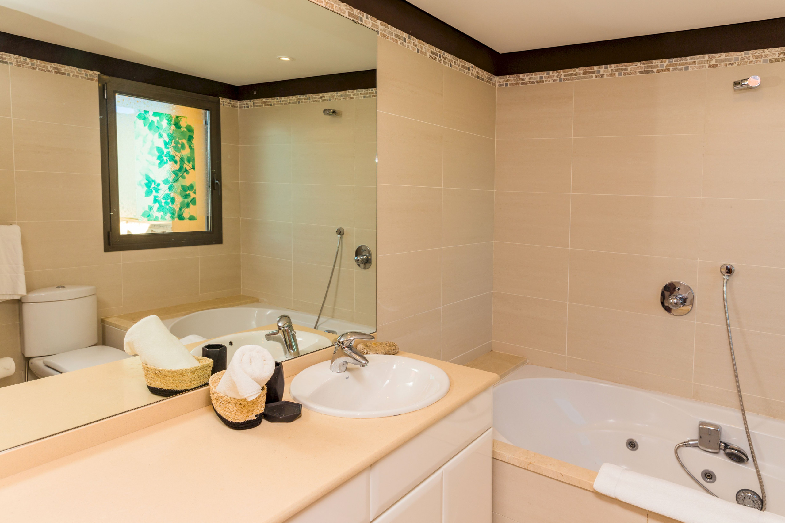 No primeiro piso oferece uma cozinha americana moderna e totalmente equipada com frigorífico, micro-ondas, forno, congelador, máquina de lavar, máquina de lavar loiça, louça e talheres, utensílios de cozinha, máquina de café, torradeira, chaleira, espremedor e pratos e taças. A acolhedora sala de estar, decorada com muito gosto, dispõe de um sofá confortável, duas poltronas, Smart TV de ecrã plano e WiFi grátis. A sala de estar comunica com uma elegante zona de jantar com uma grande mesa de madeira e cadeiras. As portas duplas envidraçadas da sala de estar e da sala de jantar abrem-se para uma maravilhosa varanda exterior com um grande toldo, mesa e cadeiras para comer. Este piso conta também com duas casas de banho completas, uma com chuveiro e outra com banheira, e dois dos três quartos da habitação. Cada um destes quartos tem duas camas individuais, ventoinha de teto e uma pequena varanda. Uma bela escada de madeira conduz ao piso superior onde se encontra o quarto principal com cama de casal, ventoinha de teto, casa de banho em suite com banheira de hidromassagem e saída direta para a varanda superior com zona chill out, solário e maravilhosas vistas para a montanha. Todas as divisões têm ar condicionado por condutas.