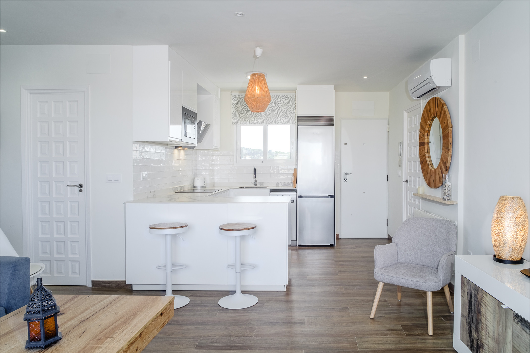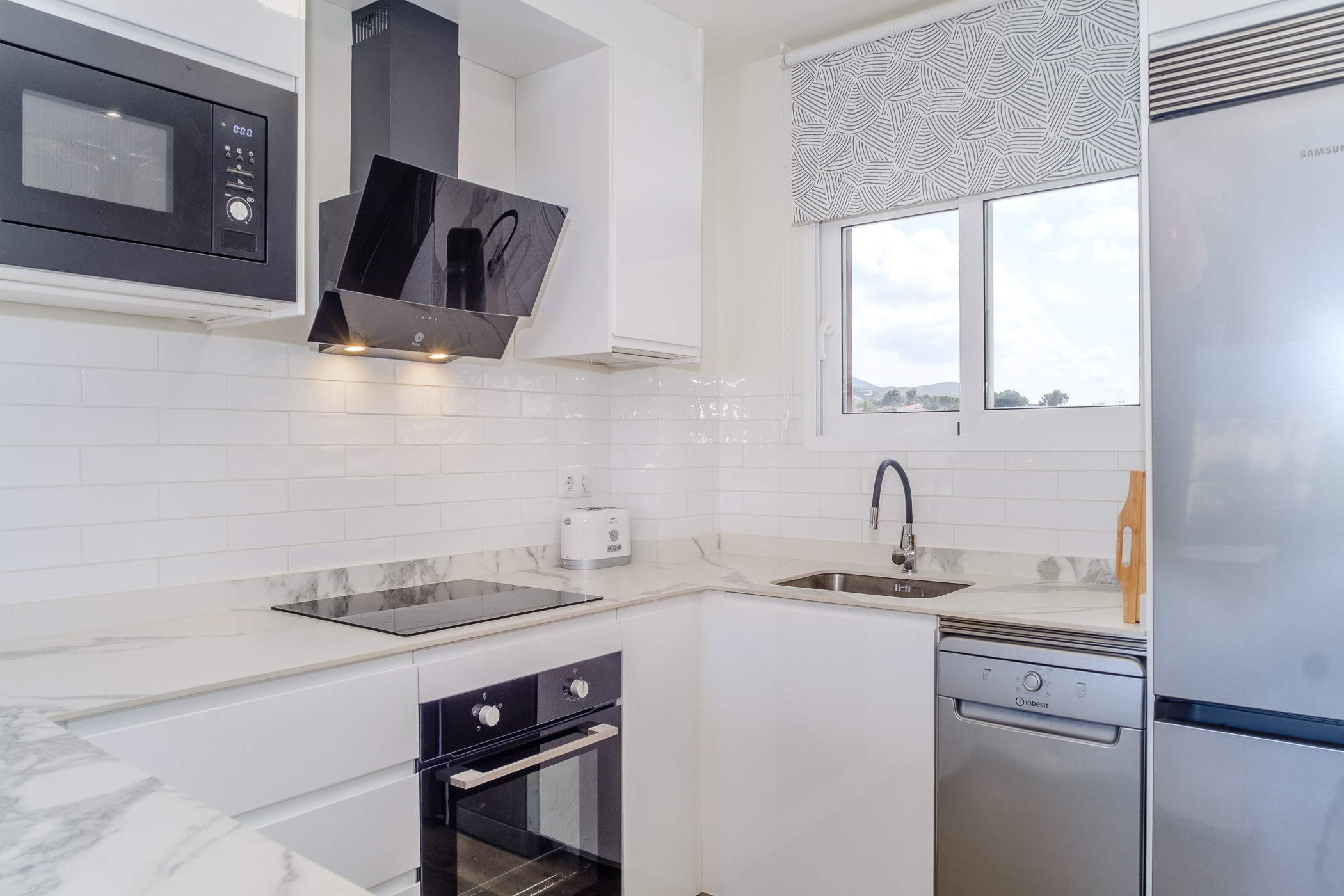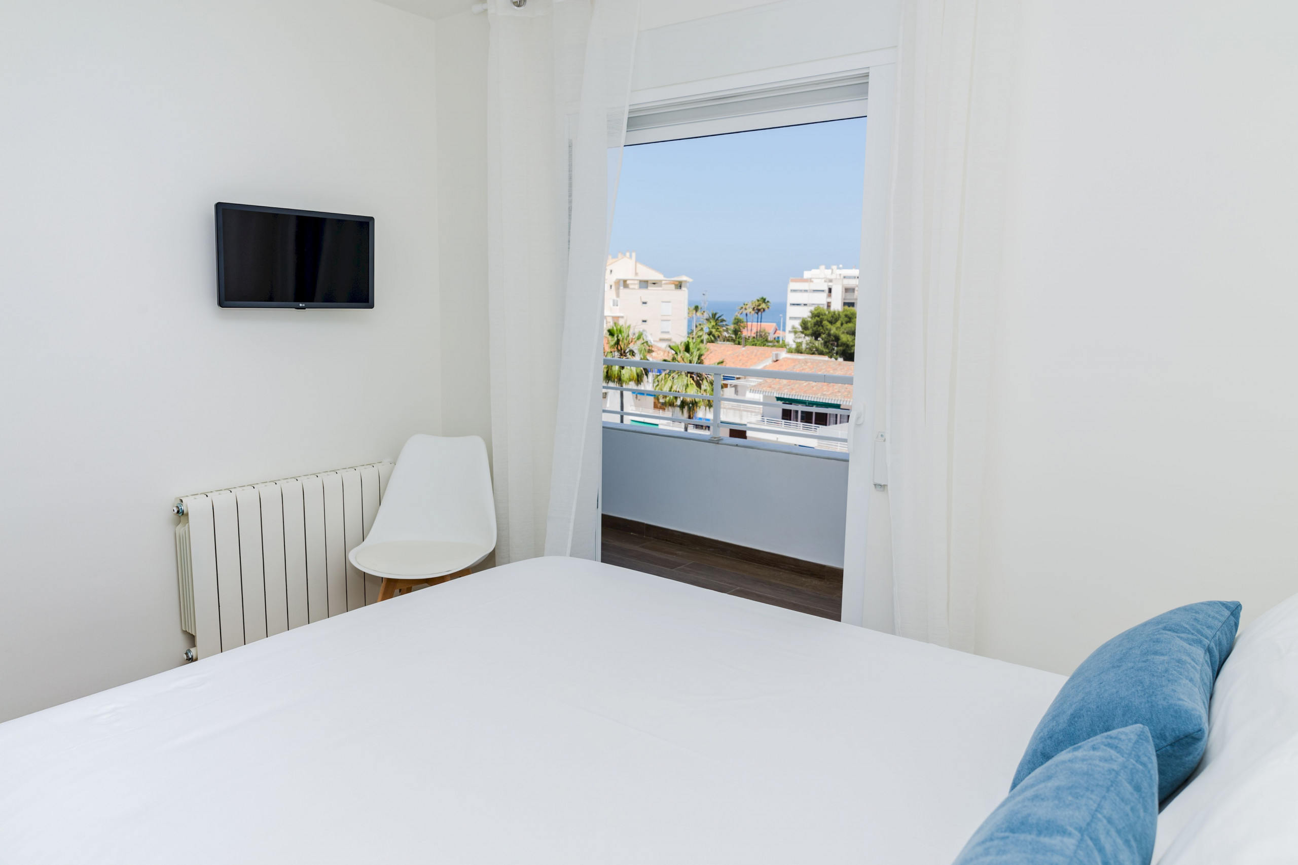 Este elegante, moderno e luminoso apartamento, tem 89 m² e foi recentemente renovado e decorado. A habitação, distribuída num único nível, conta com 3 quartos bonitos e 1 casa de banho com chuveiro, acomodando até 6 pessoas. O quarto principal possui uma cama de casal, roupeiros embutidos e saída direta para a varanda: o segundo quarto tem duas camas individuais e o terceiro uma prática beliche. O apartamento também oferece uma cozinha americana moderna e totalmente equipada com frigorífico, micro-ondas, forno, congelador, máquina de lavar, máquina de lavar louça, louça e talheres, utensílios de cozinha, máquina de café, torradeira, chaleira elétrica e pratos e taças. A sala decorada com muito gosto, dispõe de um sofá confortável, TV de ecrã plano, ar condicionado (apenas na sala), WiFi grátis e portas duplas que se abrem para uma maravilhosa varanda. Na varanda podemos desfrutar de uma mesa de jantar espaçosa e maravilhosas vistas para a piscina, o mar e a montanha. Nas zonas comuns do condomínio pode-se desfrutar de um impressionante jardim com relvado, zona infantil e uma grande piscina, vedada e com zona para crianças.
