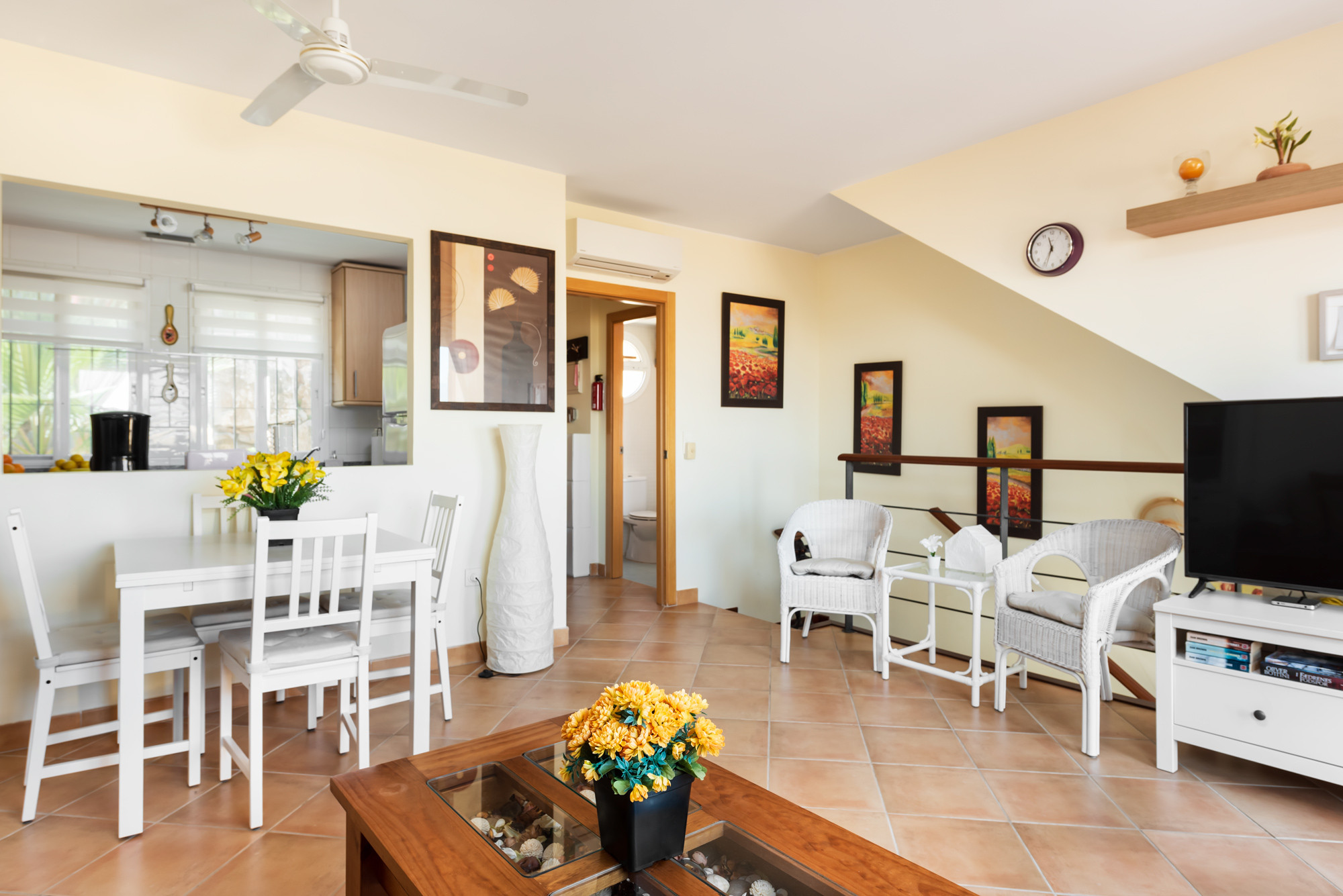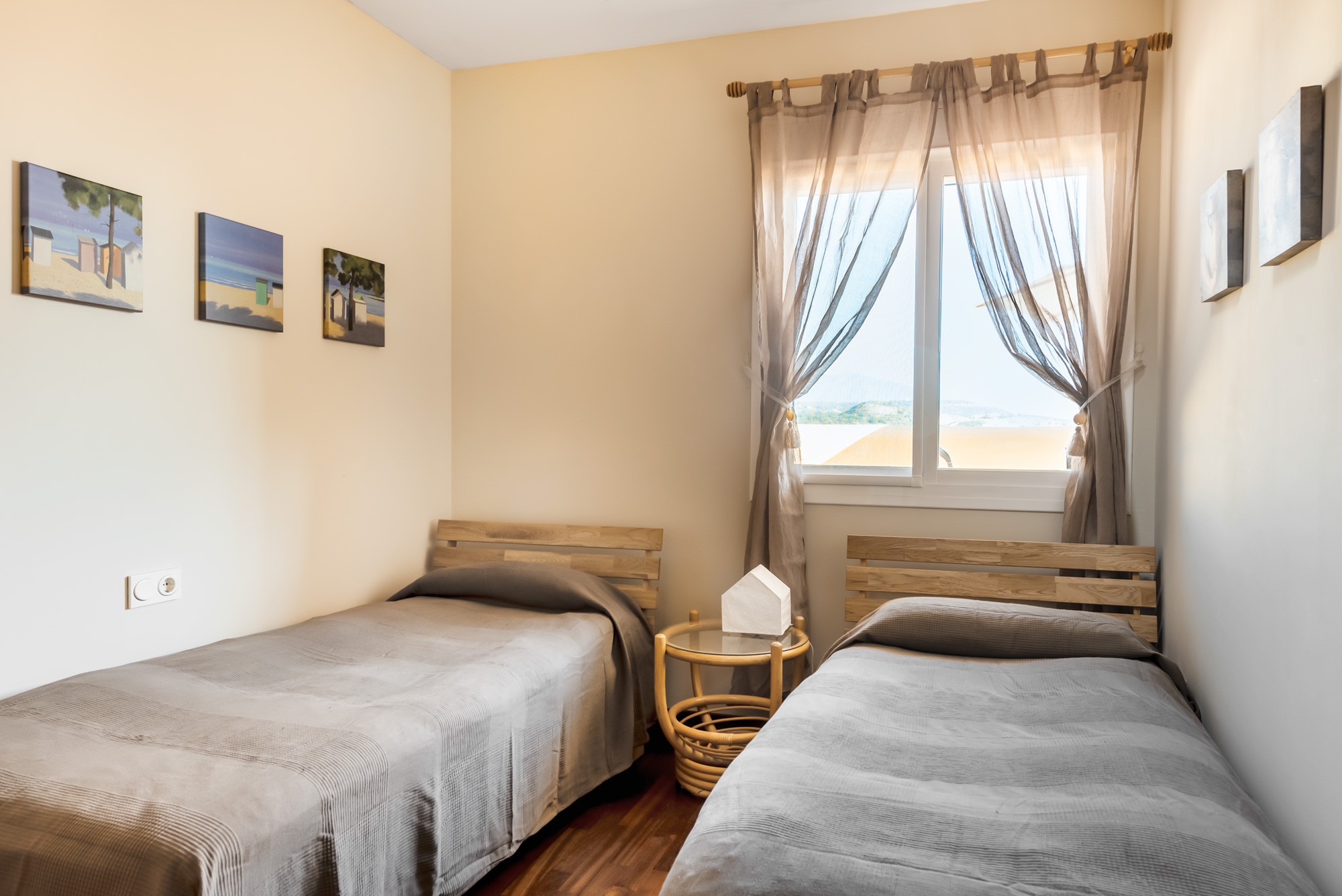 The kitchen is equipped with all the basic things and have oven, microwave, dishwasher, coffee machine, etc. Next to the kitchen you have the living room which contains a dining area and a cosy sofa area where there is TV with lots of different channels (Scandinavian, UK, German, etc.). There is direct access to the terrace which has garden furniture and sunbeds. From this terrace there is access to a large roof terrace and here you can enjoy meals at all times of the day while enjoying the beautiful view to the nearby mountains and Mediterranean Sea.