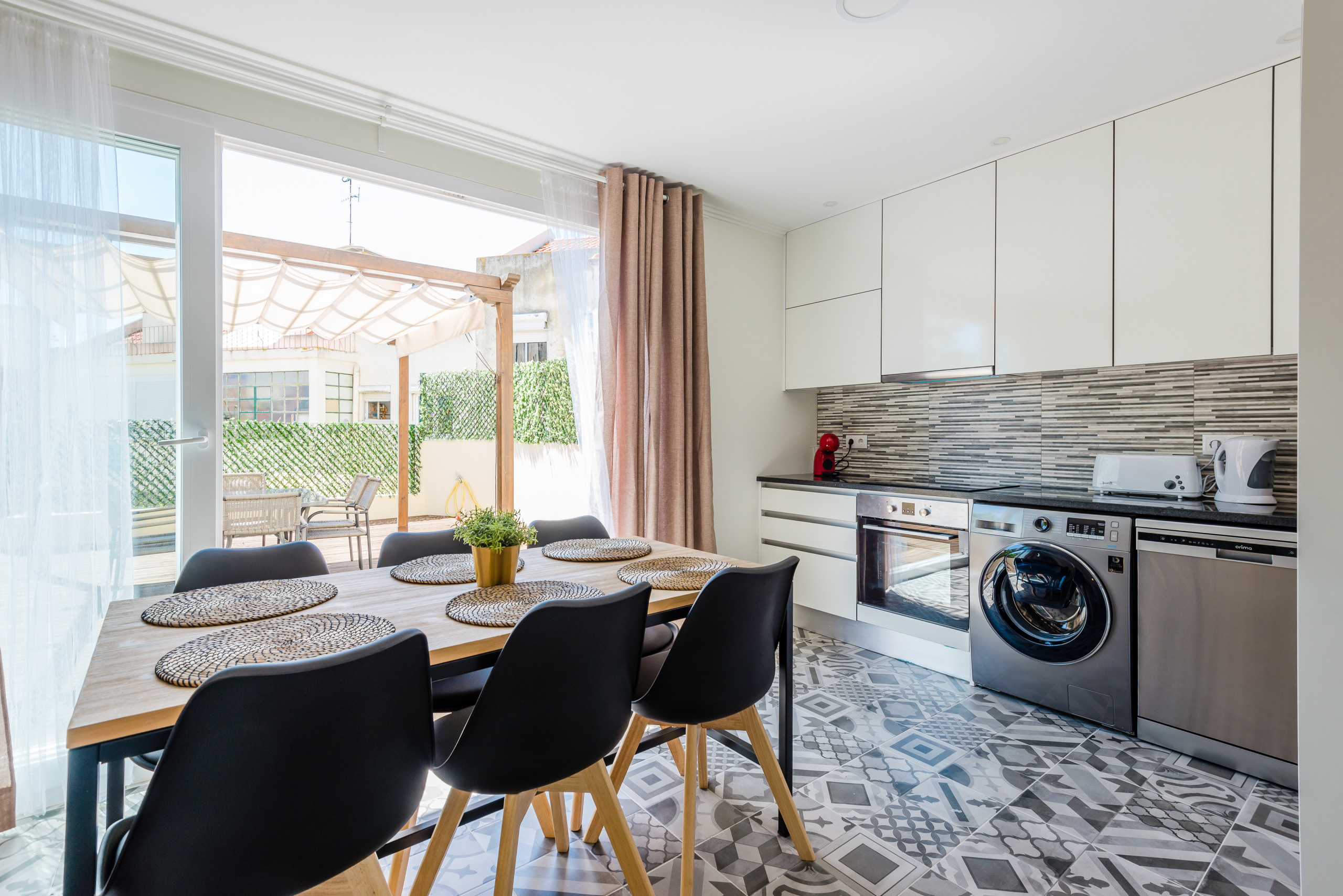 A cozinha e a área de estar têm vista para o grande jardim traseiro que possui um barbecue e proporciona refeições ao ar livre para 6 pessoas.