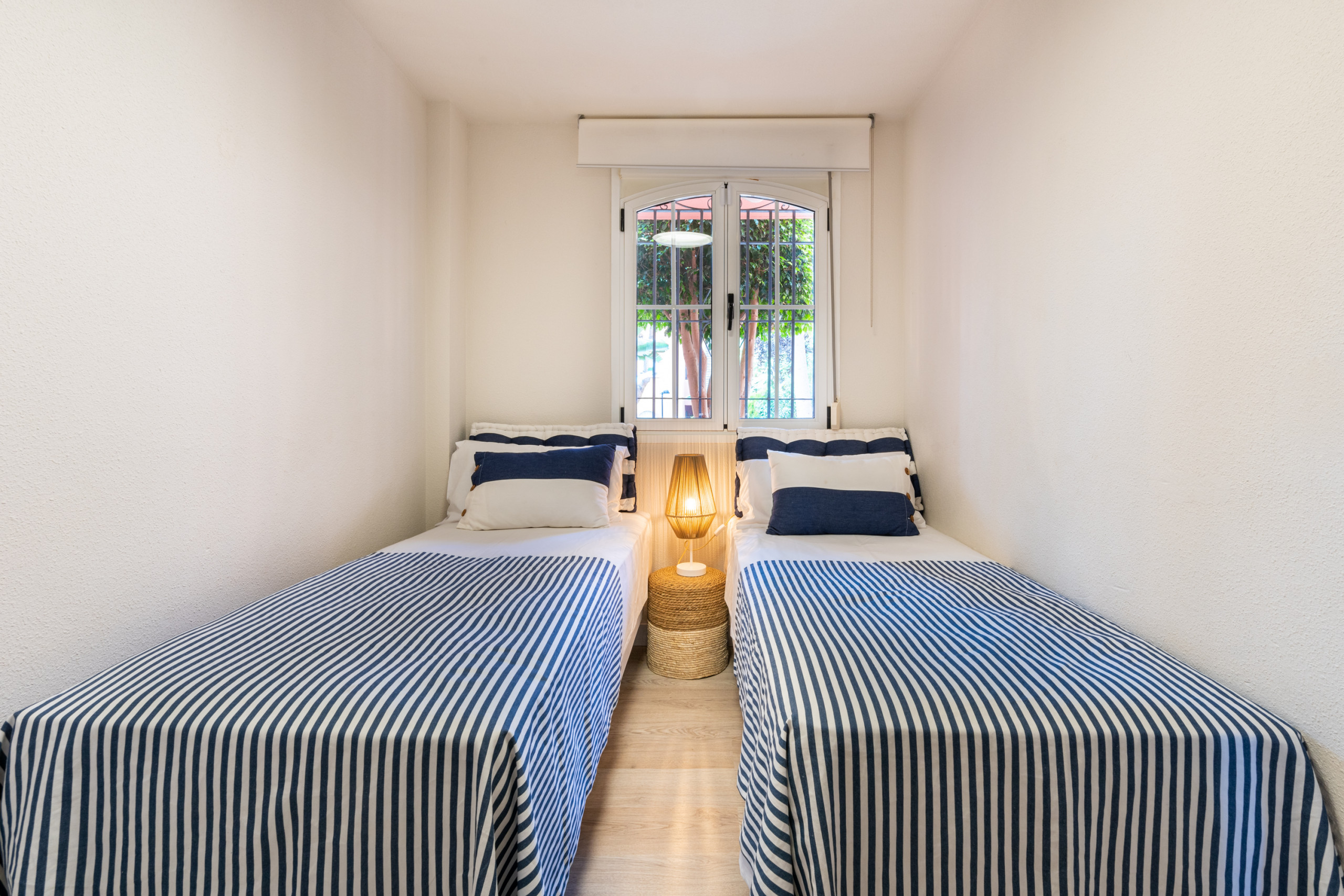 - Bedroom: 2 single beds (that can be put together), air conditioning, built-in wardrobe and blinds.