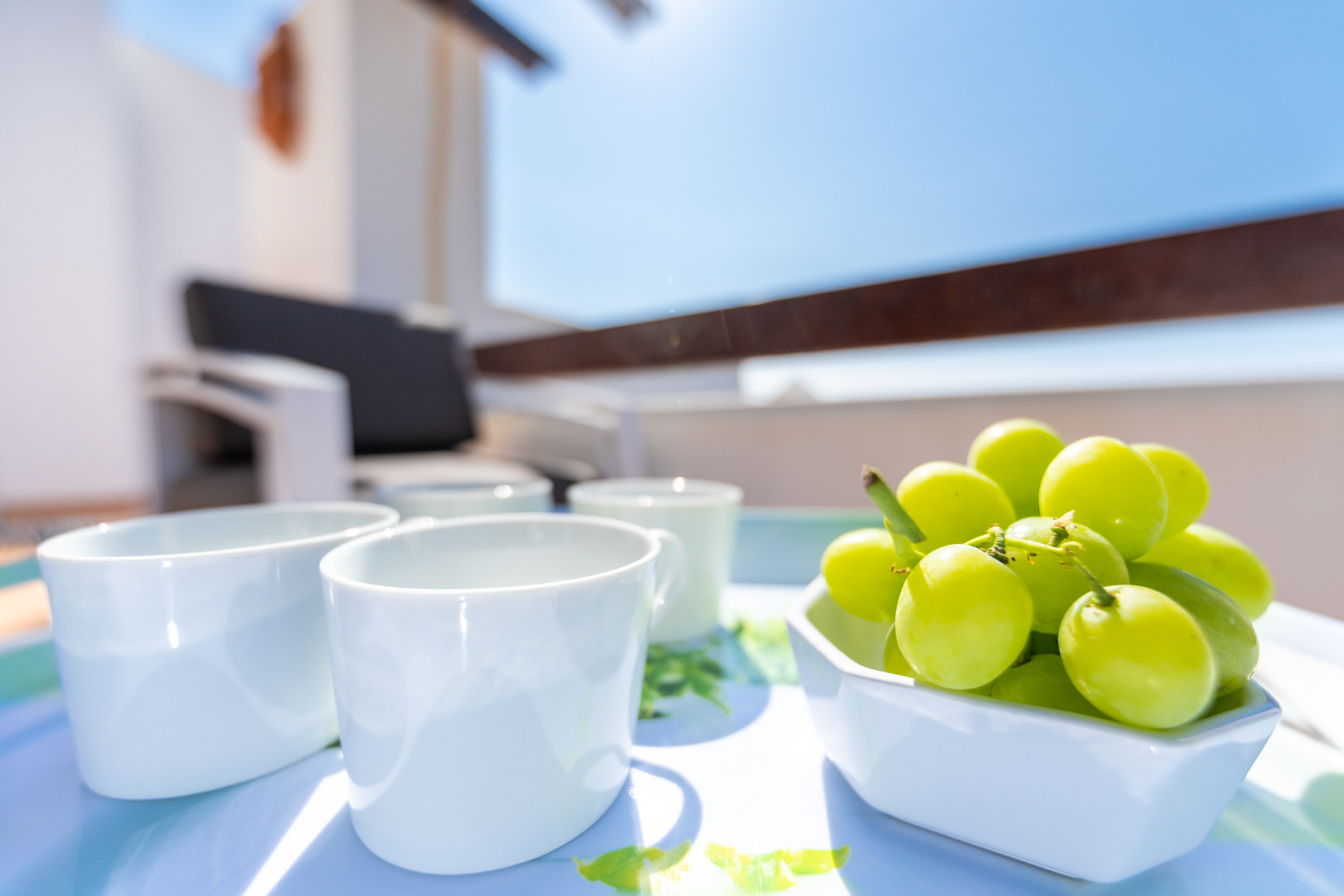 Varanda inferior com sofá exterior, zona de refeições, espreguiçadeiras, BBQ e jacuzzi privado (mediante pedido)