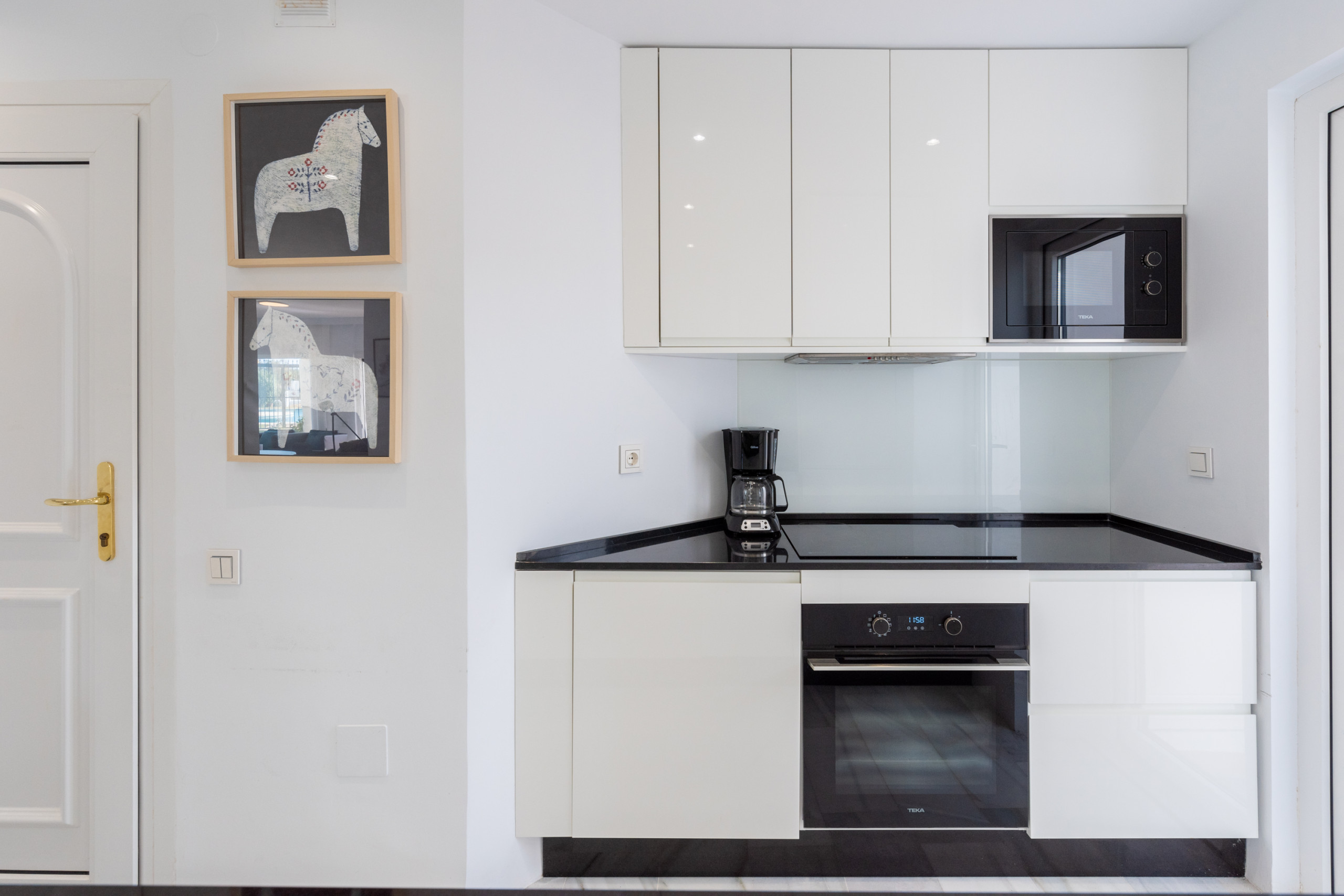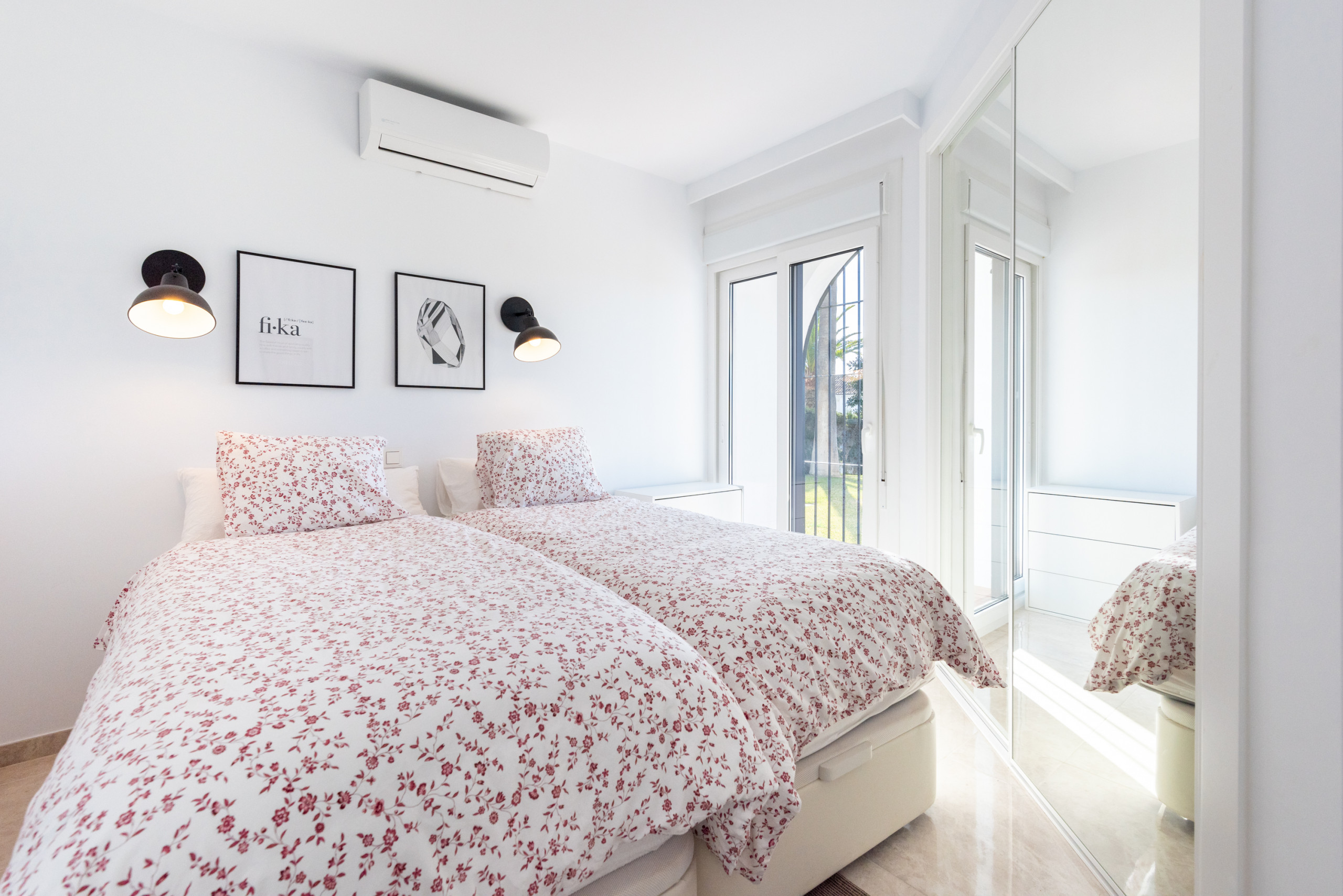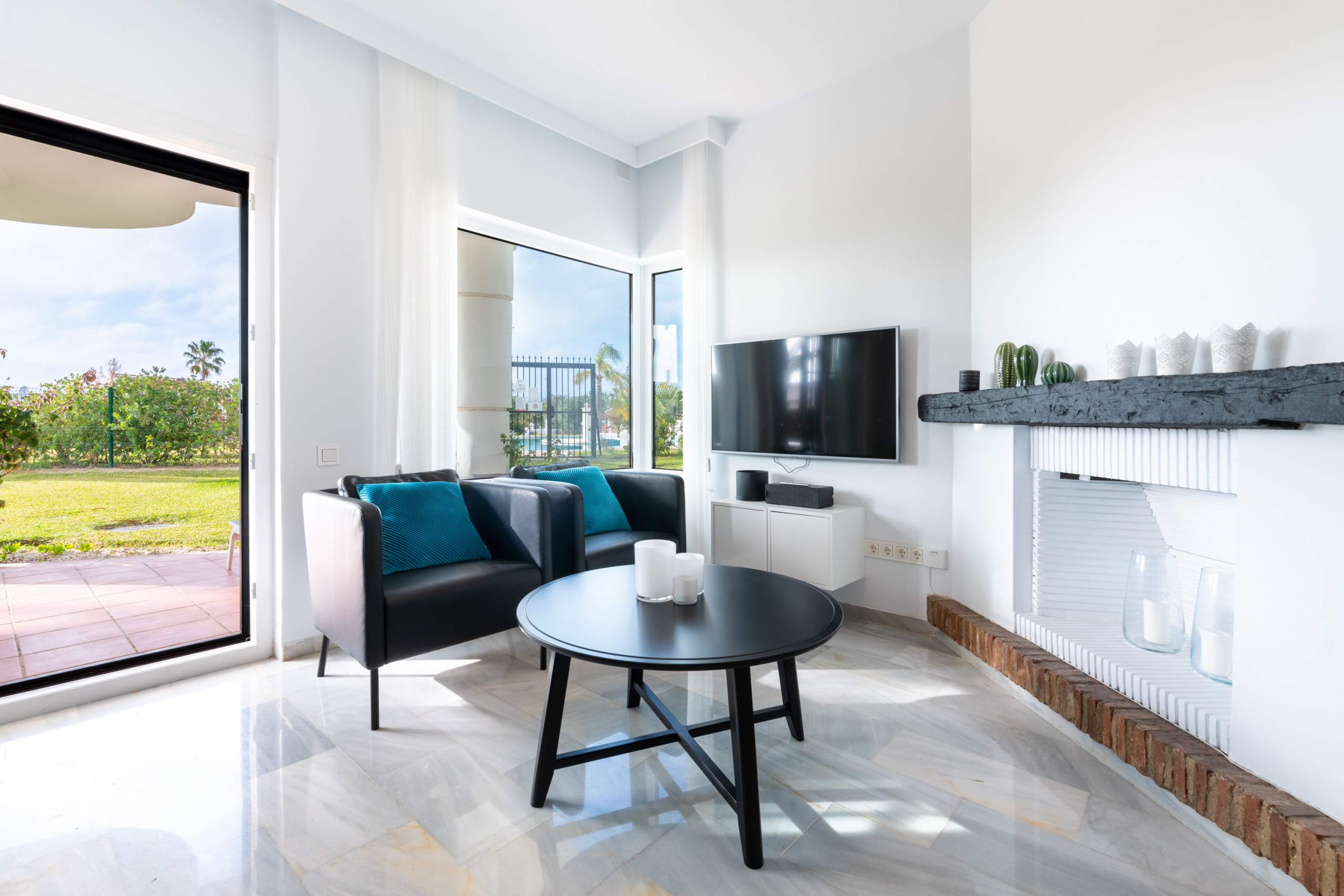 The apartment is 80m² and is nicely furnished with a Scandinavian touch and contains a fully equipped and newly installed kitchen, 2 bedrooms, 2 bathrooms and a cosy terrace with beautiful garden and pool views. Kitchen is fully equipped with oven, microwave, dishwasher, coffee machine etc. Next to the kitchen you have the living room which contains a nice dining area and a cosy sofa area. Satellite TV with international channels and a high-speed internet connection.