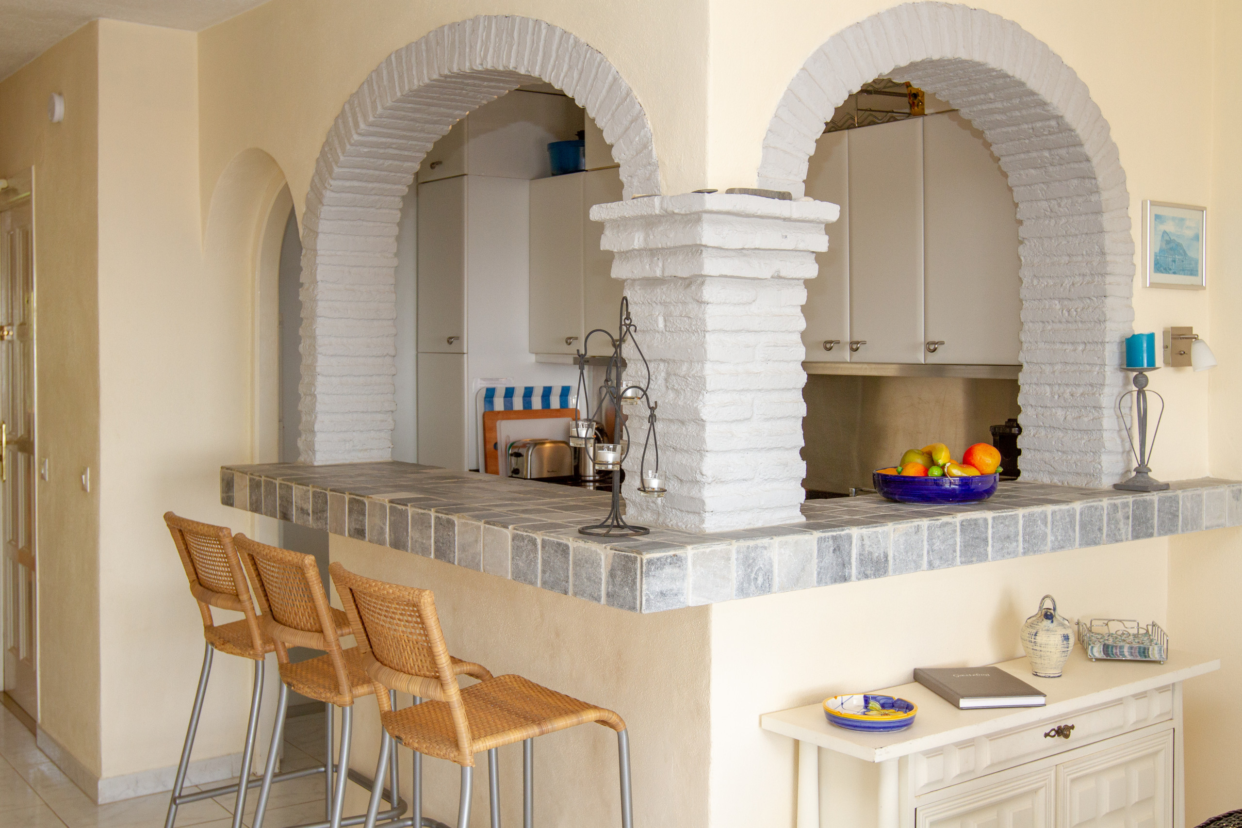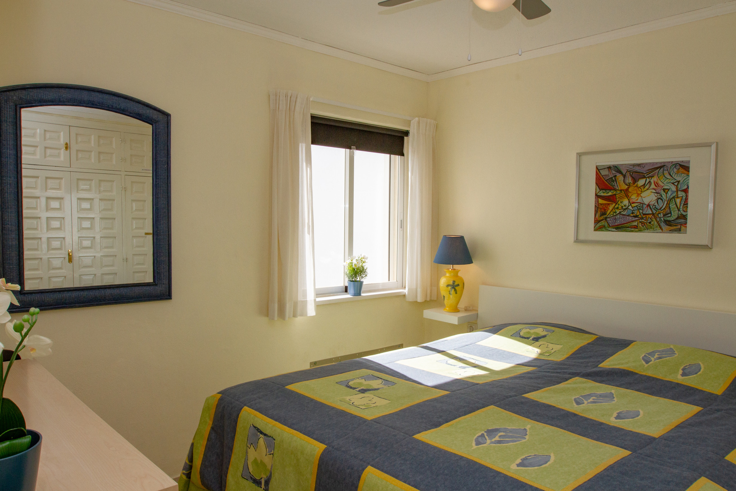 The kitchen is fully equipped with refrigerator, freezer, oven, etc. Next to the kitchen you have the living room which contains a dining area and a cosy sofa area, where you will find a TV with lots of different TV channels such as English, French, German, Russian, Scandinavian, etc.. From the living room there is direct access to the terrace where there is a beautiful view to the Mediterranean Sea. The terrace contains garden furniture where you can enjoy a meal.
