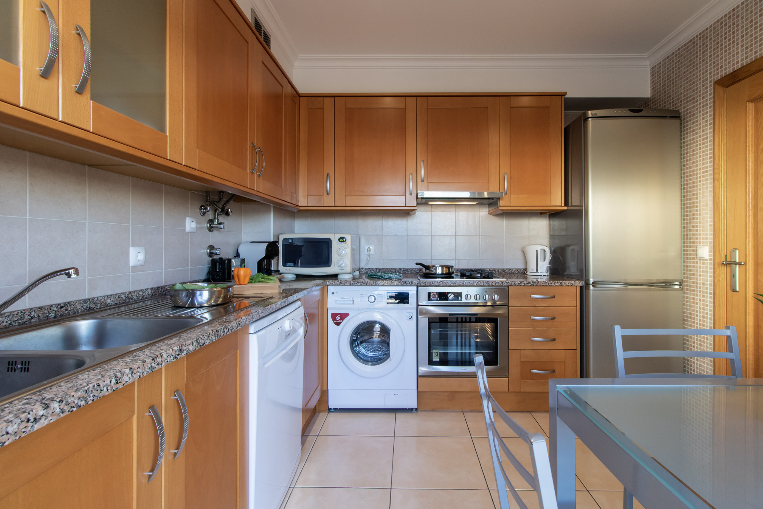 Tem uma cozinha totalmente equipada com micro-ondas, torradeira, máquina de café, forno, placa, máquina de lavar roupa e loiça, entre outros acessórios essenciais.