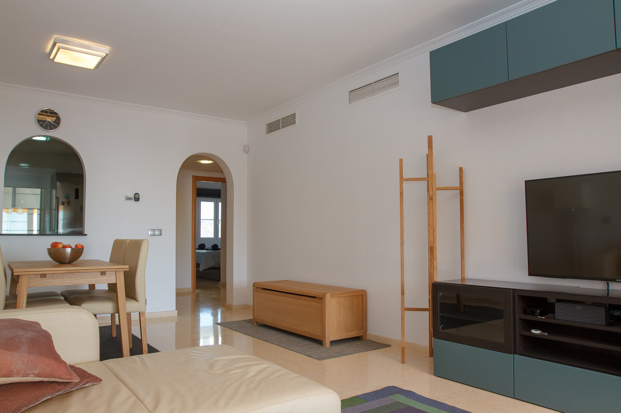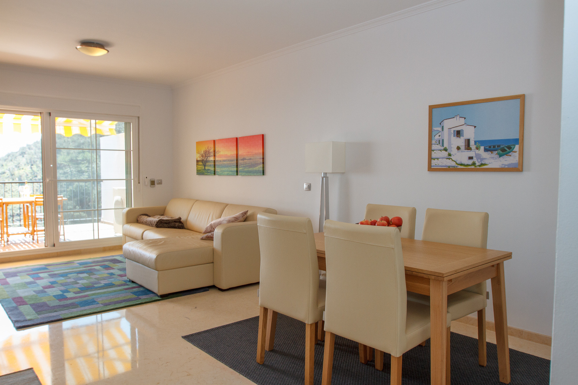 The living room is located next to the fully equipped kitchen, and there is an inside "window" connecting the two rooms. The living room also has sliding glass doors that lead you out onto the terrace, and the apartment provides a wonderful light and an open and airy feel.
