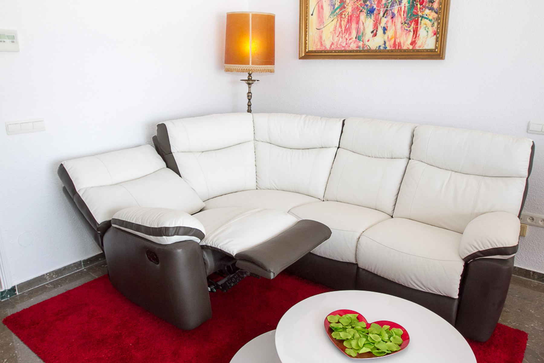 The living room is arranged with a nice dining table arrangement, comfortable leather sofa with footrests and back that can be folded down, 55 "flat screen TV. The kitchen is fully equipped with dishwasher, washing machine, oven, microwave and cozy dining area for 2 people.