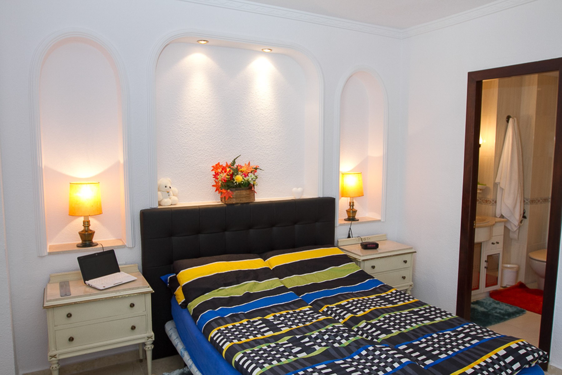 The apartment includes; a nice hall, 2 spacious bedrooms. Master Bedroom contains a double bed, built in wardrobe and bathroom en-suite with bath. The second bedroom contains 2 single beds, built in wardrobe and desk. Both bedrooms have like the rest of the apartment built-in air conditioning. The apartment's second bathroom can be found in the hallway and includes a bathtub.