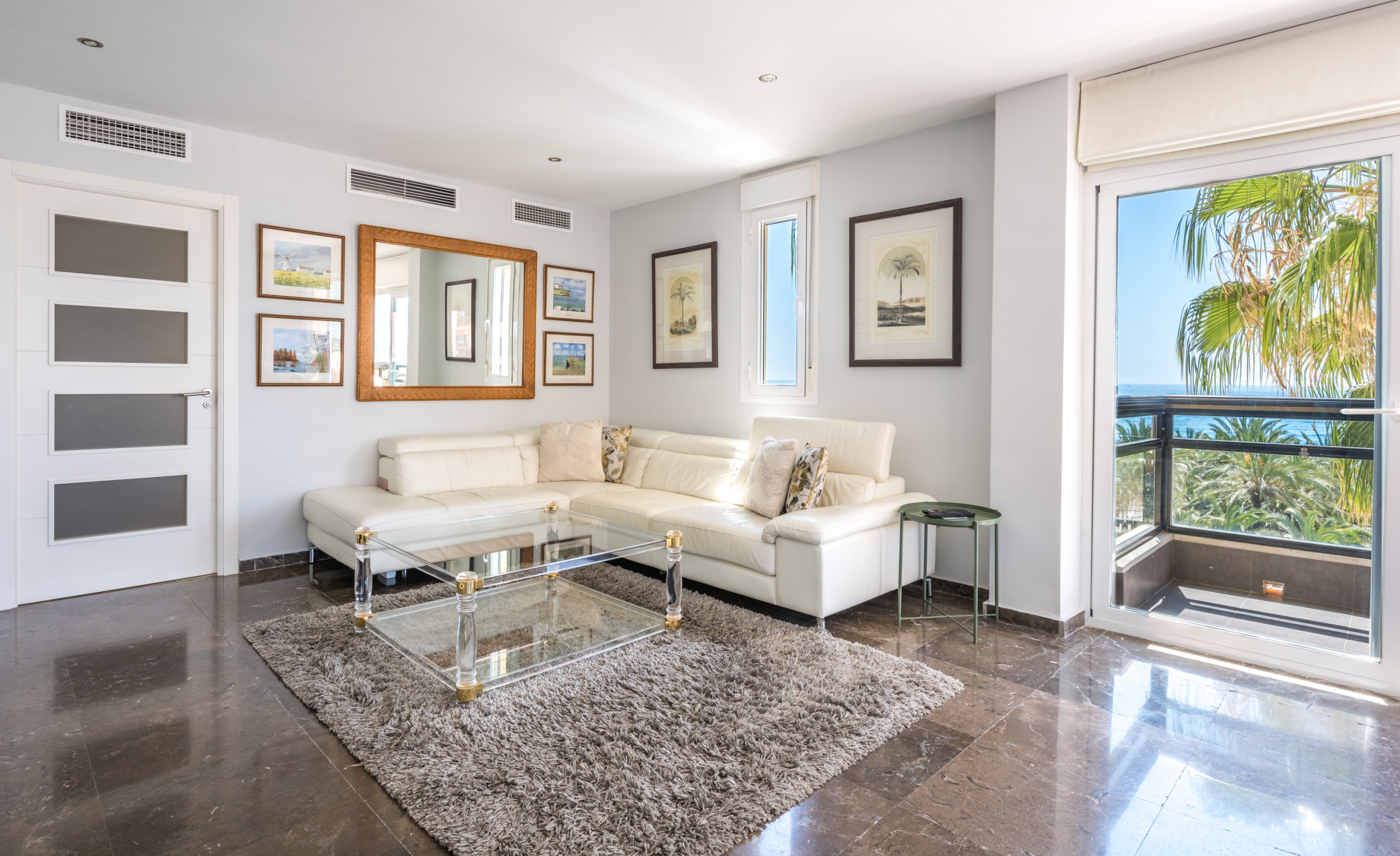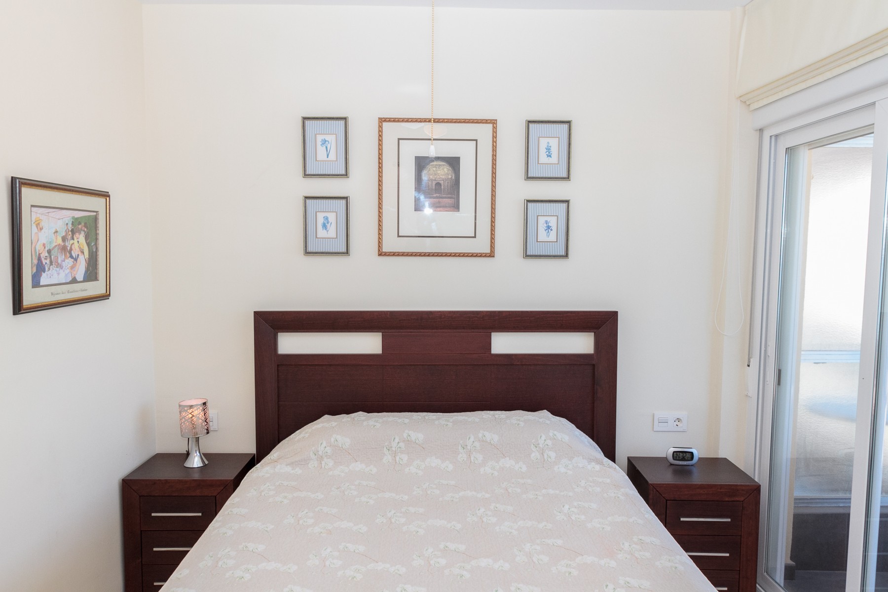 The apartment is on the 4th floor and there is of course an elevator. It is a corner apartment, which means that there is a possibility of the sun on one of the terraces throughout the day. You can start with a nice morning coffee on the east-facing terrace, which belongs to one bedroom and has a view of both the beach and to Malaga. The corner terrace is south-west facing and superbly furnished with chairs, tables and awnings.