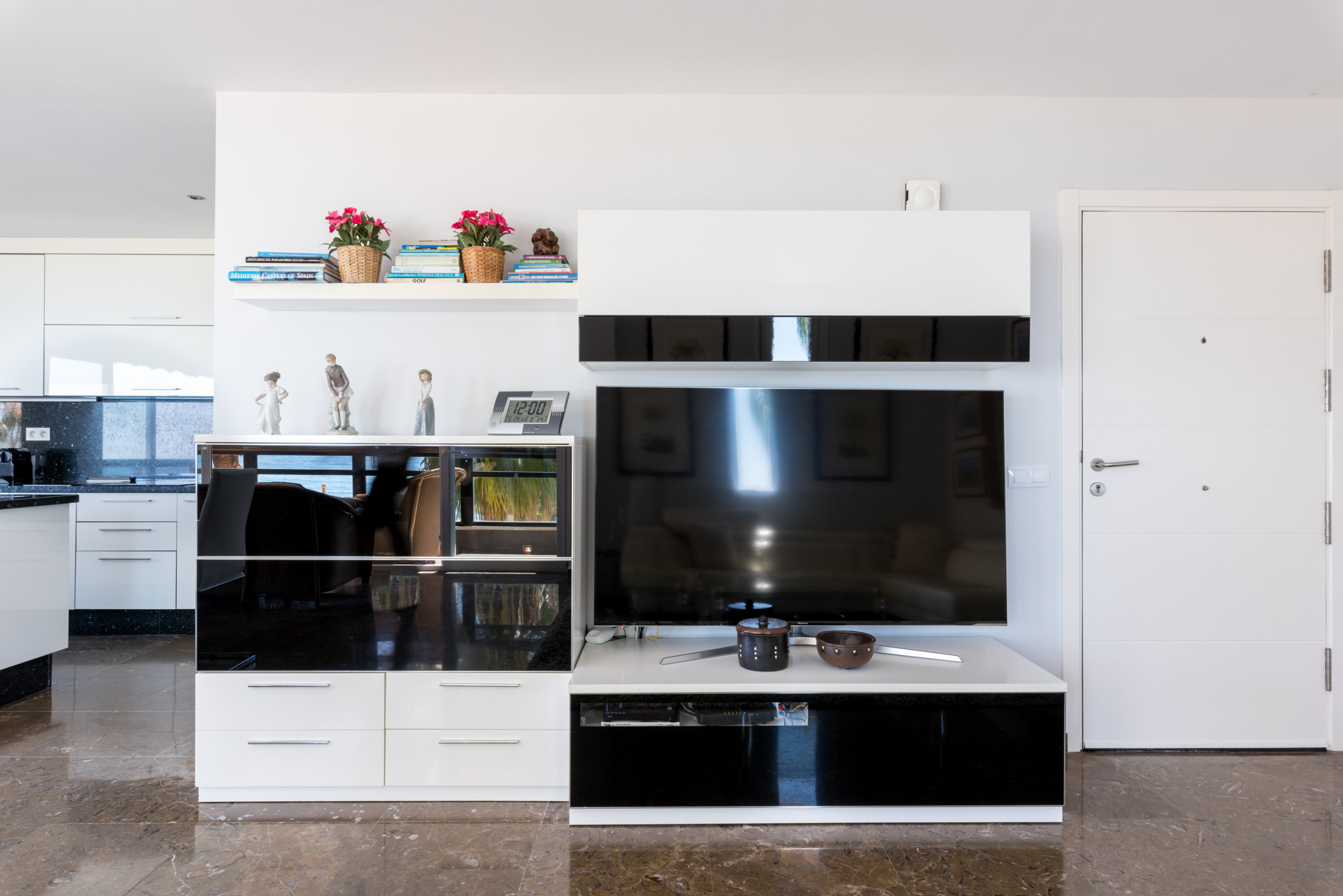 The interior is really nice and the whole apartment is beautiful furnished with quality furniture. The central room in the apartment is the open kitchen / dining area with direct access to the terrace. The kitchen is fully equipped including dishwasher, oven and a built-in deep fryer if you even want to try to make some of the delicious deep fried calamares. There is a small larder attached to the kitchen which includes a washing machine.