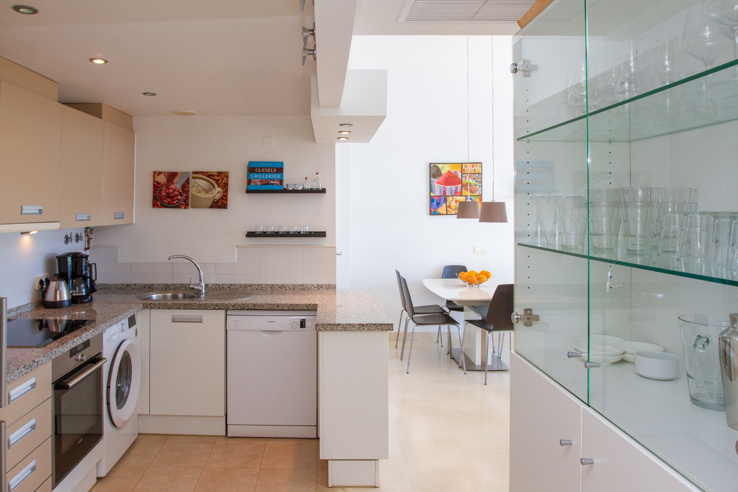 ✔️ Cozinha aberta totalmente equipada: frigorífico/congelador, forno, micro-ondas, máquina de lavar louça, máquina de lavar roupa, cafeteira e louça para 8 pessoas