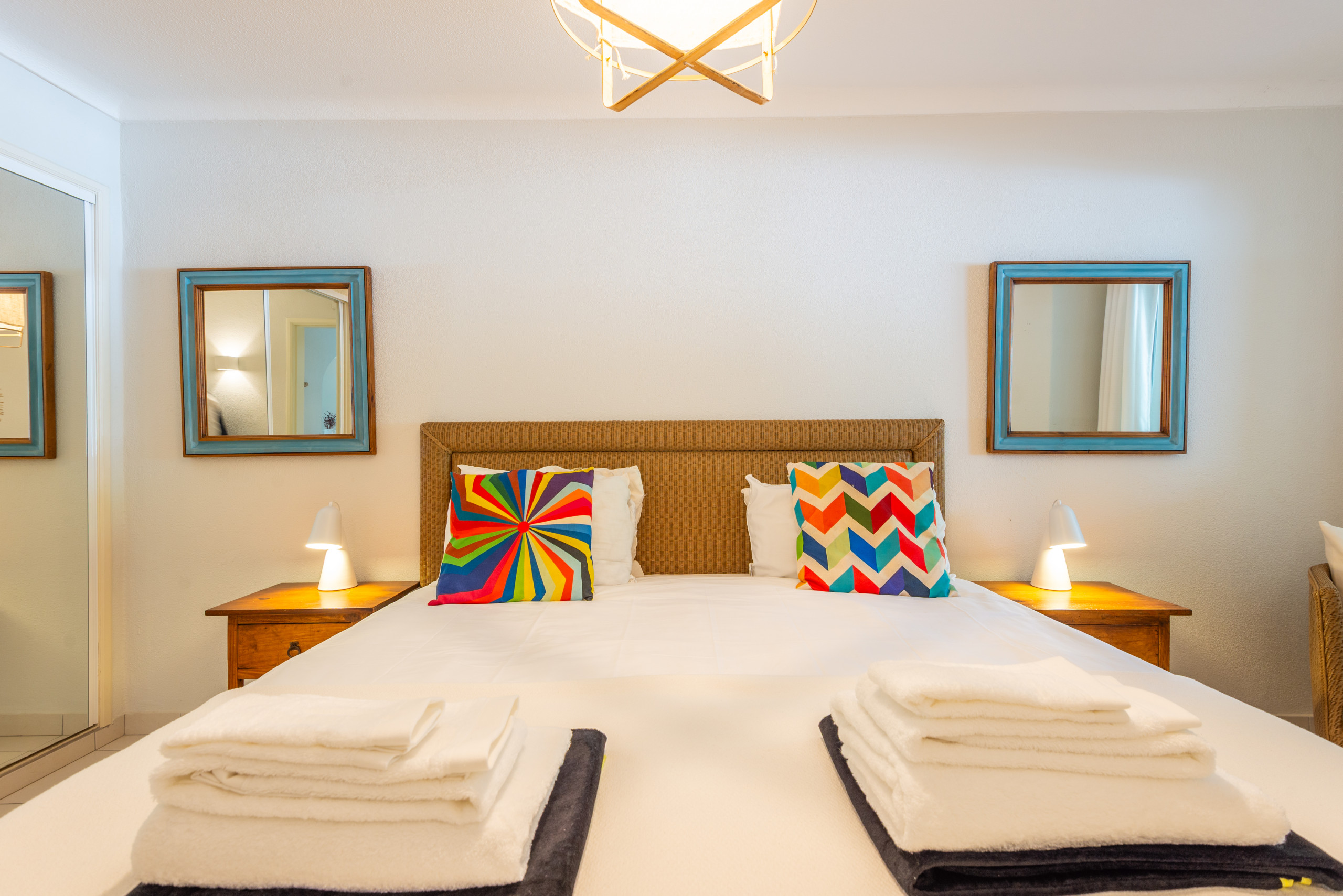 O apartamento possui dois quartos espaçosos com cama de casal e duas casas de banho com chuveiro, garantindo alojamento confortável para famílias ou grupos de amigos. Mantenha-se ligado com WiFi gratuito e desfrute do controlo de clima com ar condicionado em toda a sala de estar.