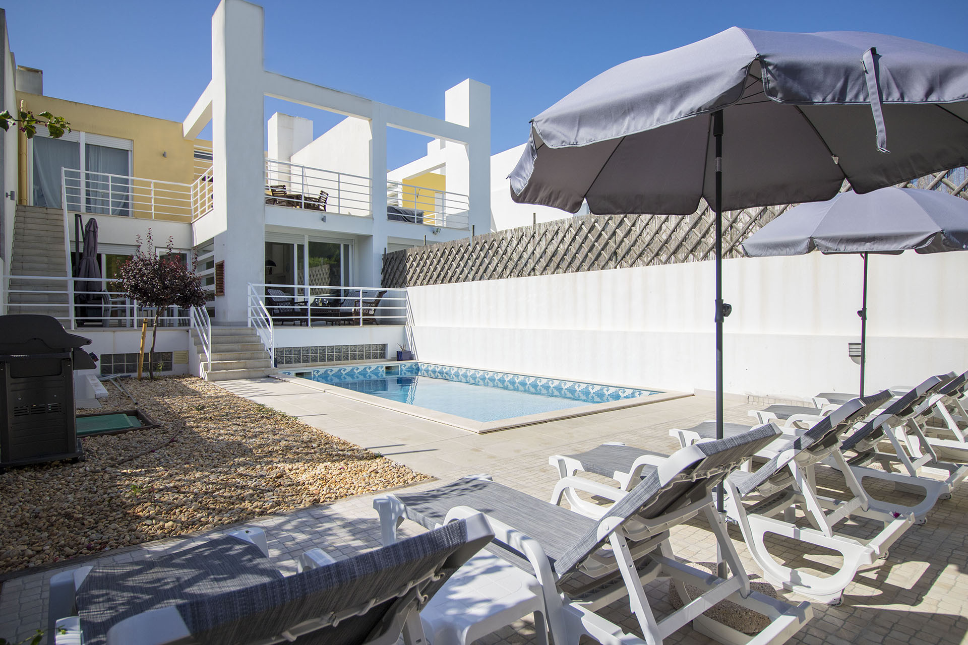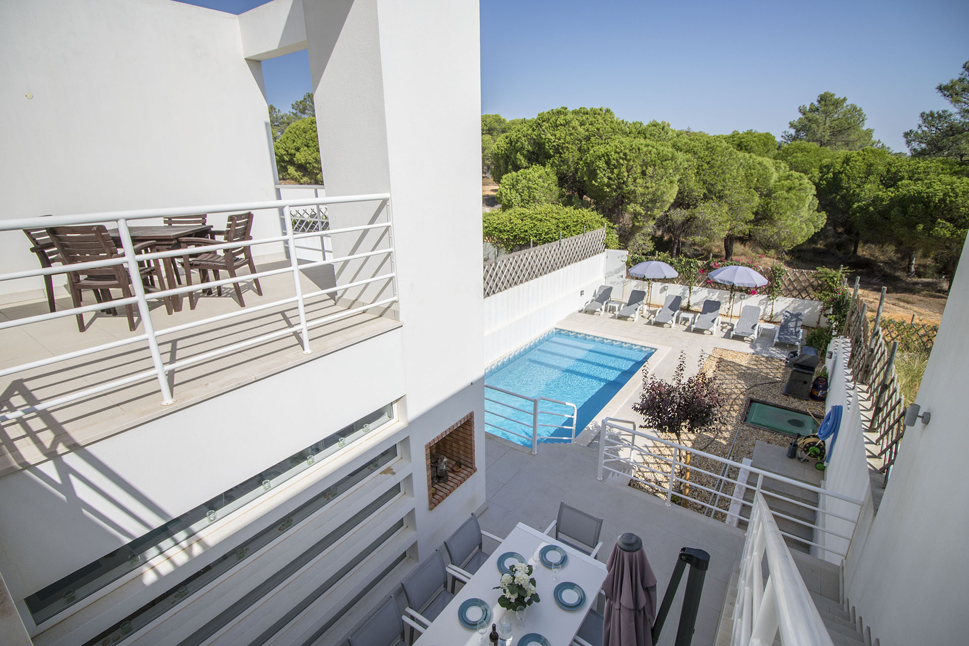 Existe um barbecue a gás para os seus churrascos, uma mesa de exterior com lugar para 8 pessoas, sofás de exterior e um terraço no primeiro andar com mais uma mesa 4 cadeiras.