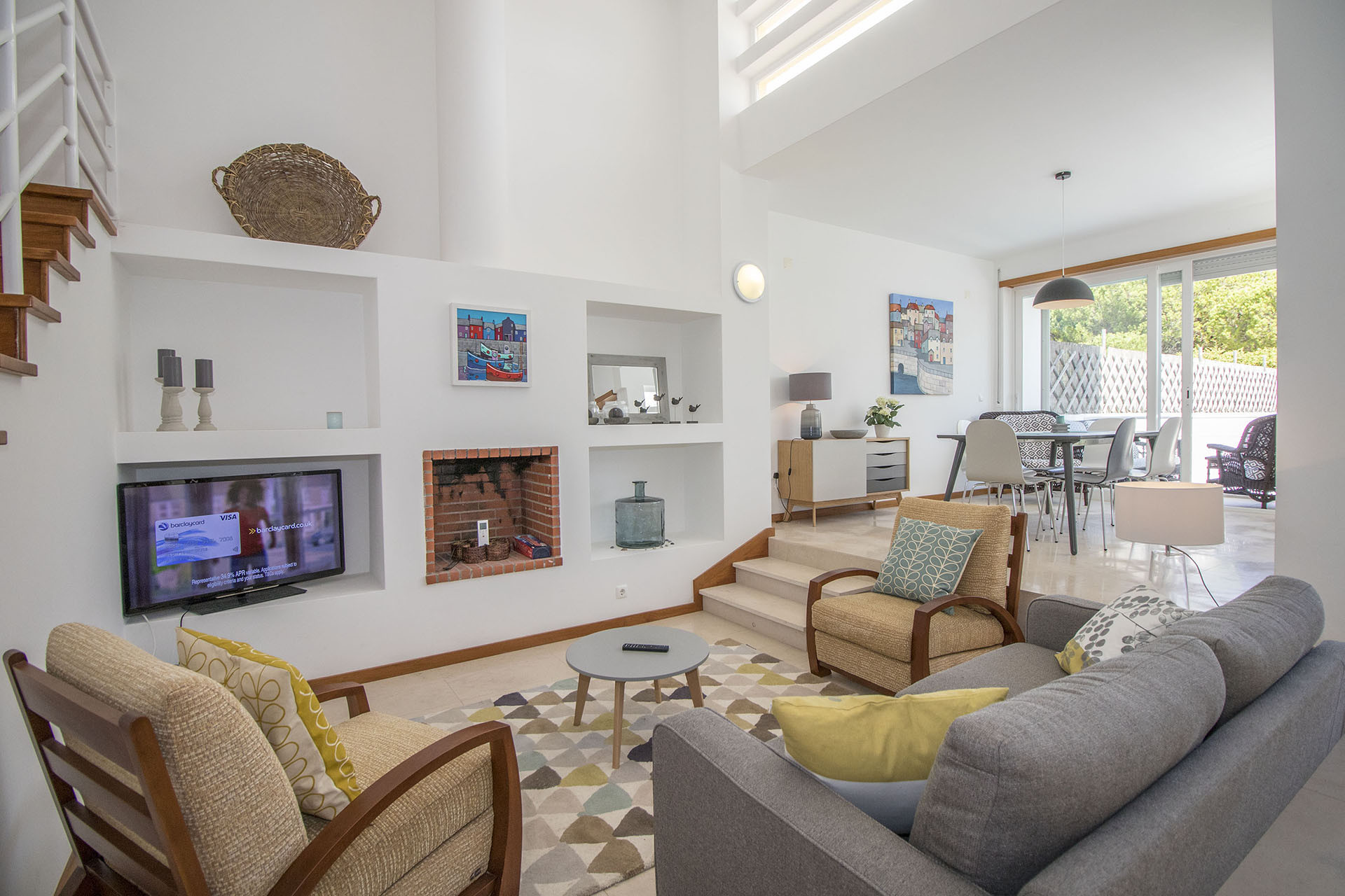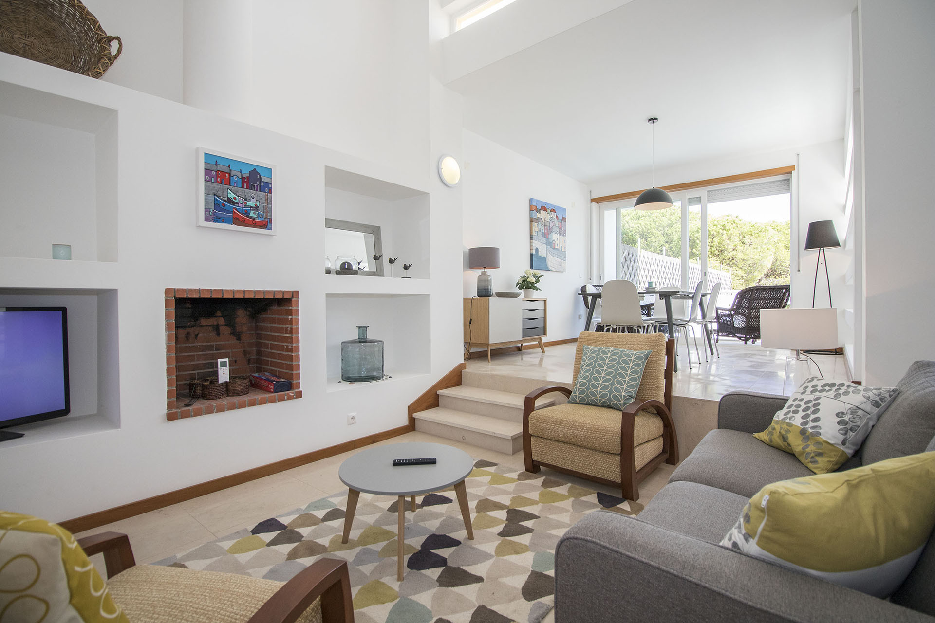 A sala é bastante luminosa, está harmoniosamente decorada e equipada com televisão de ecrã plano apoiada por canais por cabo, existe ligação à internet por Wi-Fi e conta com ar condicionado para os dias mais quentes. A um nível ligeiramente mais elevado temos a área de jantar composta por mesa e cadeiras e que através de uma porta de correr nos permite acesso a um terraço diretamente por cima da piscina. Este terraço conta com um conjunto de mobília de exterior.