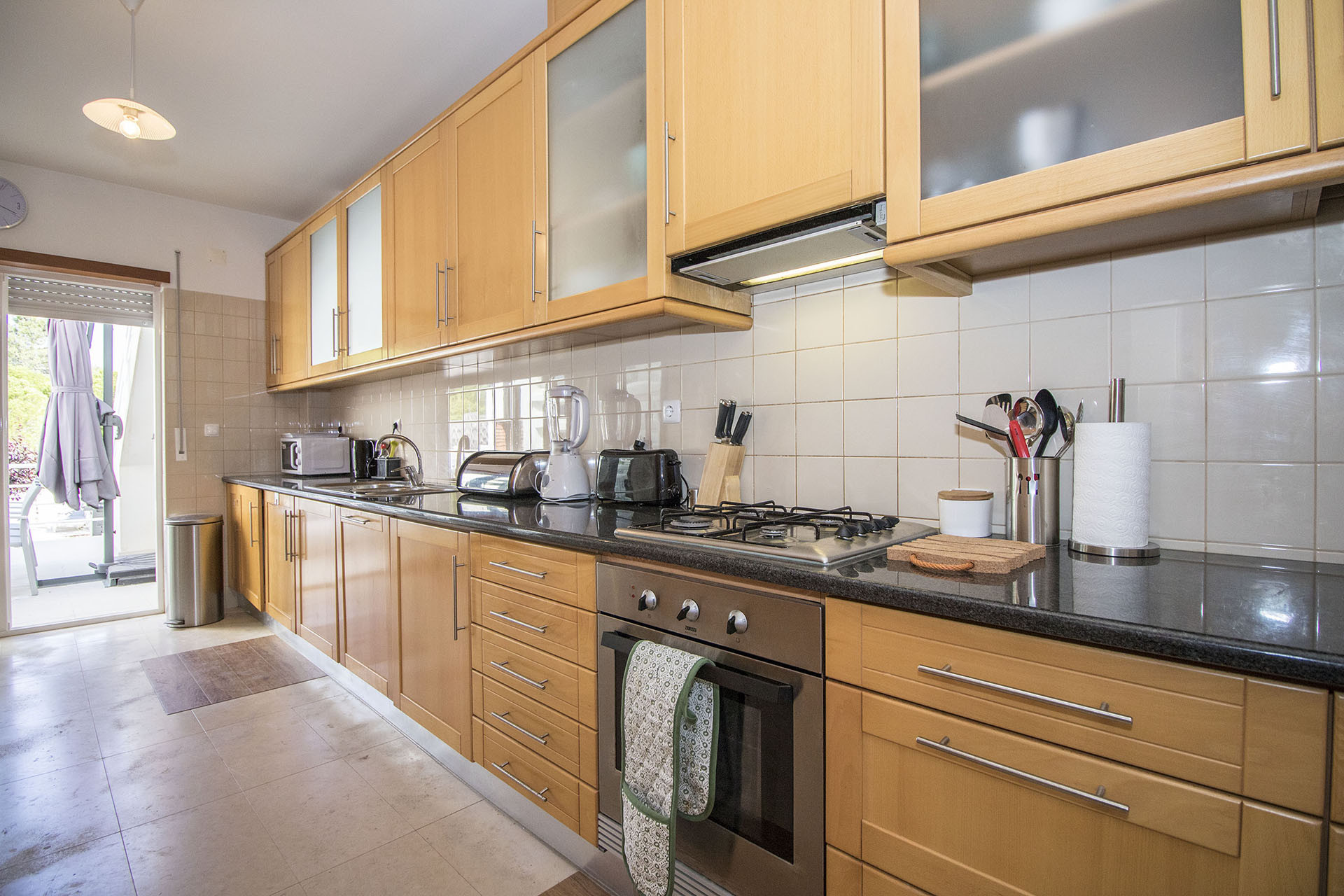 Ao lado da sala temos a cozinha, totalmente equipada e com acesso direto à zona de refeições exteriores.