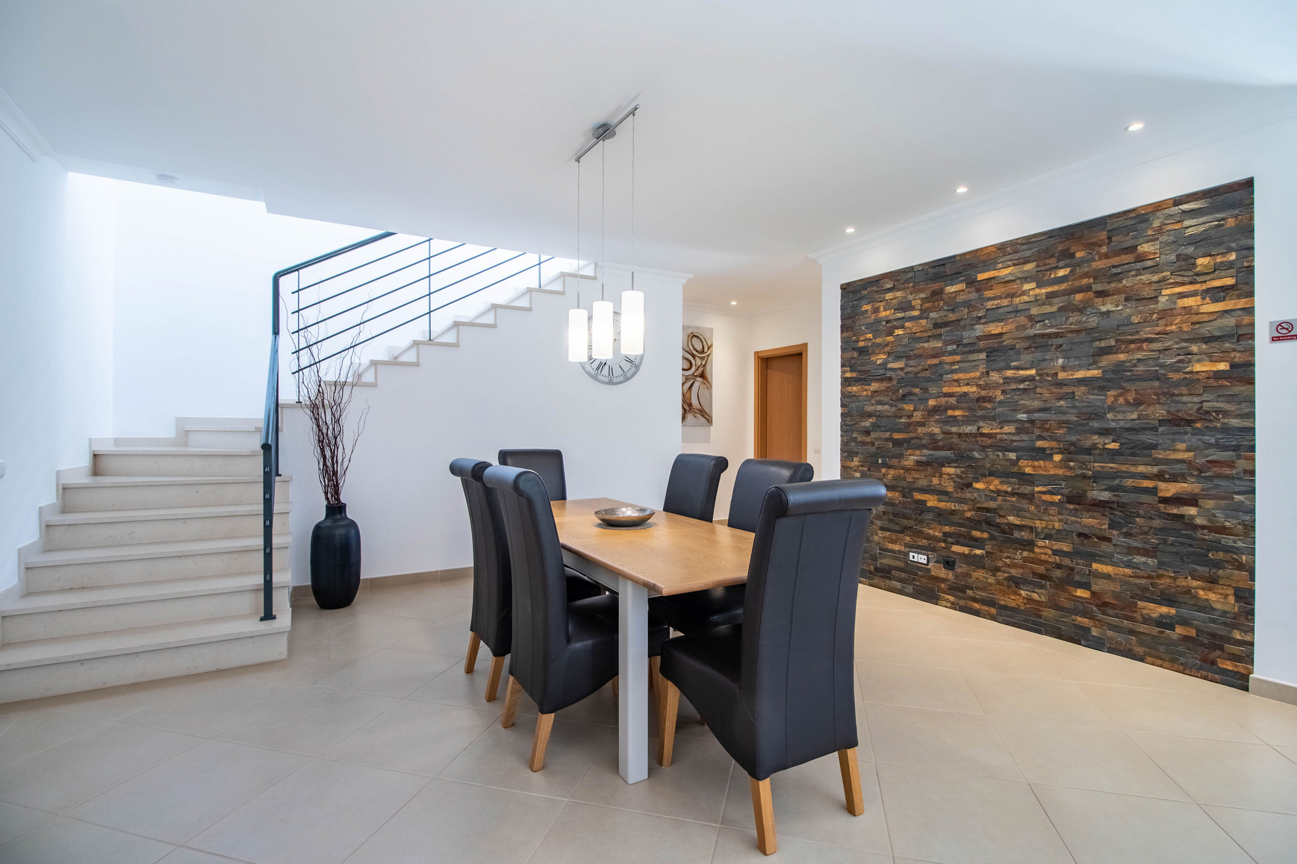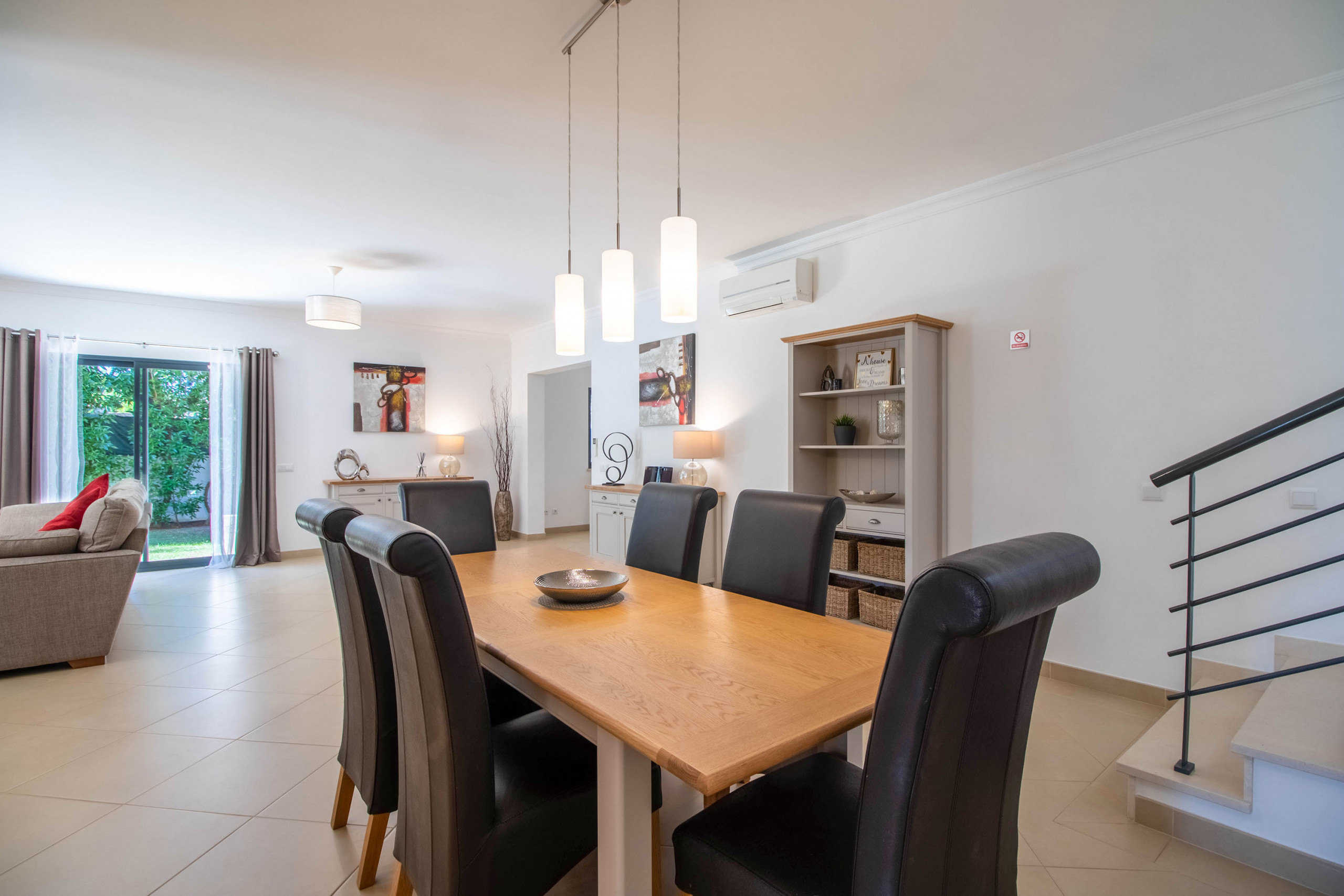 A espaçosa sala, de decoração moderna, com mesa ampla para refeições, tem janelas de correr que dão acesso ao jardim e piscina. A sala de estar está equipada com ar condicionado, TV de ecrã plano com canais portugueses e ingleses por satélite, leitor de DVDs, filmes e uma consola de jogos WII, com alguns jogos. Existe também acesso à internet.