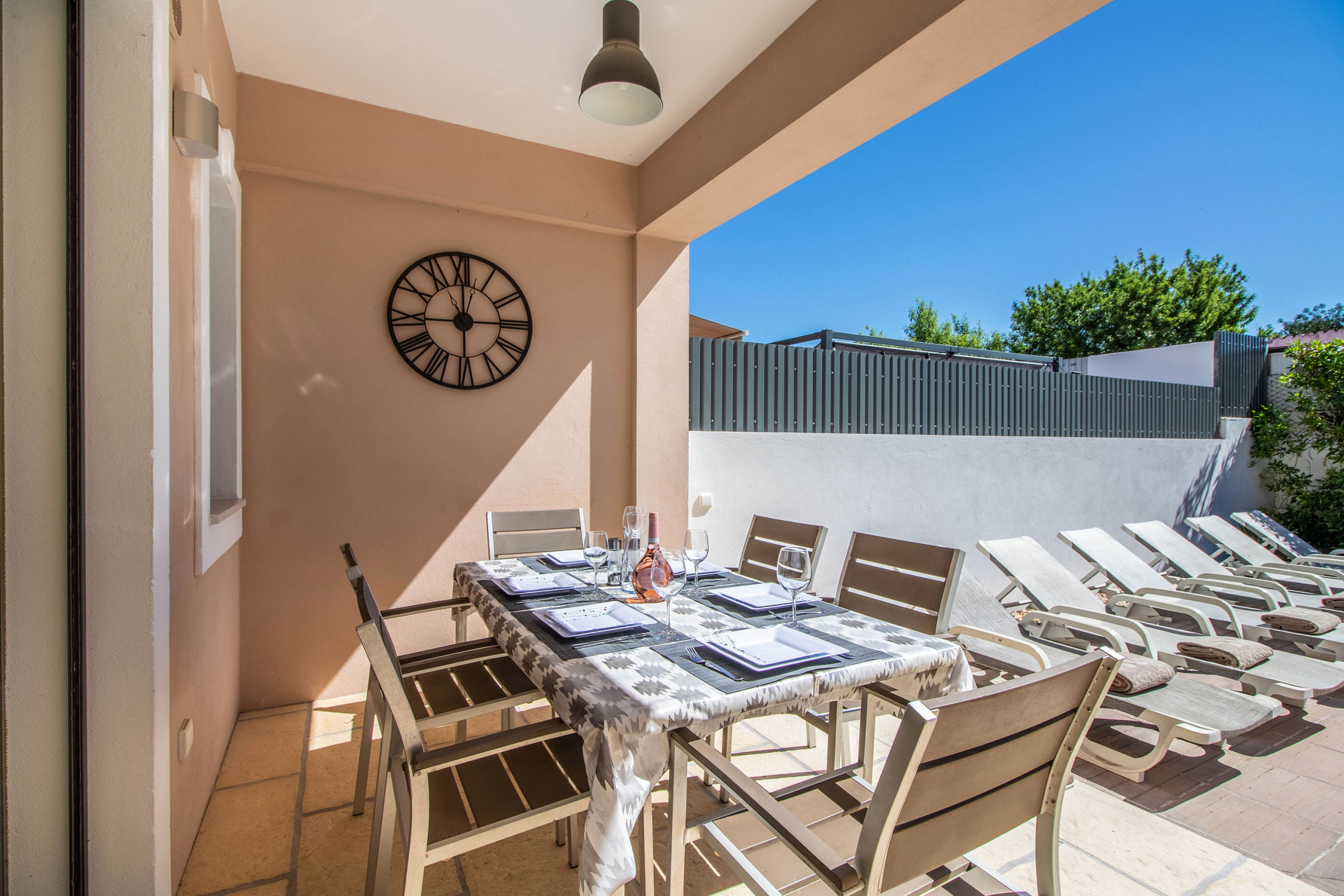 Jardim privado, rodeado de arbustos e murado, relvado para as brincadeiras das crianças, com pavimento a imitar deck a envolver a piscina, várias espreguiçadeiras e sofás exteriores para disfrutar do sol e ar livre, área de refeições exterior com mesa e cadeiras confortáveis servida por um barbecue a carvão. Área muito agradável e bastante privada e tranquila para desfrutar das suas férias.