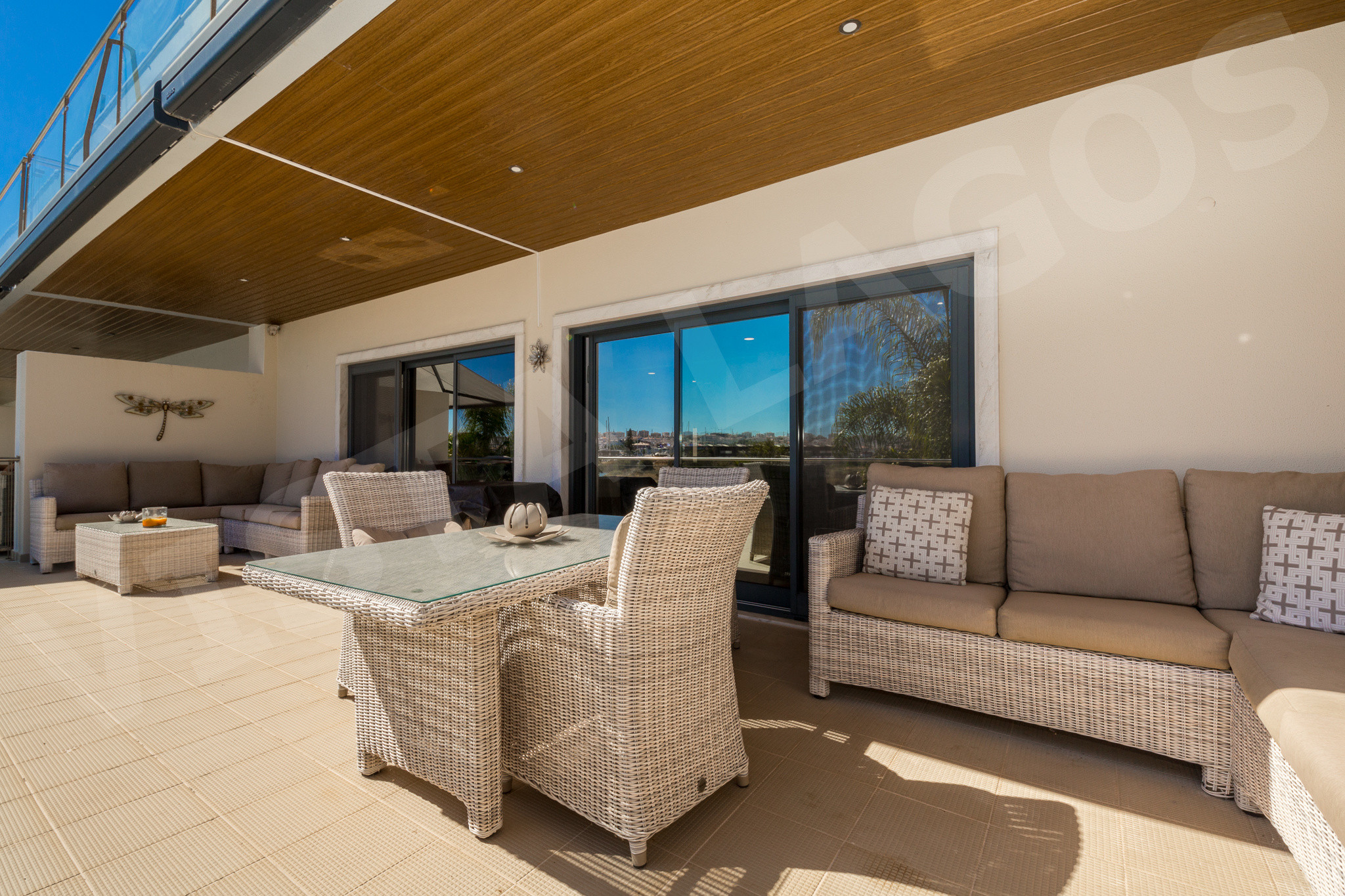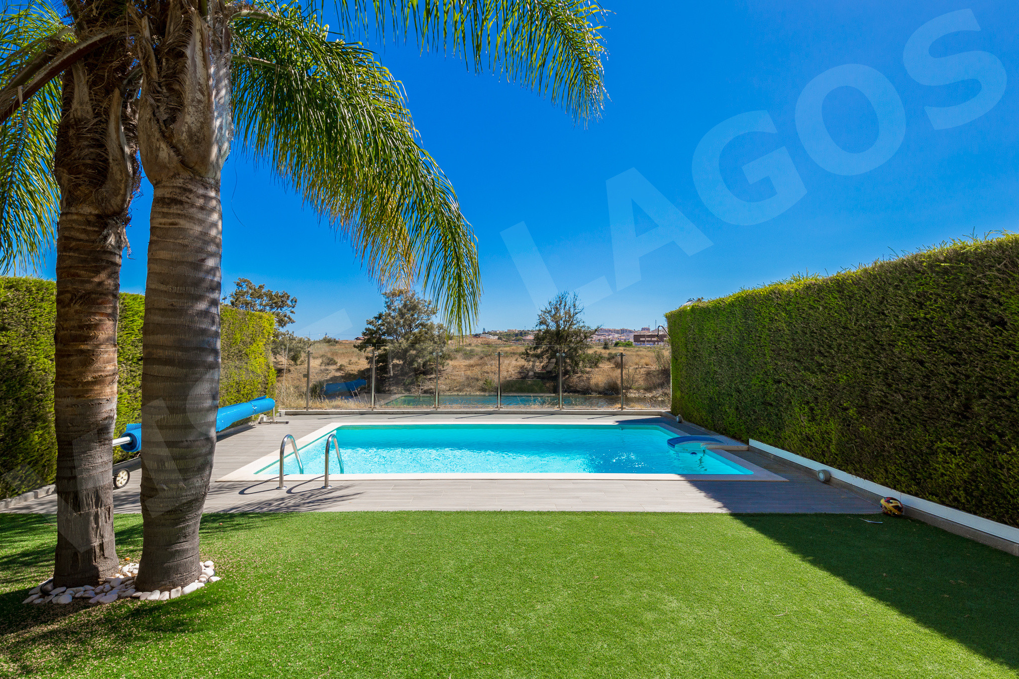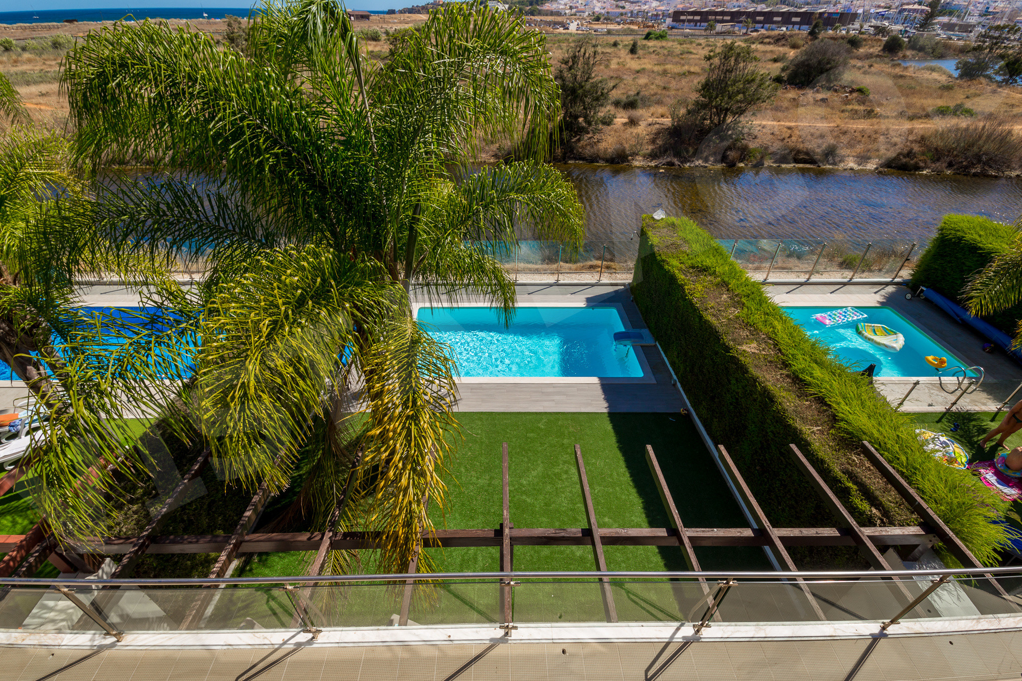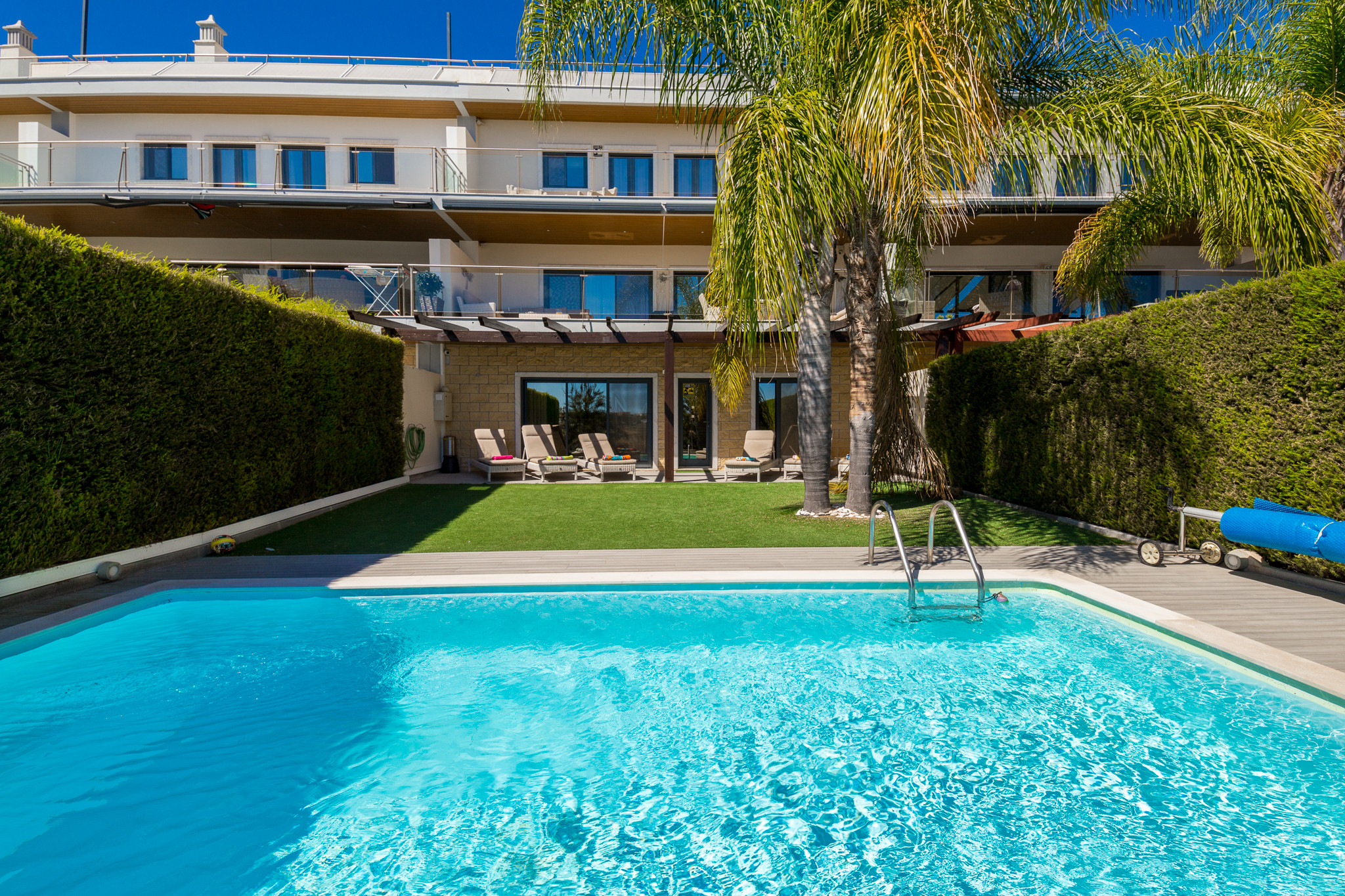 A piscina privativa está rodeada por um belo jardim paisagístico, proporcionando um local tranquilo para tomar banho de sol, nadar e desfrutar de momentos em família. As varandas e terraços oferecem muito espaço para aproveitar o sol do Algarve ou jantar sob as estrelas.