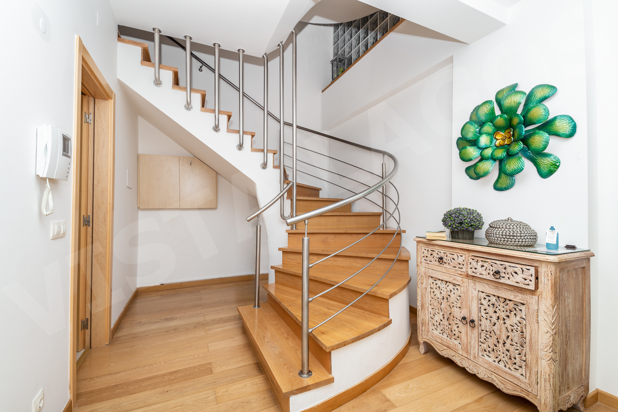 A moradia é cuidadosamente projetada em três níveis, todos ligados por um elevador interno privado para fácil acesso.