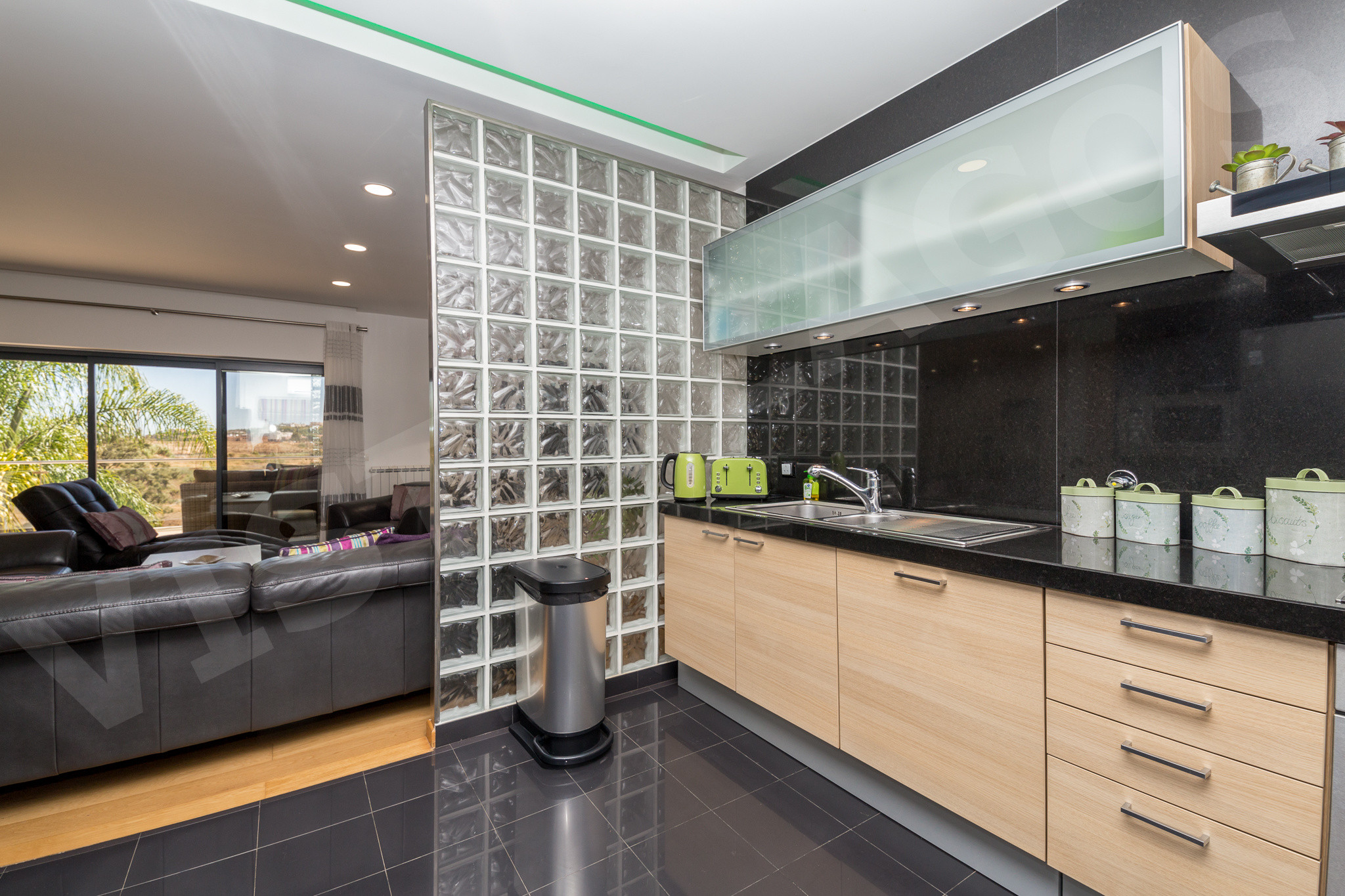 A espaçosa sala de estar e jantar abre para uma grande varanda com vistas deslumbrantes sobre o jardim, a piscina e o horizonte de Lagos.