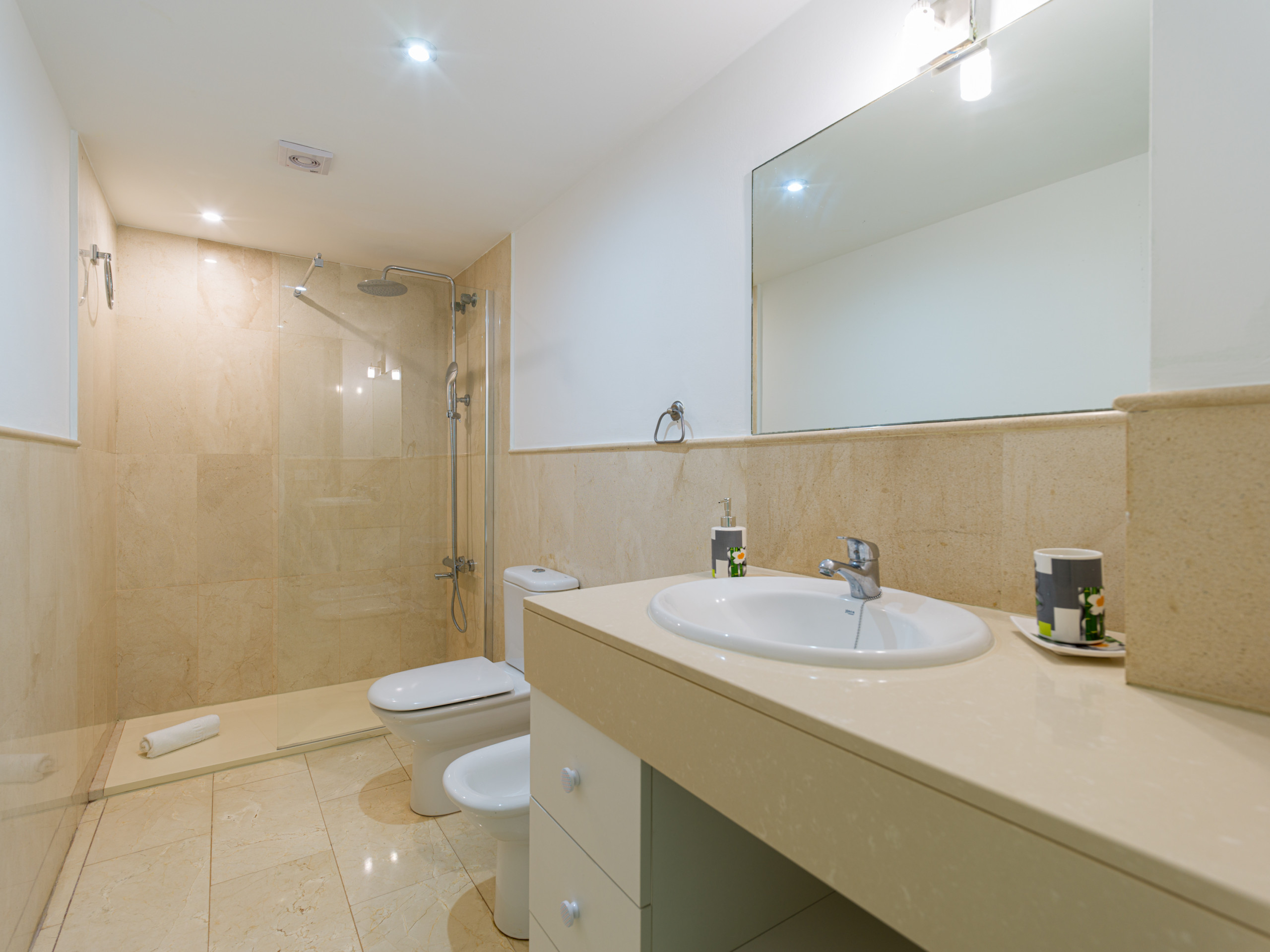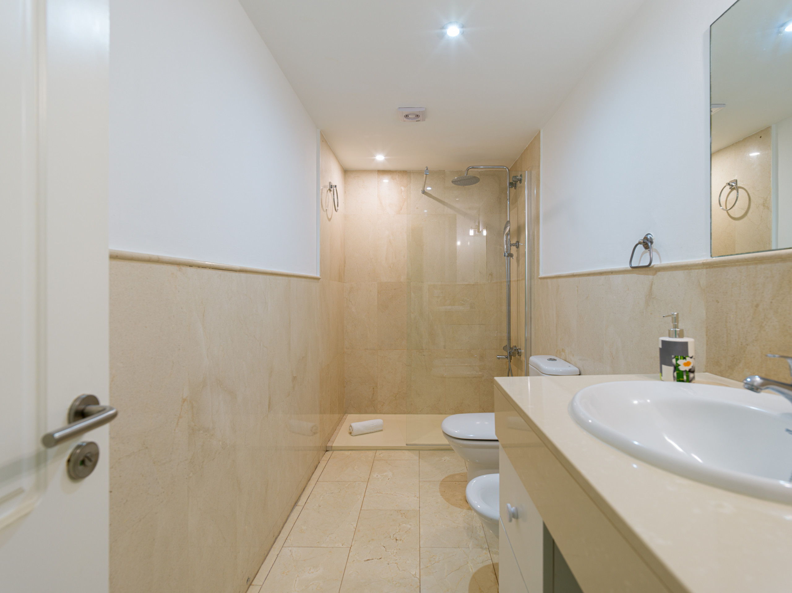 Existe uma casa de banho moderna com piso em mármore e uma cabina de duche ao nível do chão, proporcionando conforto e comodidade.