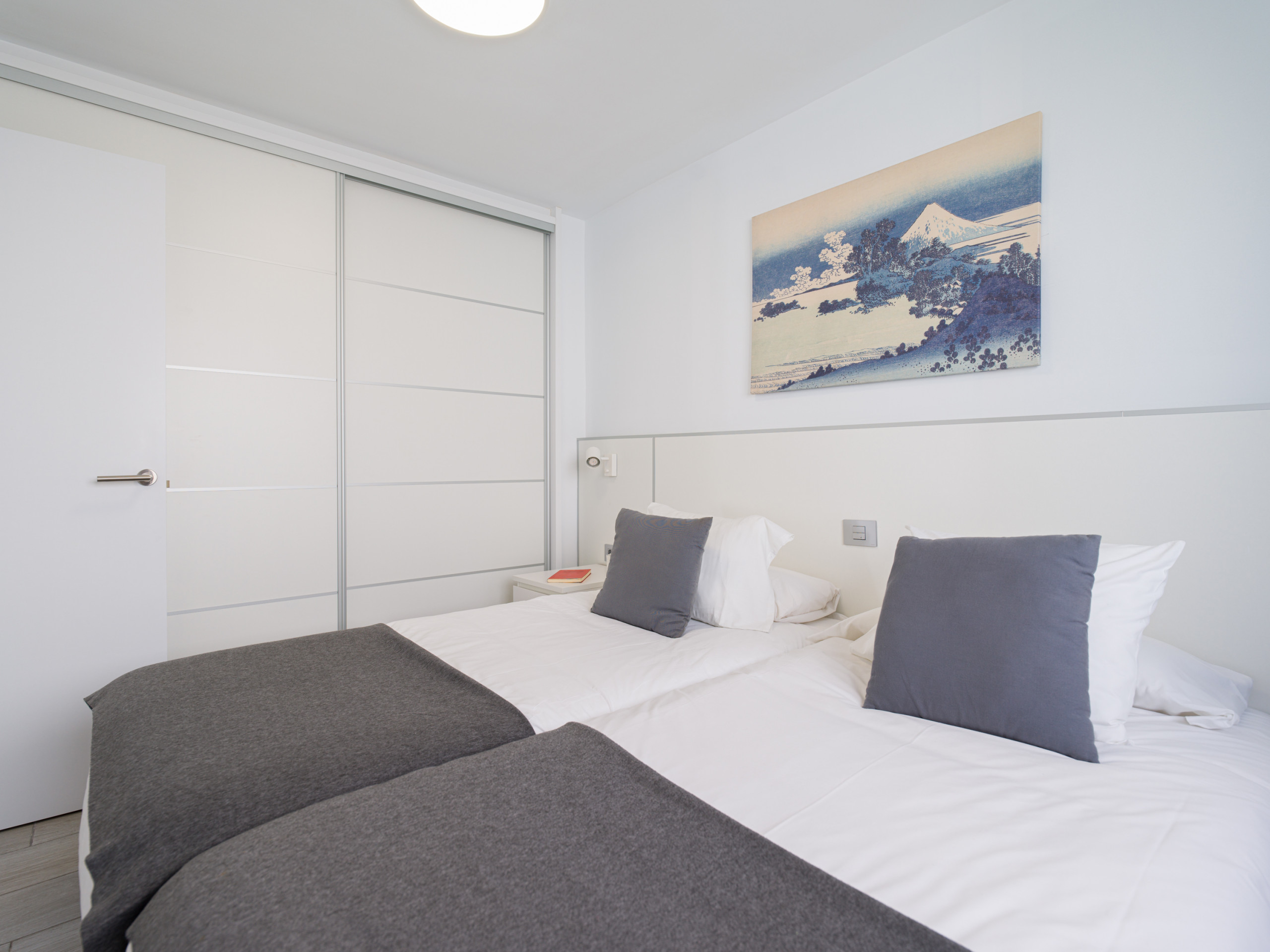 A habitação é composta por 2 quartos - um duplo e outro simples - exteriores muito luminosos. Dispõe também de ampla sala com cozinha integrada e uma fantástica varanda com vista para a tranquila e relaxante piscina e com capacidade para 3 pessoas.