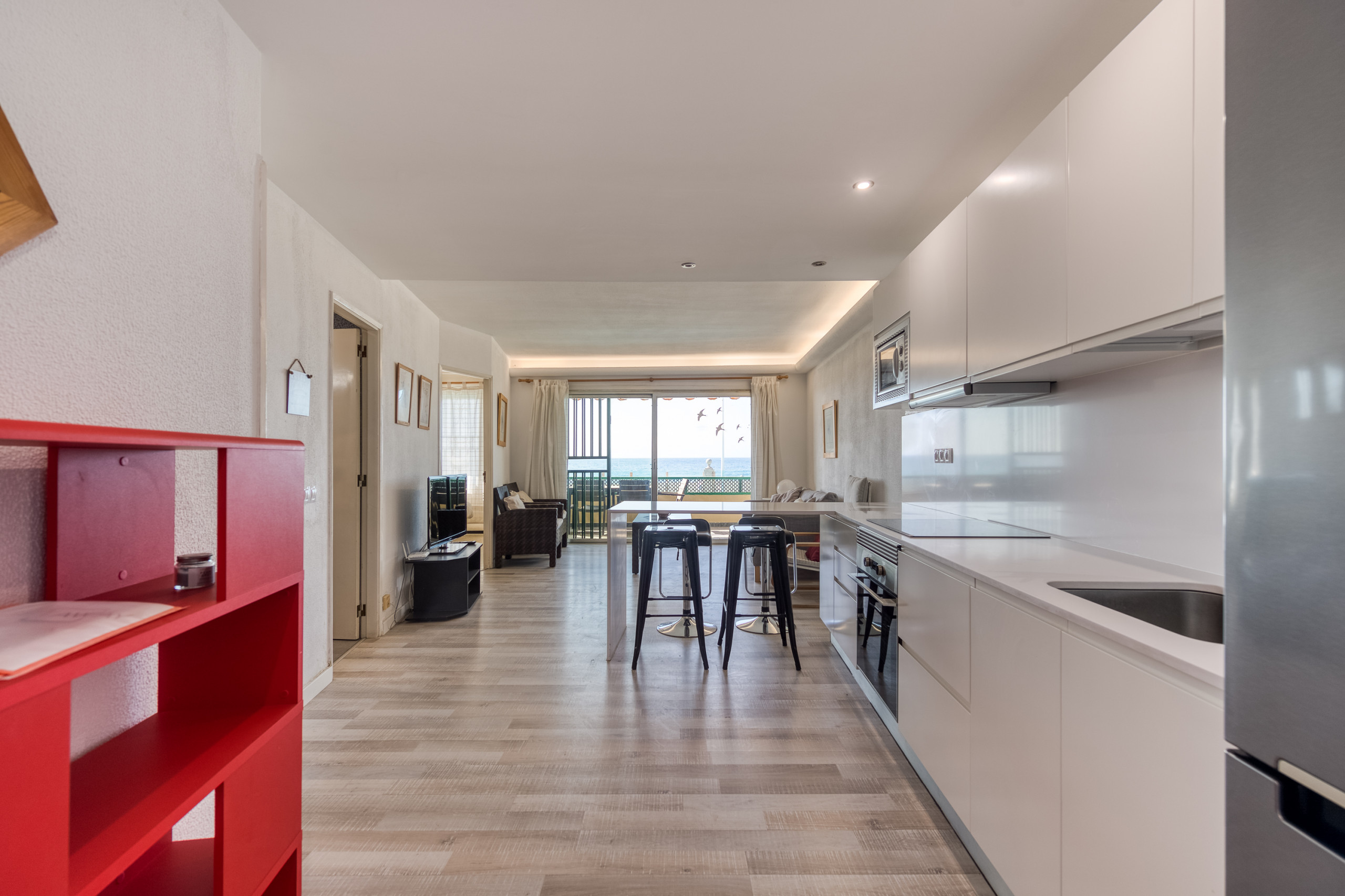 Alojamento de 80 m², com agradável sala de estar com terraço com vista para uma piscina comunitária tranquila e a praia ao fundo.