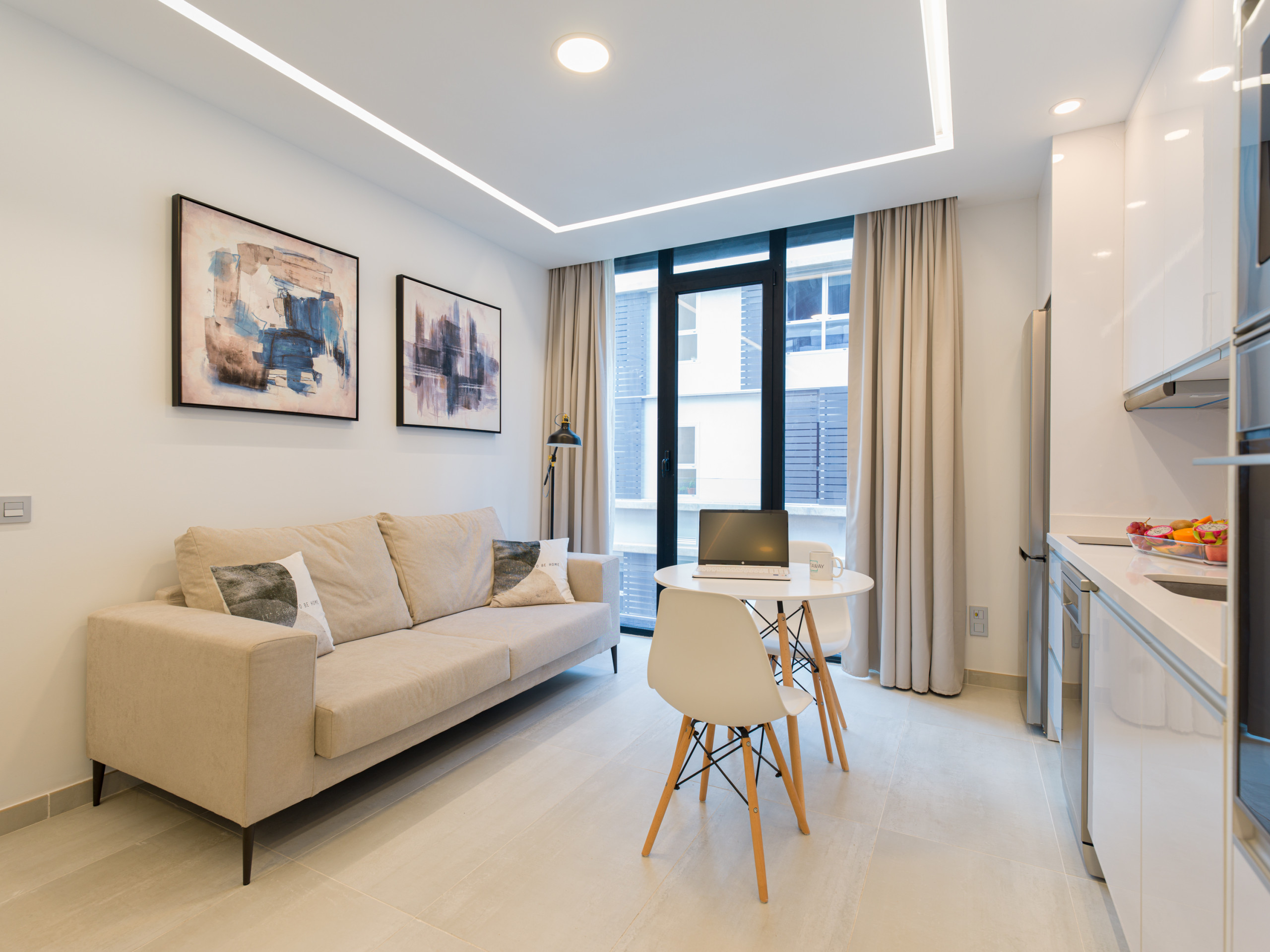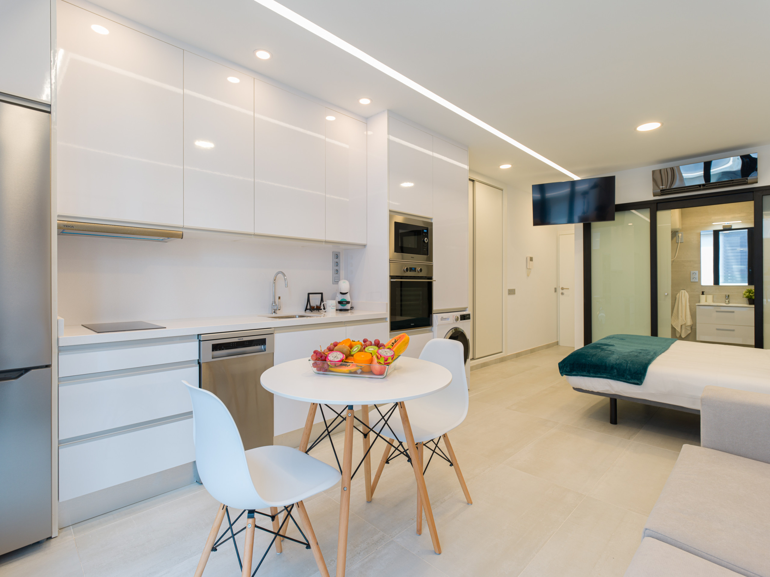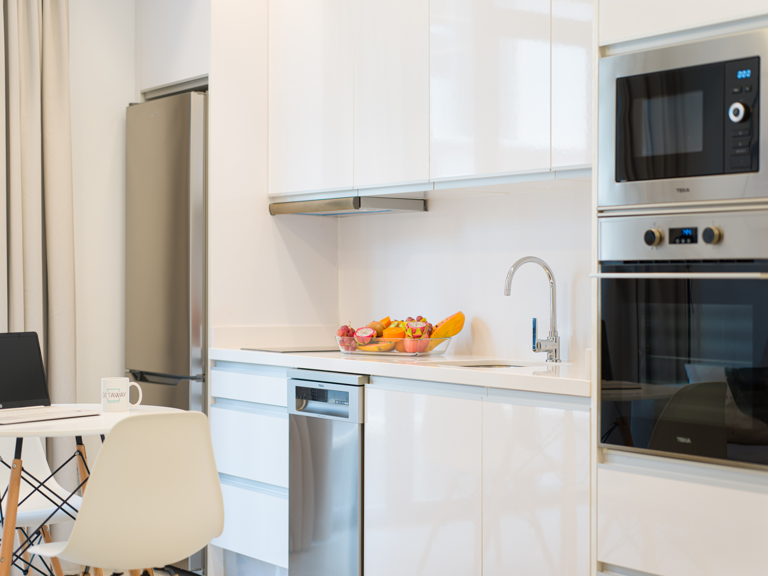 Na cozinha independente de vitrocerâmica, são fornecidos: frigorífico, micro-ondas, forno, congelador, máquina de lavar roupa, secador, máquina de lavar louça, louça/cortador, utensílios de cozinha, máquina de café, torradeira e chaleira.