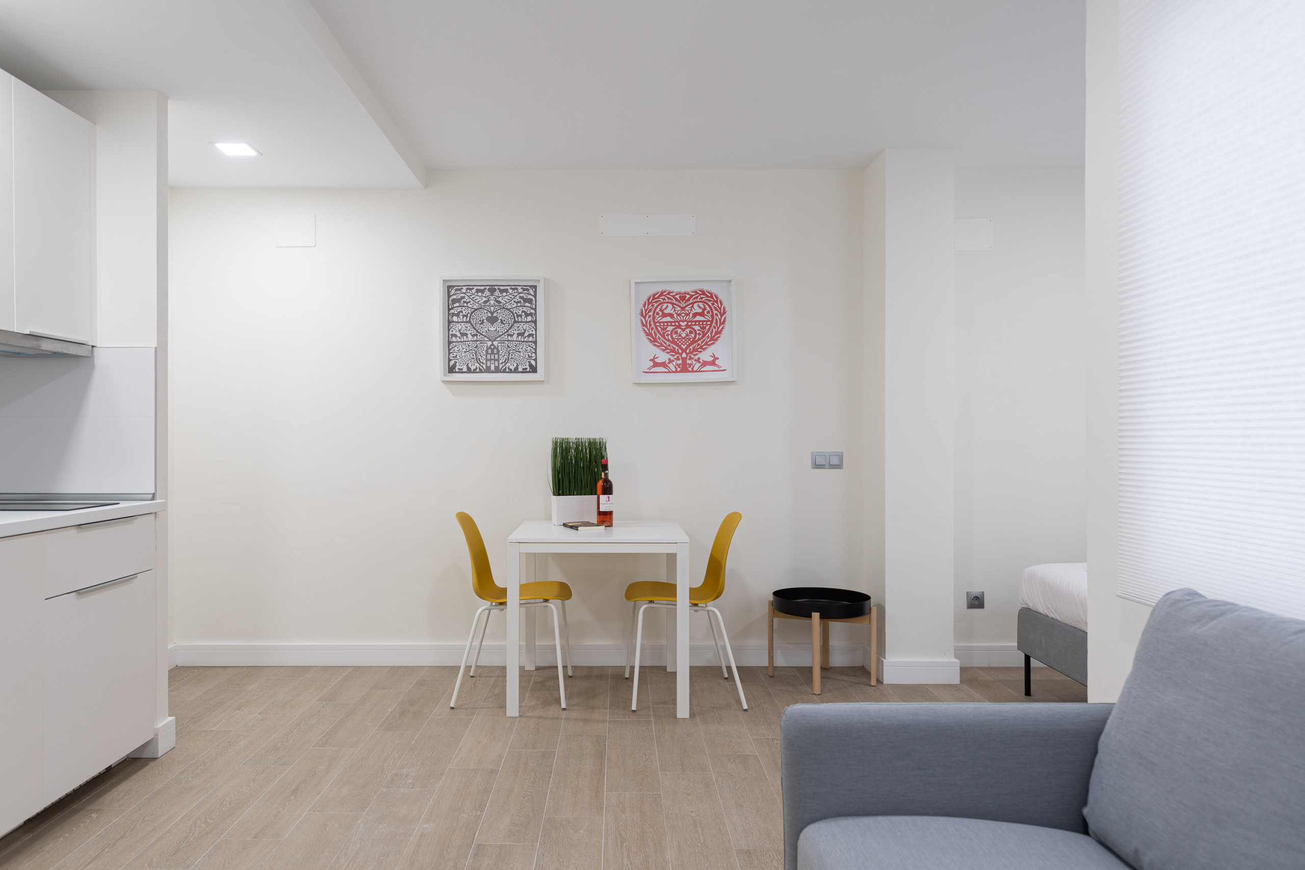 Alojamento de 29 m², interior mas muito iluminado, no terceiro andar, renovado em 2020, acolhedor e funcional. Tem um espaço muito bem utilizado, distribuído na mesma sala. A cozinha, totalmente equipada com frigorífico, microondas, forno, congelador, máquina de lavar roupa, secador, louça/cortinados, utensílios/cozinha, máquina de café, torradeira, chaleira, espremedor e utensílios de cozinha, está integrada no mesmo espaço.