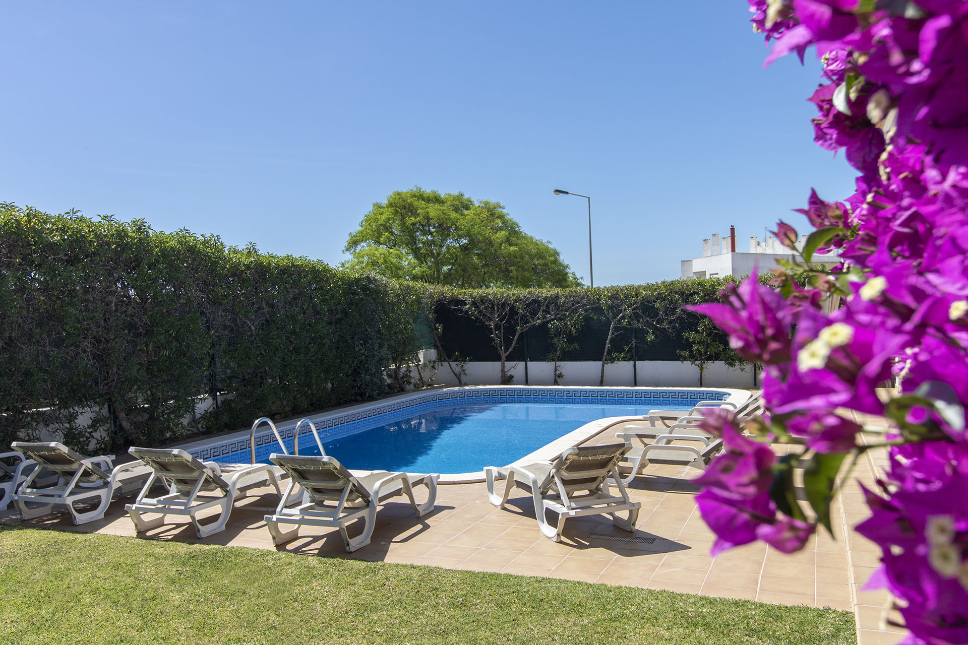 No exterior encontra um jardim com piscina de boas dimensões e uma zona de BBQ com mesa de refeição.