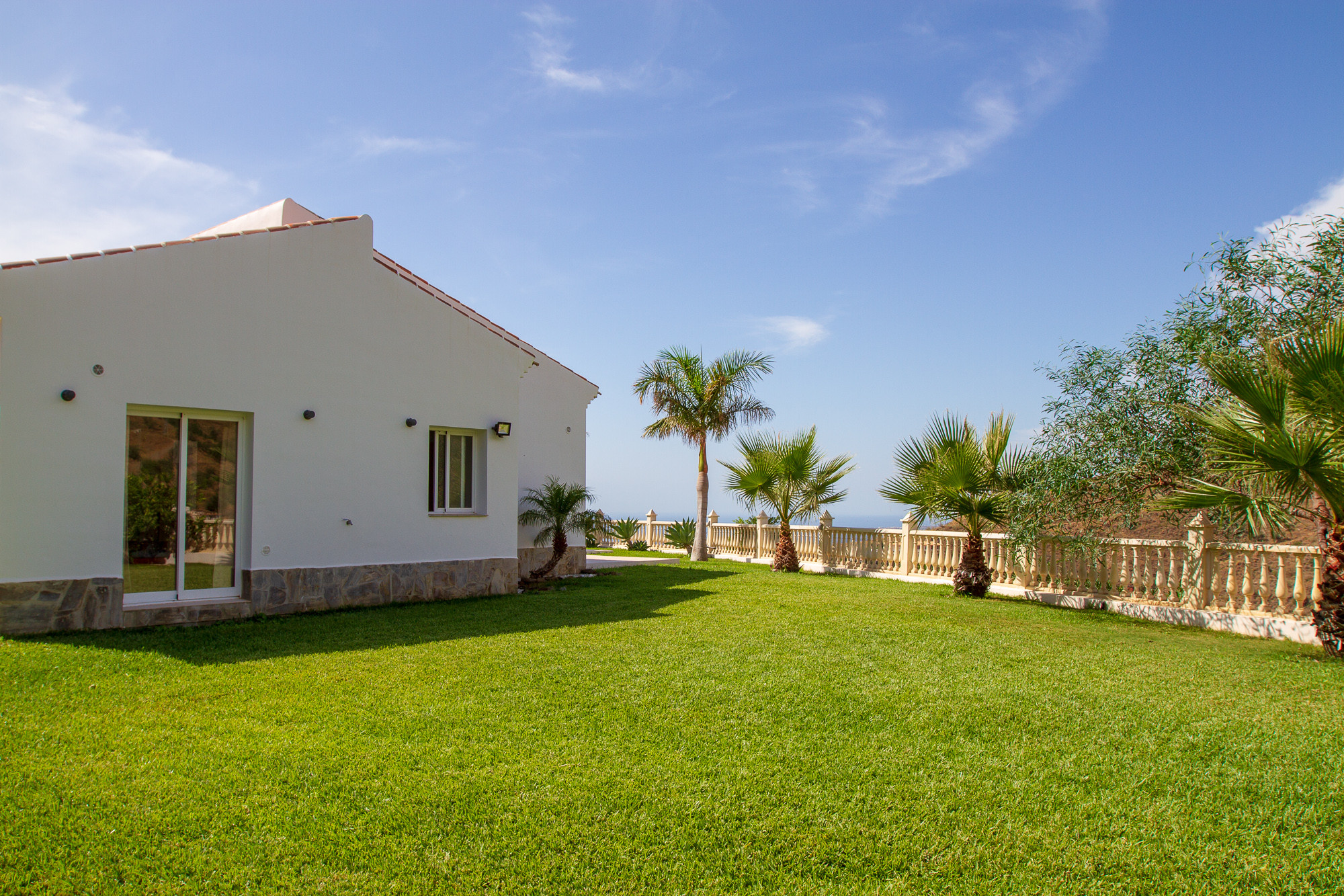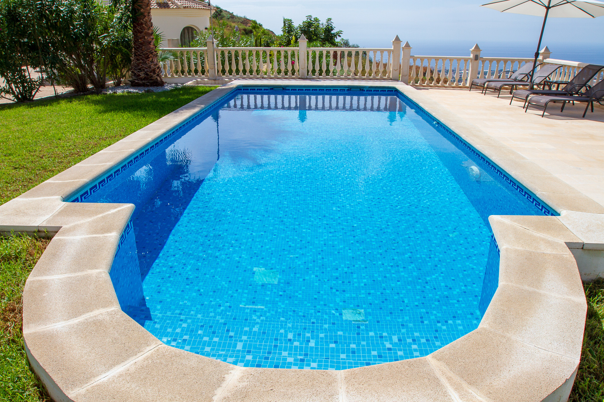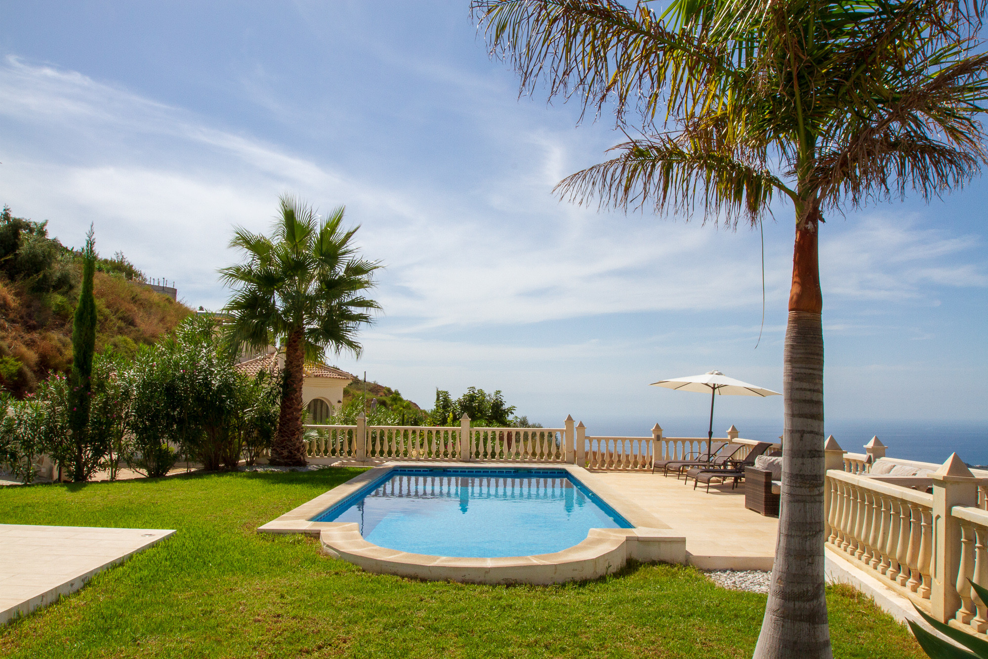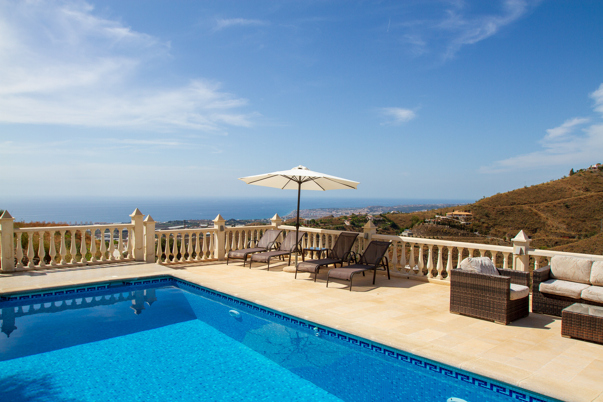 The large stone terrace is nicely furnished with several dining tables and chairs, loungers with drinks tables, umbrellas, outdoor sofa, etc. The view is magnificent over both the beautiful Andalucian mountains and the Mediterranean Sea.