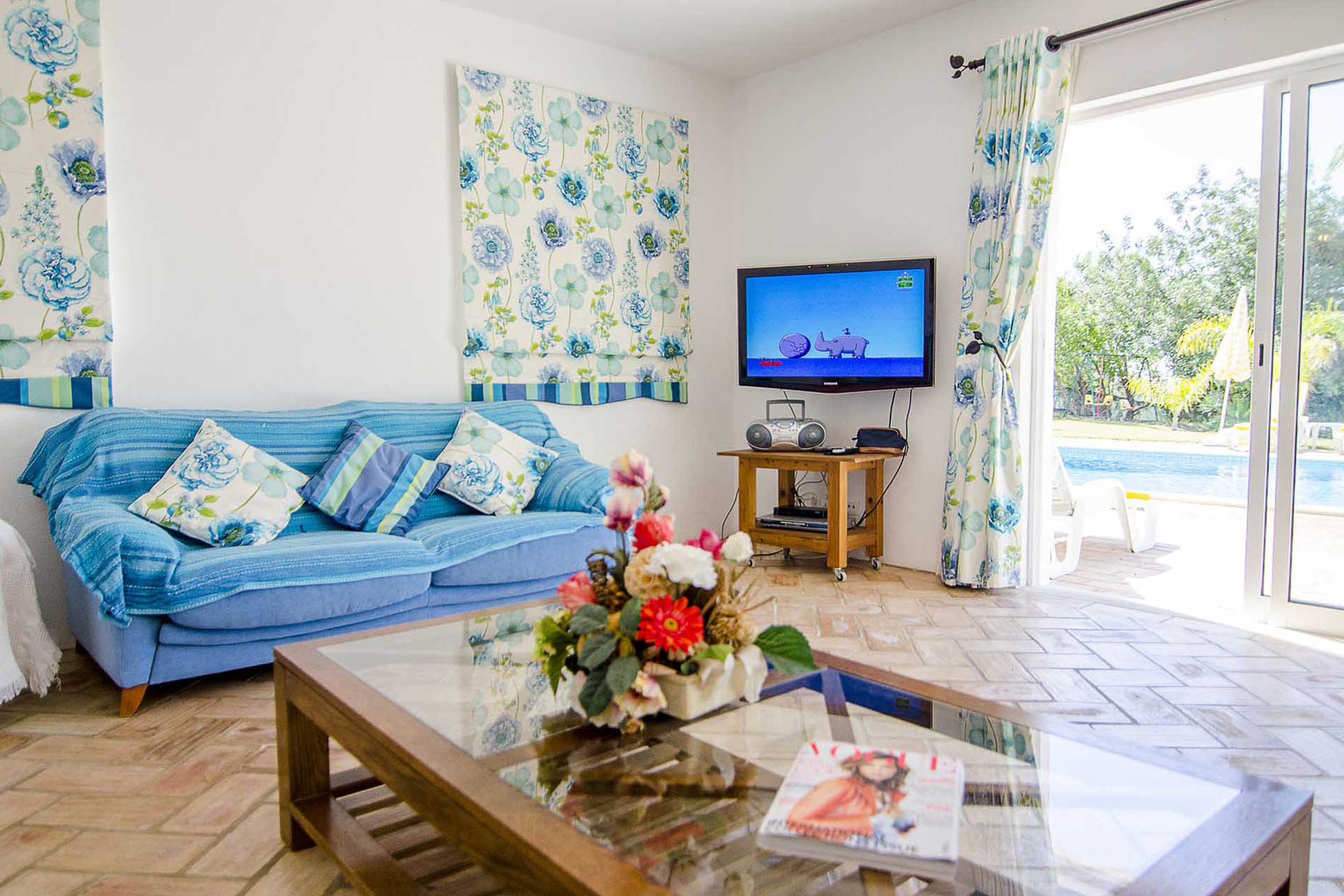 A sala de jantar está logo a seguir à cozinha e um pouco mais à frente, a sala de estar que se posiciona em frente da piscina e é bastante espaçosa e luminosa. Conta com um pequeno bar e uma casa de banho de apoio.