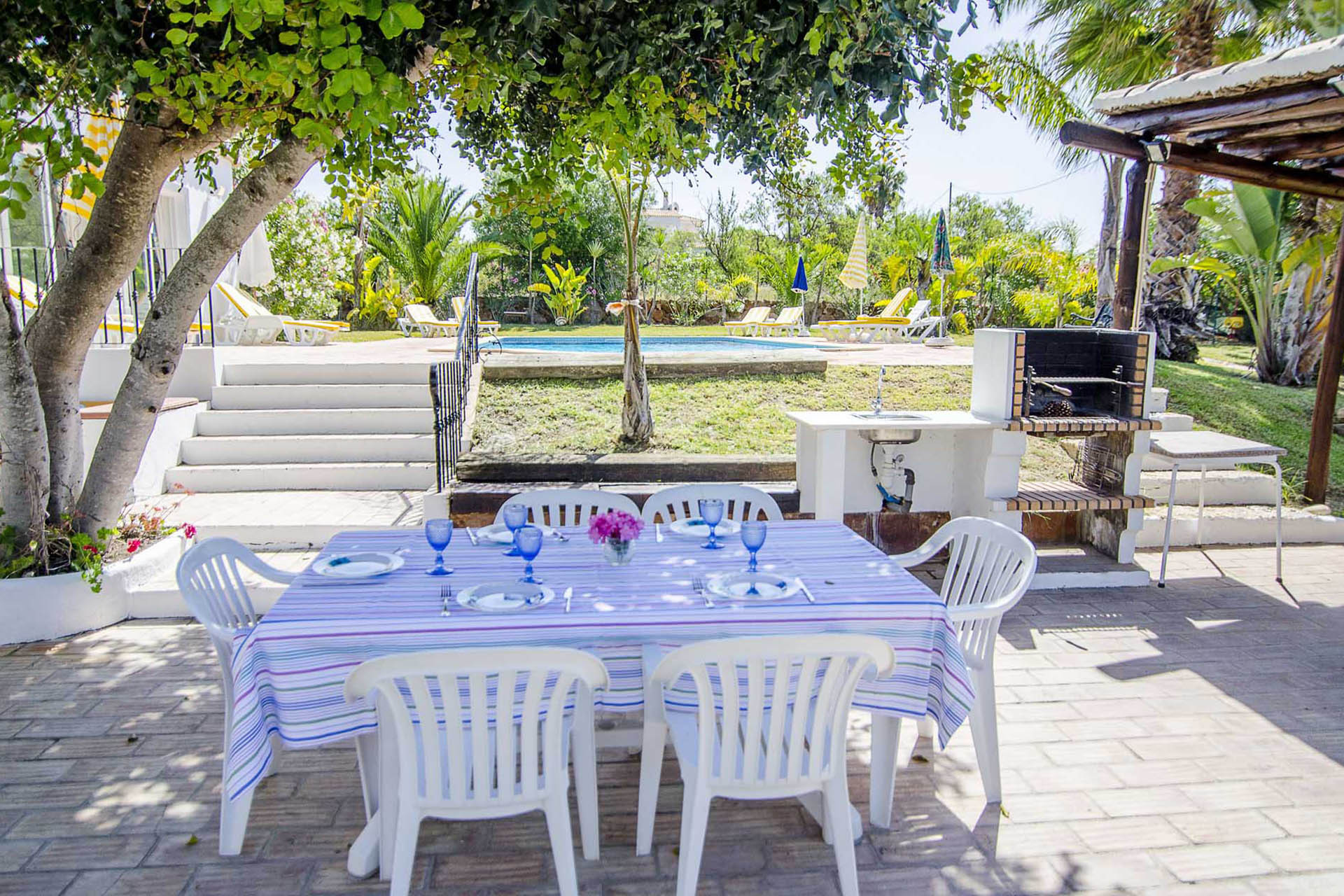 Temos uma zona de refeições sombreada por uma pérgula rustica, localizada a meio do jardim e perto do prático barbecue a carvão.